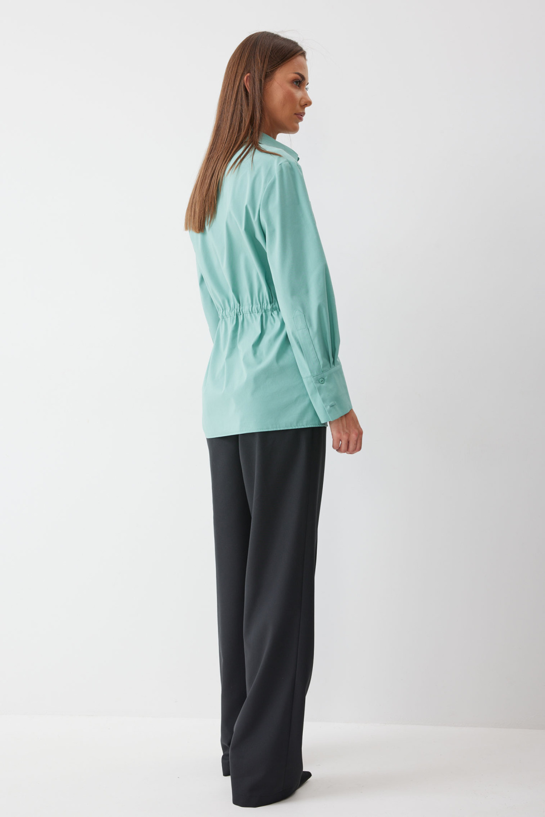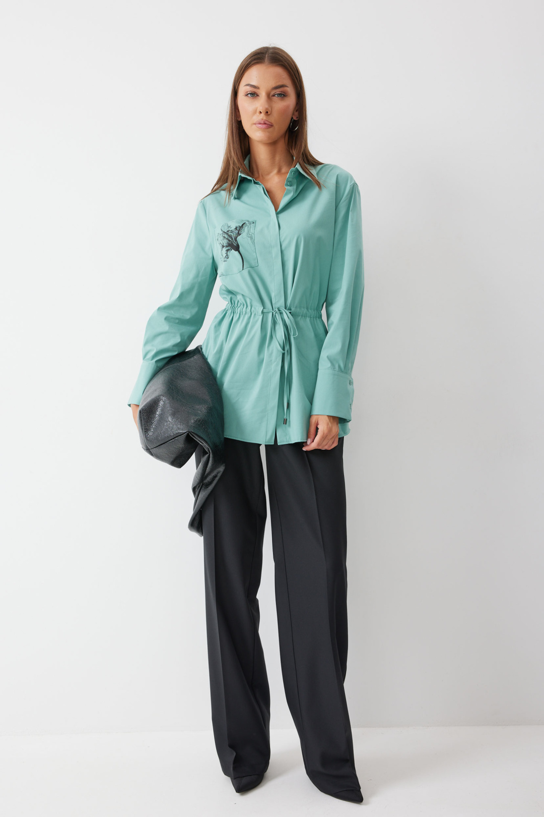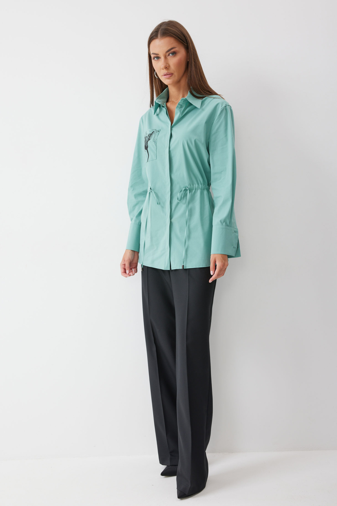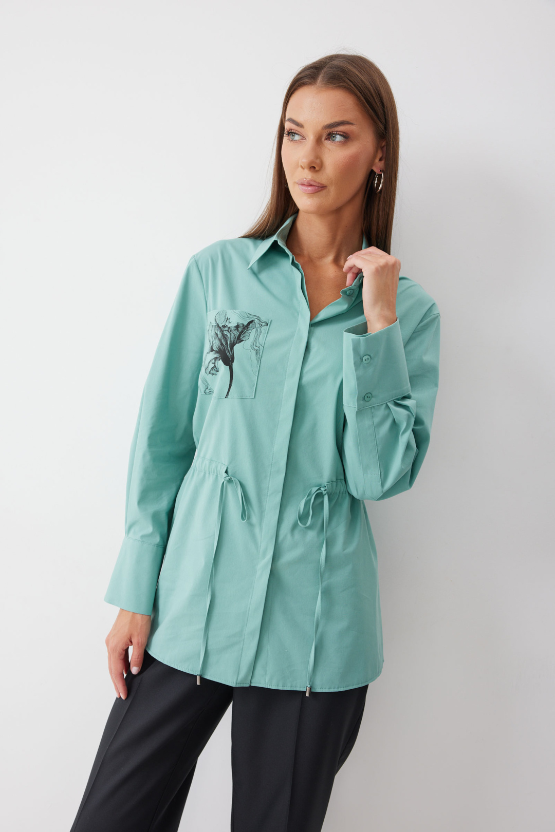 Блузка полуприлегающего силуэта. На уровне талии расположена кулиска с и завязками для регулирования степени прилегания. По центру супатная застежка, воротник рубашечный стояче-отложной. Рукав втачной. В верхней части полочки расположен накладной карман с дизайнерской печатью.