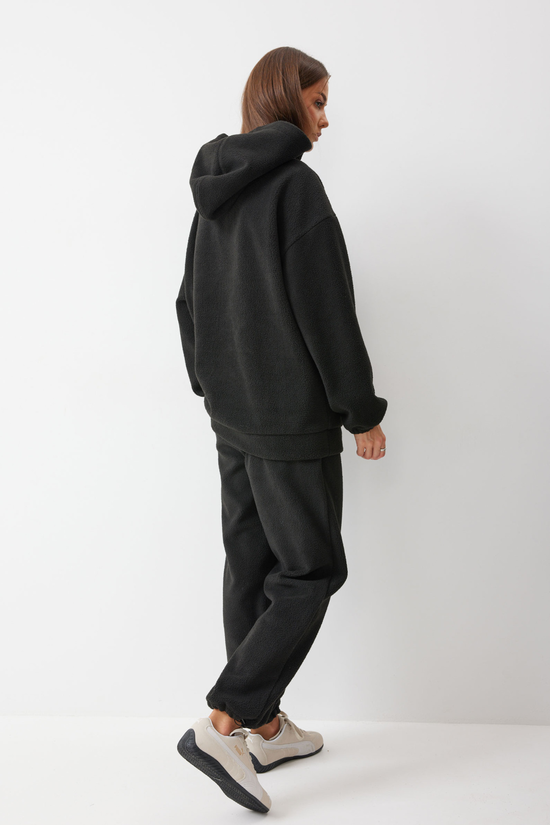 Джемпер прямого силуэта из комфортного трикотажного полотна. Горловина обработана капюшоном. Рукав со спущенной линией плеча, по низу на резинке. По низу джемпера притачной пояс. По переду декоративная нашивка и шнур.