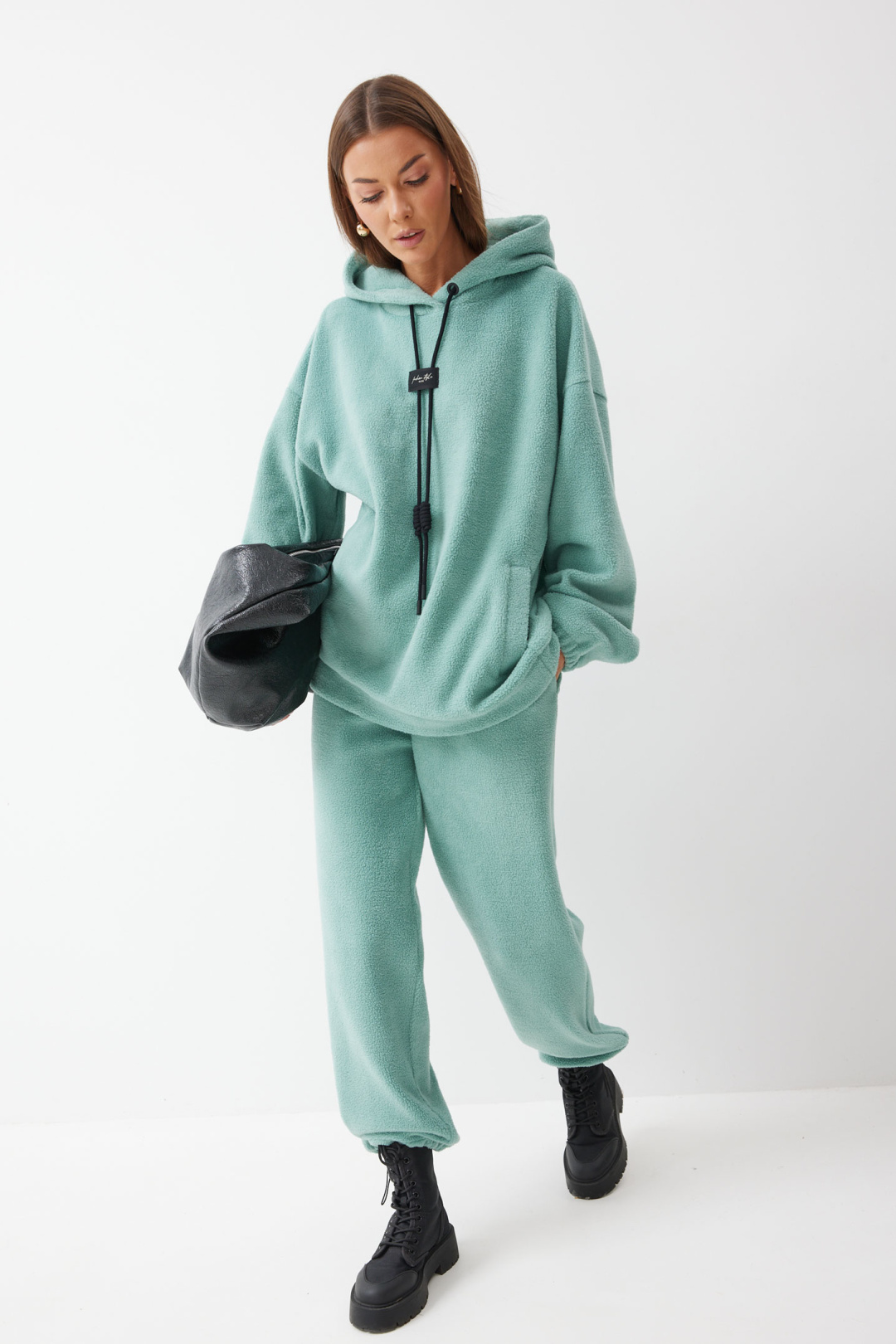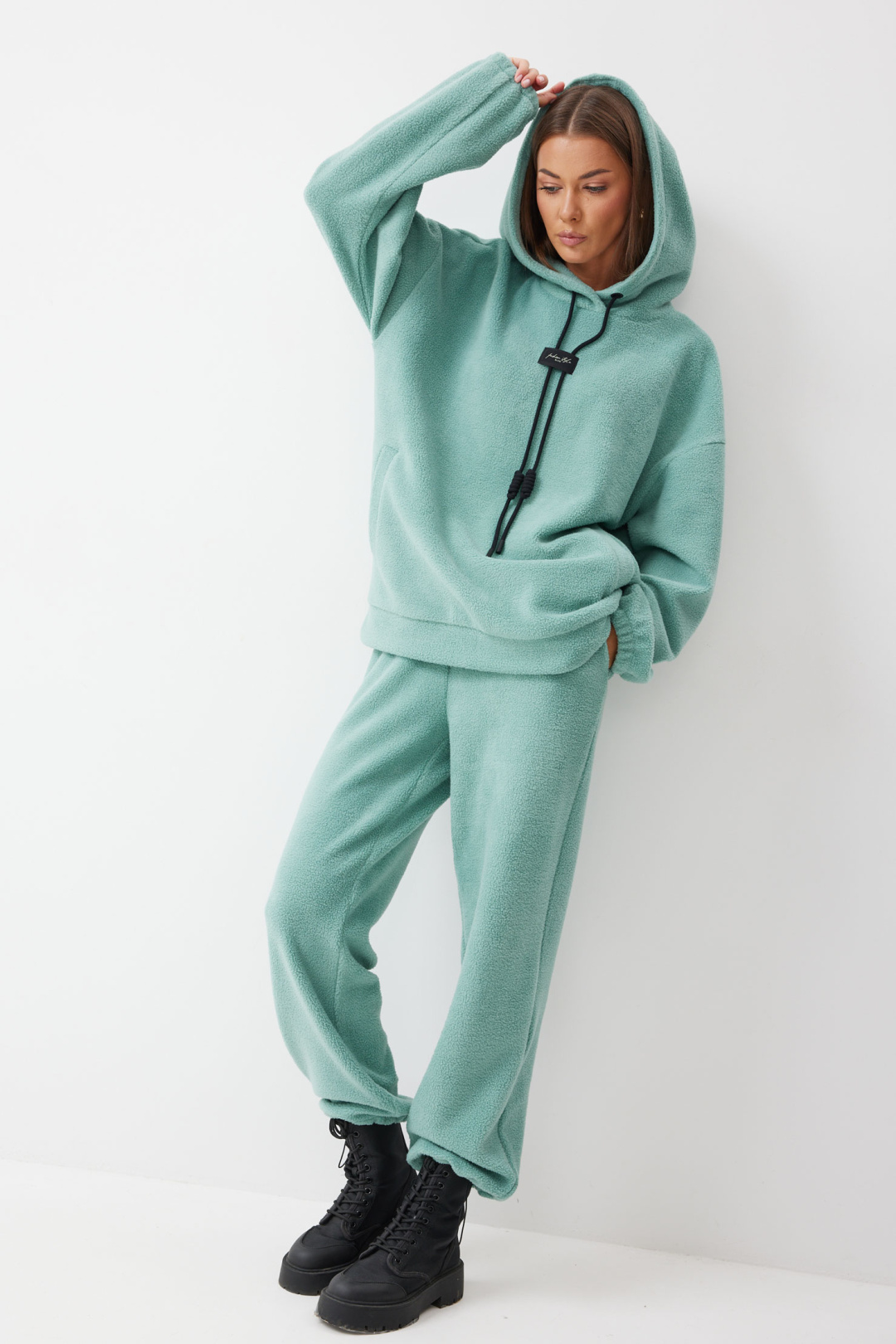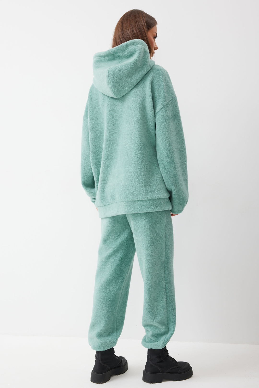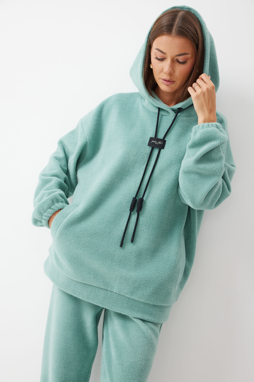 Джемпер прямого силуэта из комфортного трикотажного полотна. Горловина обработана капюшоном. Рукав со спущенной линией плеча, по низу на резинке. По низу джемпера притачной пояс. По переду декоративная нашивка и шнур.