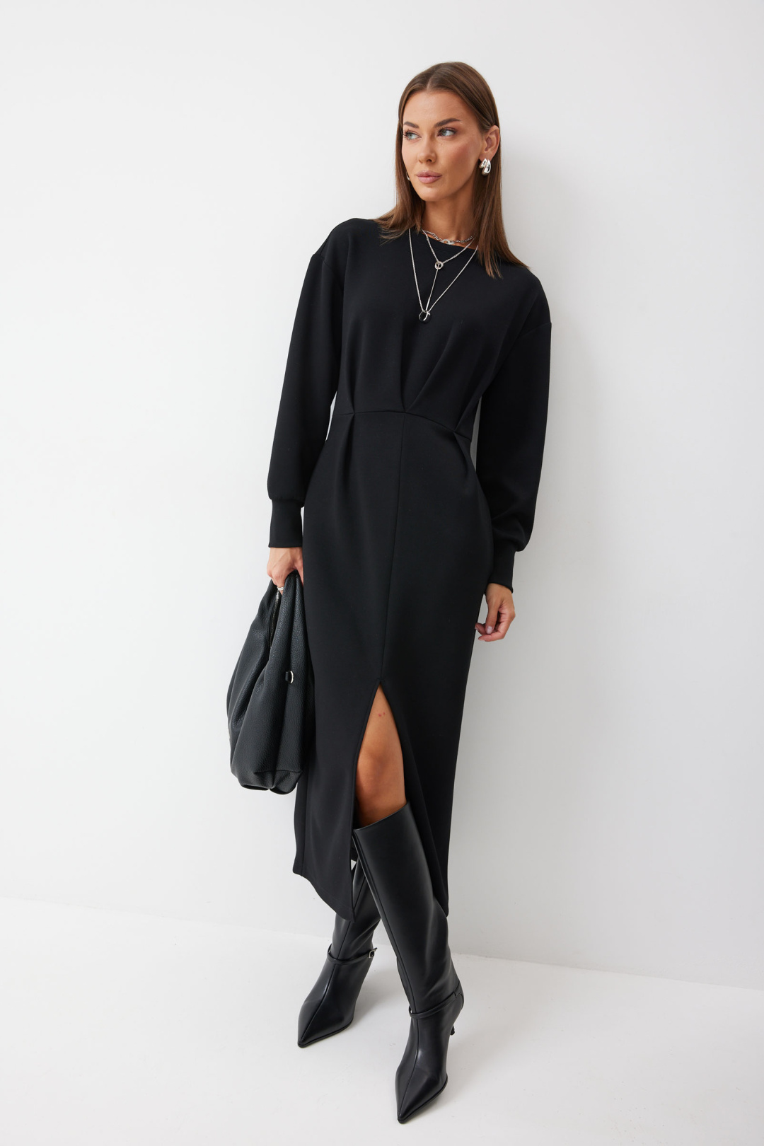 Платье полуприлегающего силуэта из трикотажного полотна. Горловина округлая. Рукав со спущенной линией плеча по низу манжета. Платье отрезное по линии талии. По переду на талии складки. В боковом шве функциональные карманы. В центральном шве юбки разрез.
