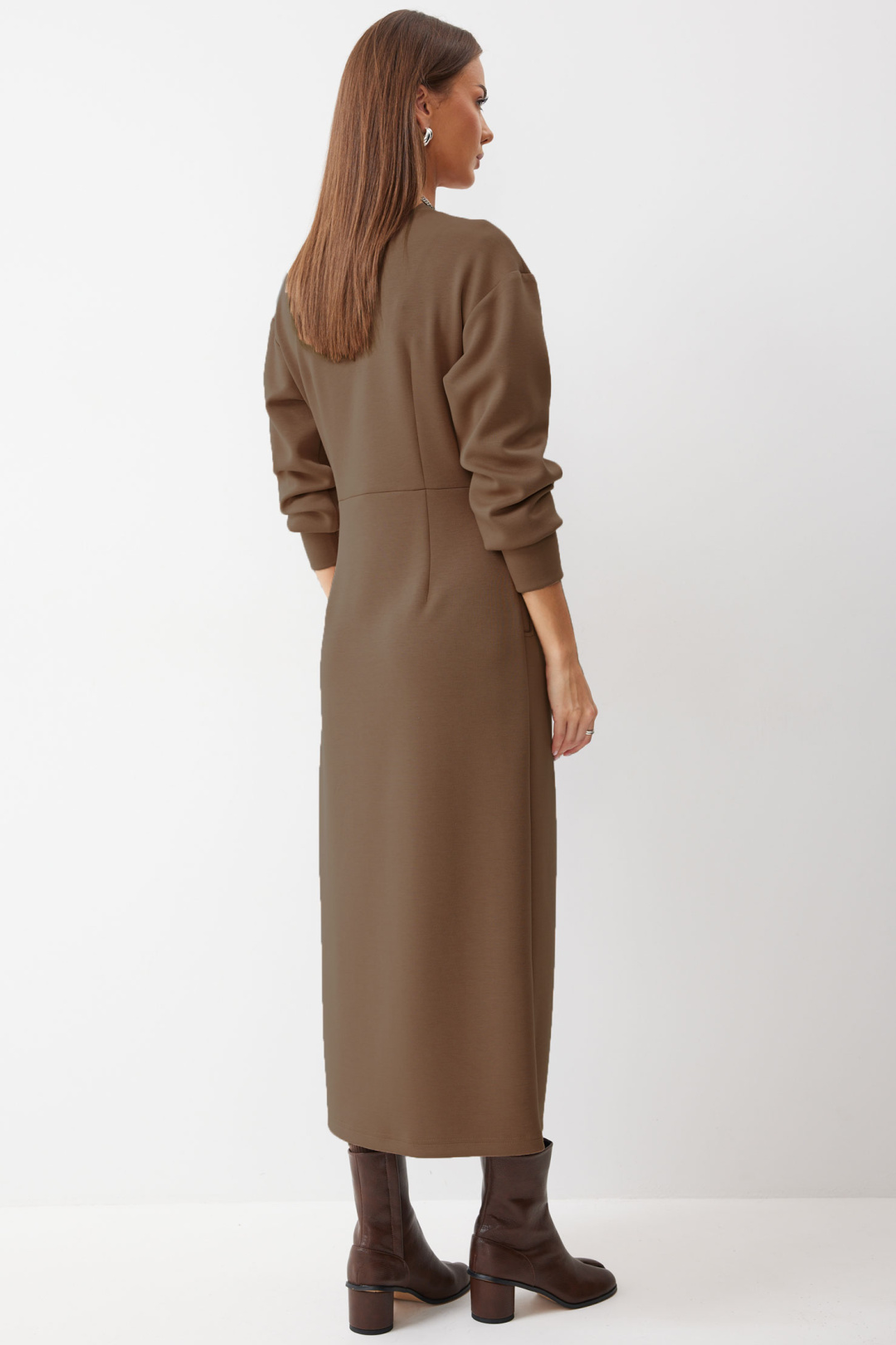 Платье полуприлегающего силуэта из трикотажного полотна. Горловина округлая. Рукав со спущенной линией плеча по низу манжета. Платье отрезное по линии талии. По переду на талии складки. В боковом шве функциональные карманы. В центральном шве юбки разрез.