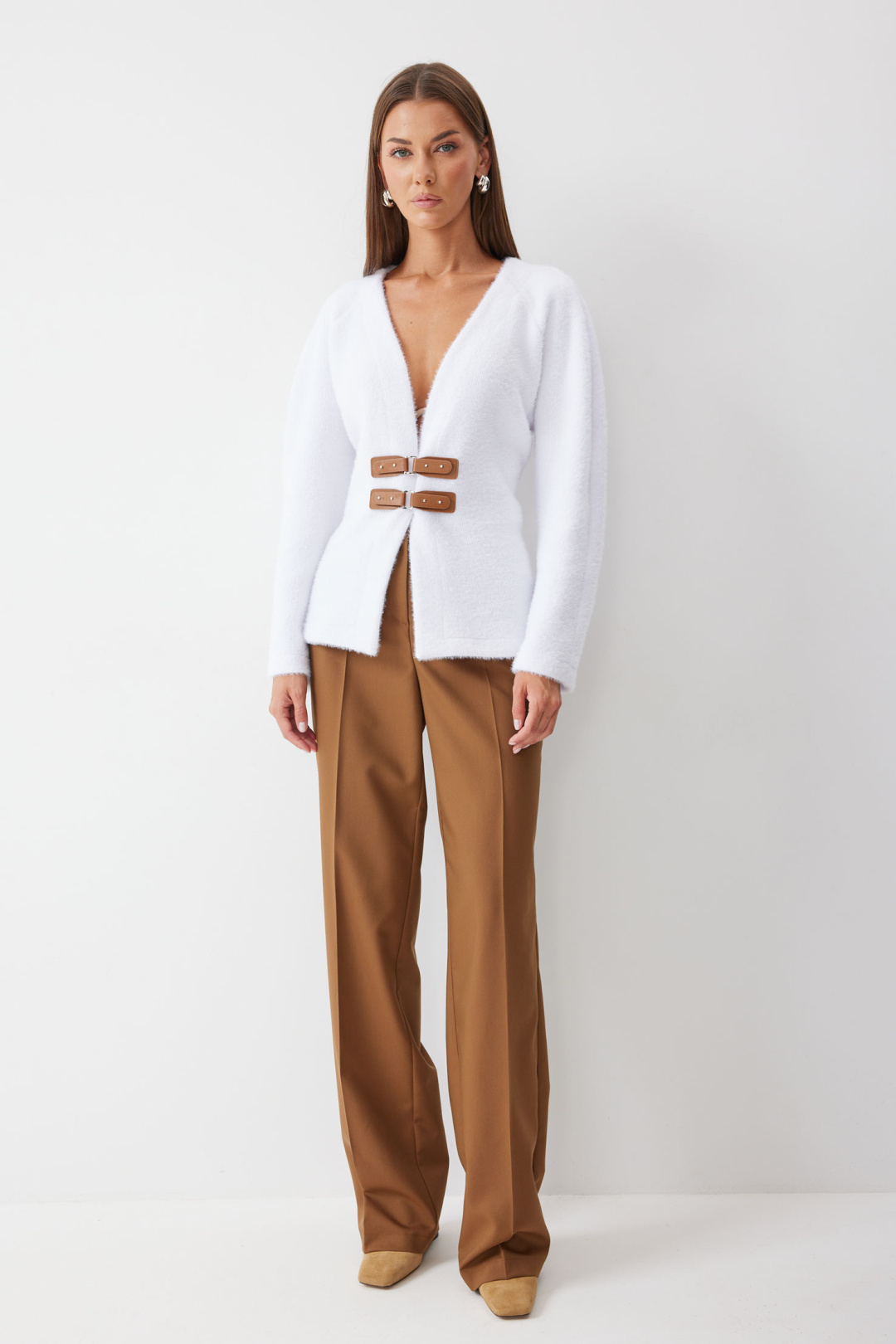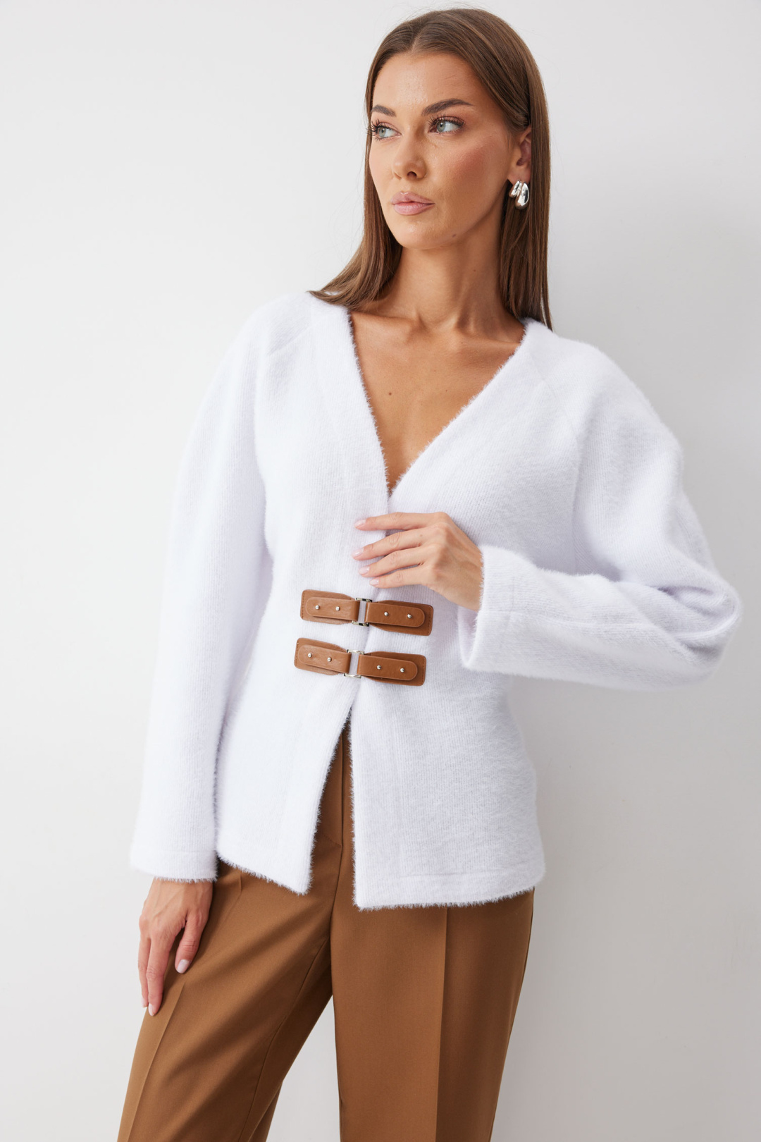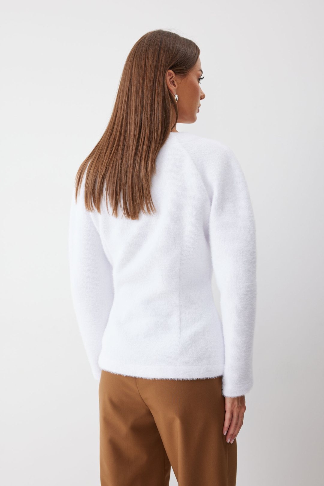 Джемпер полуприлегающего силуэта из трикотажного пушистого полотна. V-образная горловина, рукав реглан. По переду джемпера расположены пряжки. На спинке расположены вытачки, для придания силуэта.
