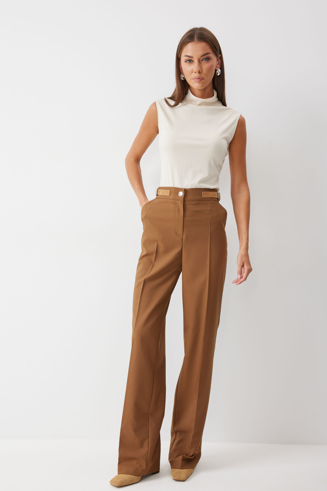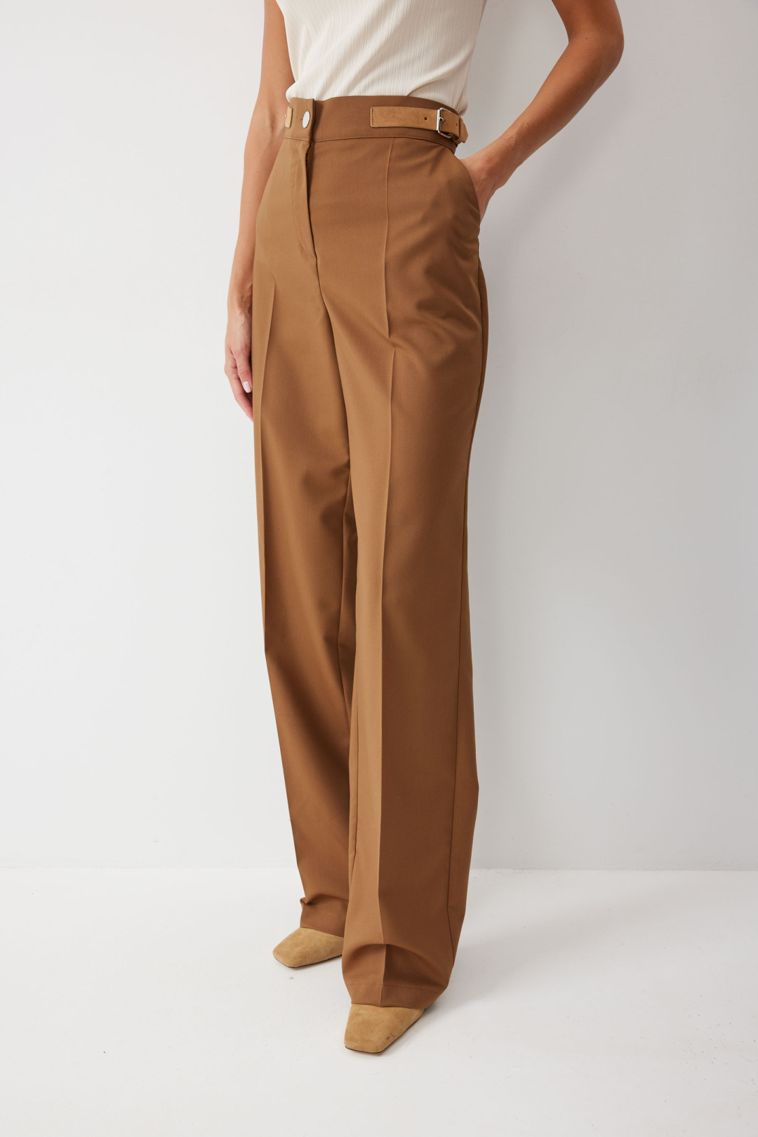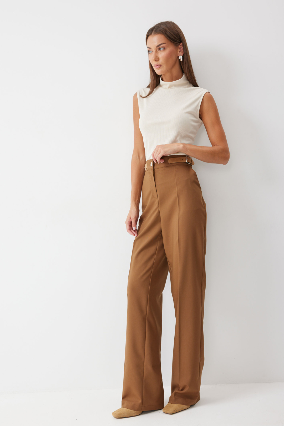 Брюки прямого силуэта из костюмной ткани. По верху брюк притачной пояс с застежкой на петлю и пуговицу, по верху пояса ,на боковых швах, расположены декоративные пряжки. На передних половинках обработаны карманы и застежка молния в среднем шве. На задних половинках вытачки. По поясу задних половинок брюк резинка.