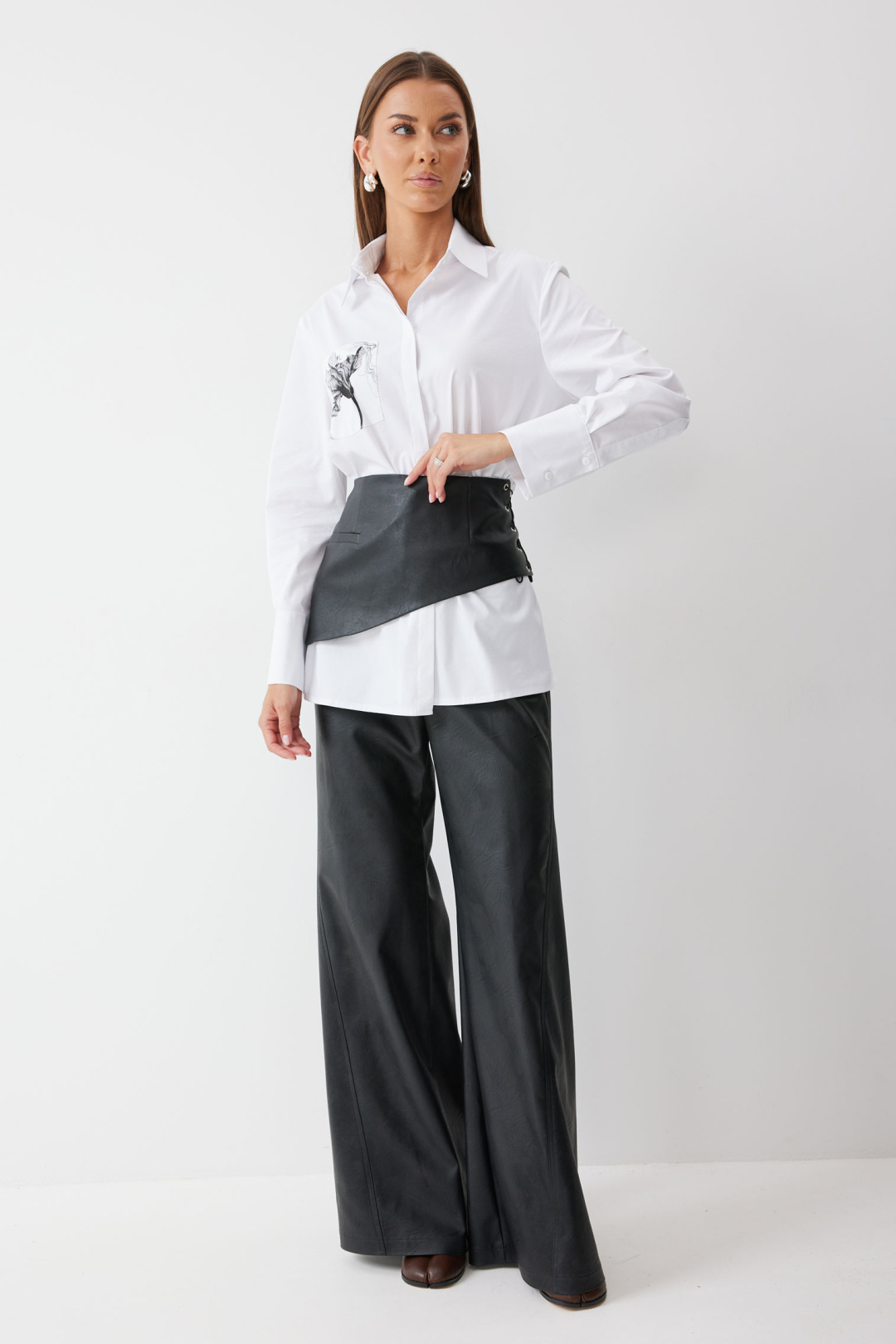Блузка полуприлегающего силуэта. На уровне талии расположена кулиска с и завязками для регулирования степени прилегания. По центру супатная застежка, воротник рубашечный стояче-отложной. В верхней части полочки расположен накладной карман с дизайнерской печатью. Рукав втачной. Блузку дополняет съёмная деталь в виде баски из эко кожи, с шнуровкой в боковом шве.
