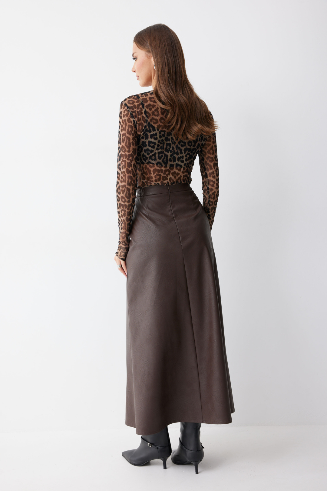 Юбка А-силуэта из экокожи на хлопковой основе. По верху юбки притачной пояс со шлевками для ремня. Переднее полотнище юбки со складками и шлицей и декоративной фурнитурой. На задних половинках расположены талиевые вытачки. На спинке в центральном шве потайная молния. По бокам в поясе вставлена резинка от складки до вытачки.