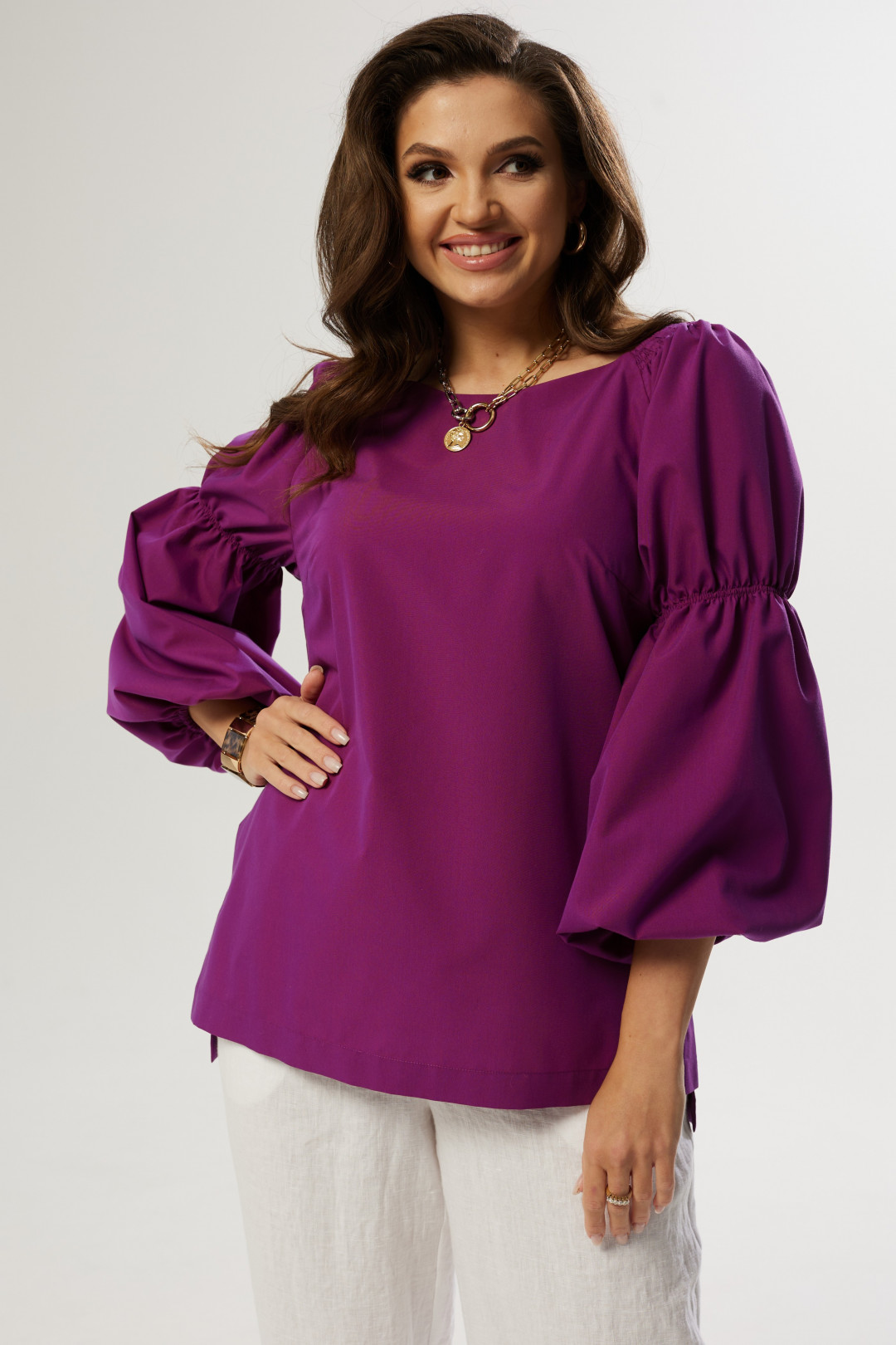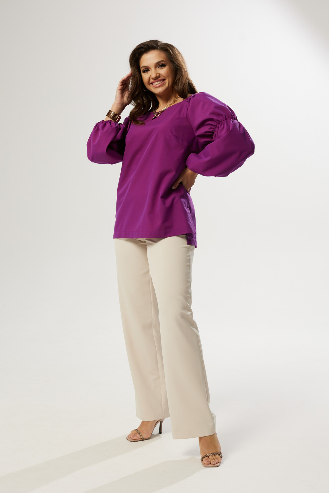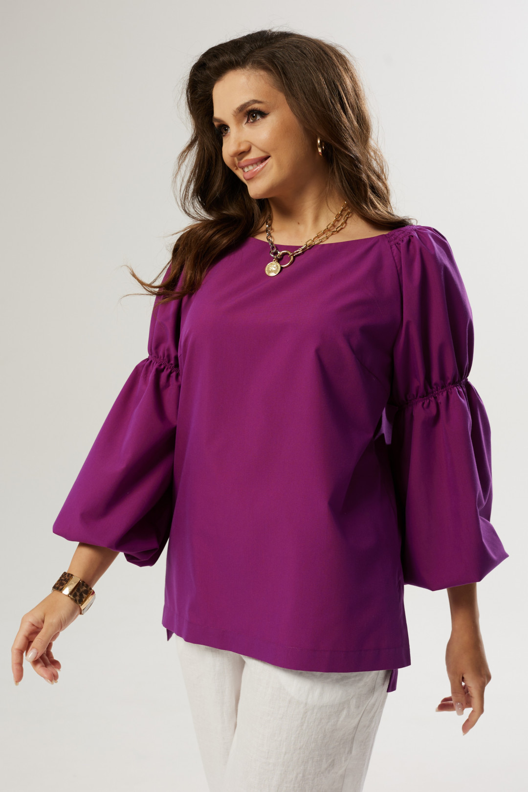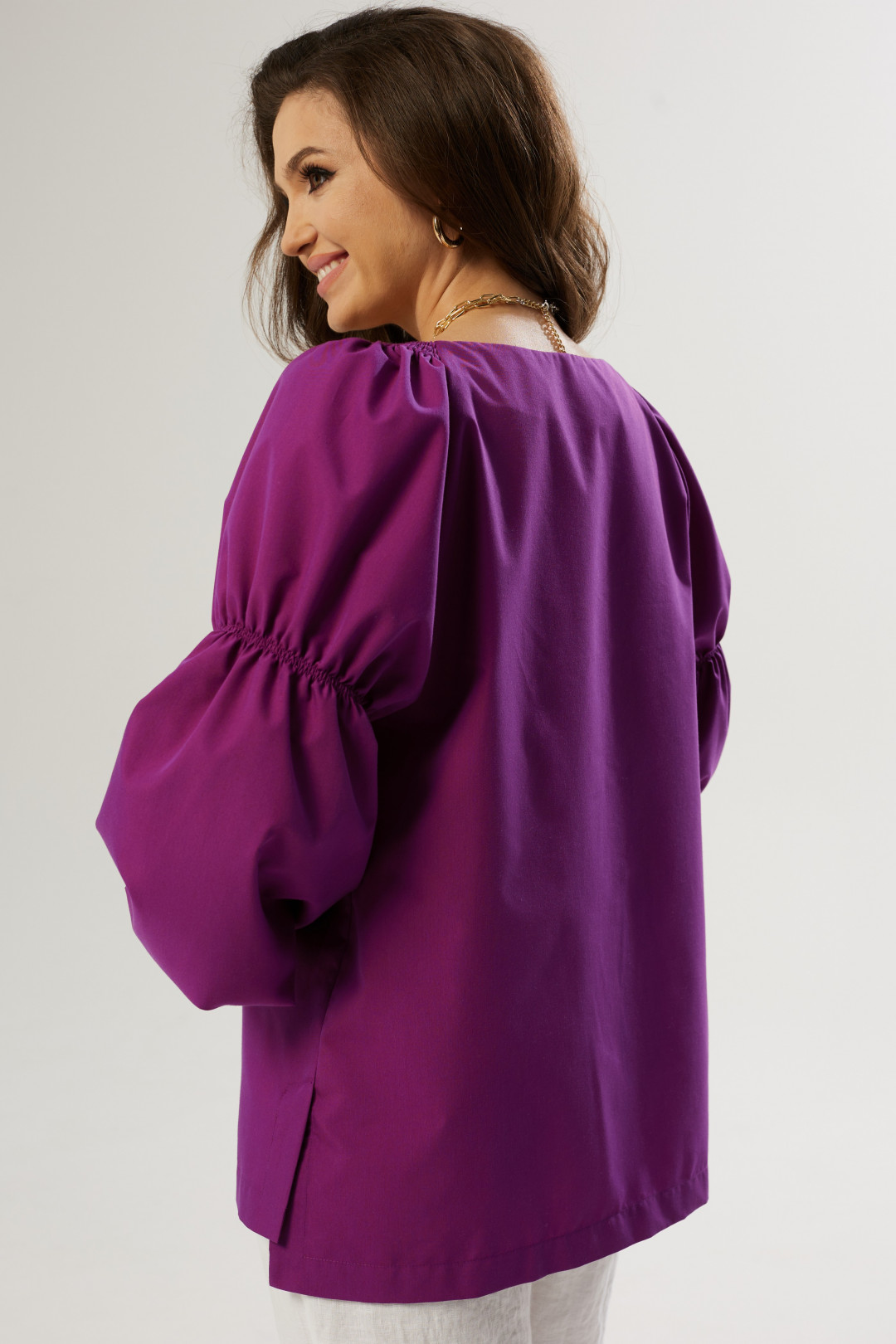 Блуза свободного силуэта, рукав реглан, в рукаве на плече, выше локтя и по низу резинка. Передняя часть короче спинки и в боковых швах обработаны шлицы. Горловина лодочка.