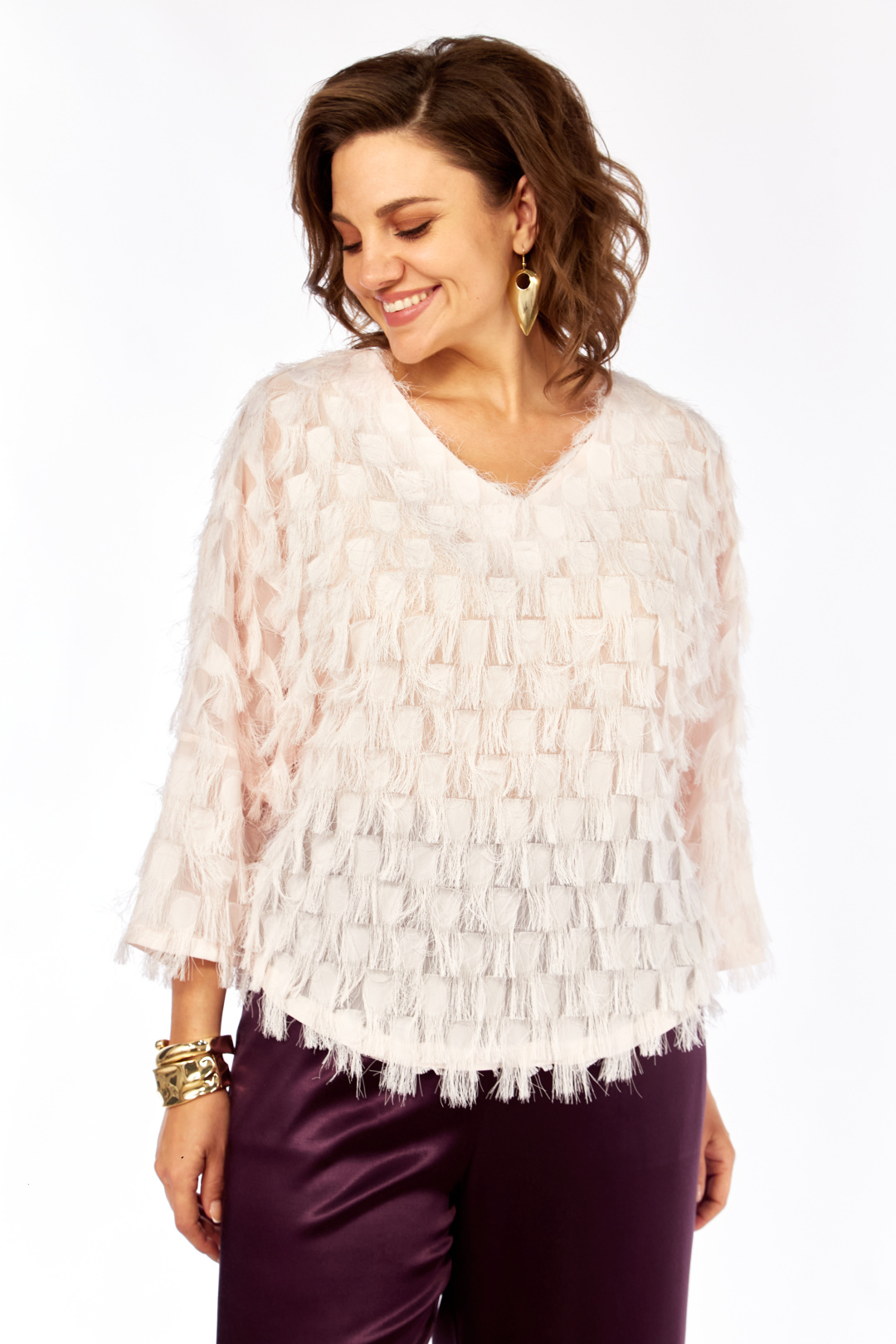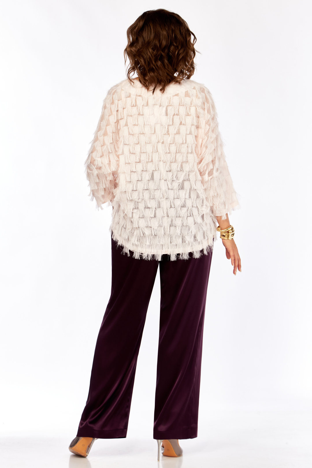 Комплект женский 2-х предметный, состоящий из брюк и блузки. Брюки-палаццо, карманы в боковых швах, отрезной пояс с резинкой по спинке. Блузка свободного силуэта с V-образным вырезом горловины по переду. Рукав летучая мышь. Спинка со средним швом, спинка длиннее переда.