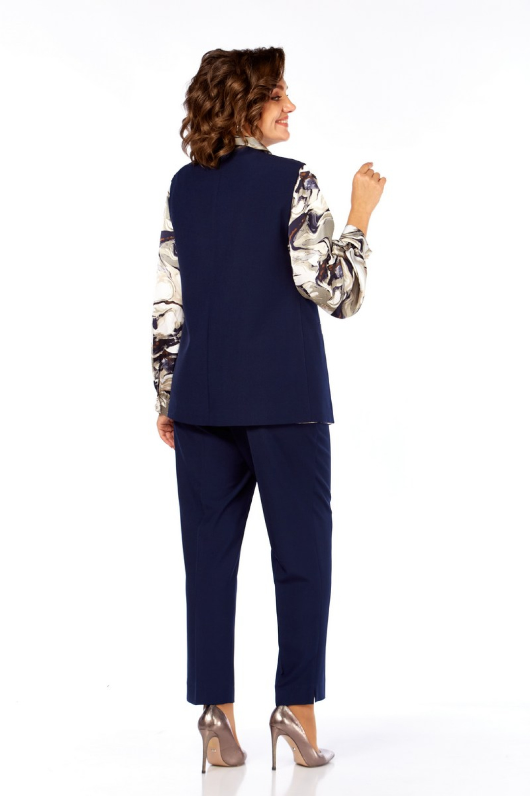 Любую деталь комплекта можно носить по отдельности, сочетая с вещами в вашем гардеробе. Жилет: длина по спинке – 70 см. Длина брюк по боковому шву – 100 см.