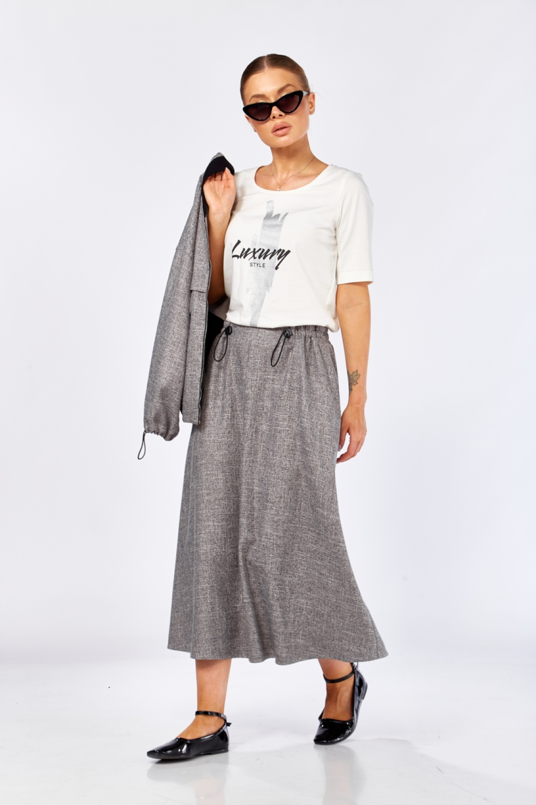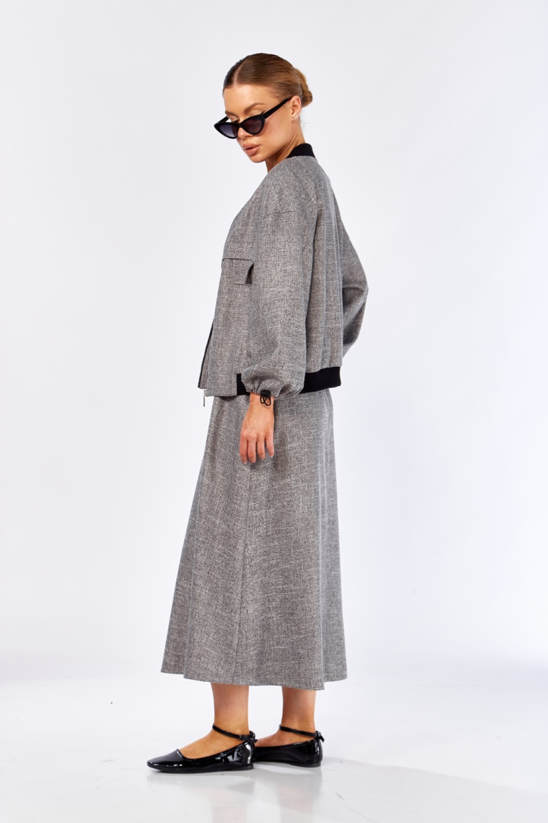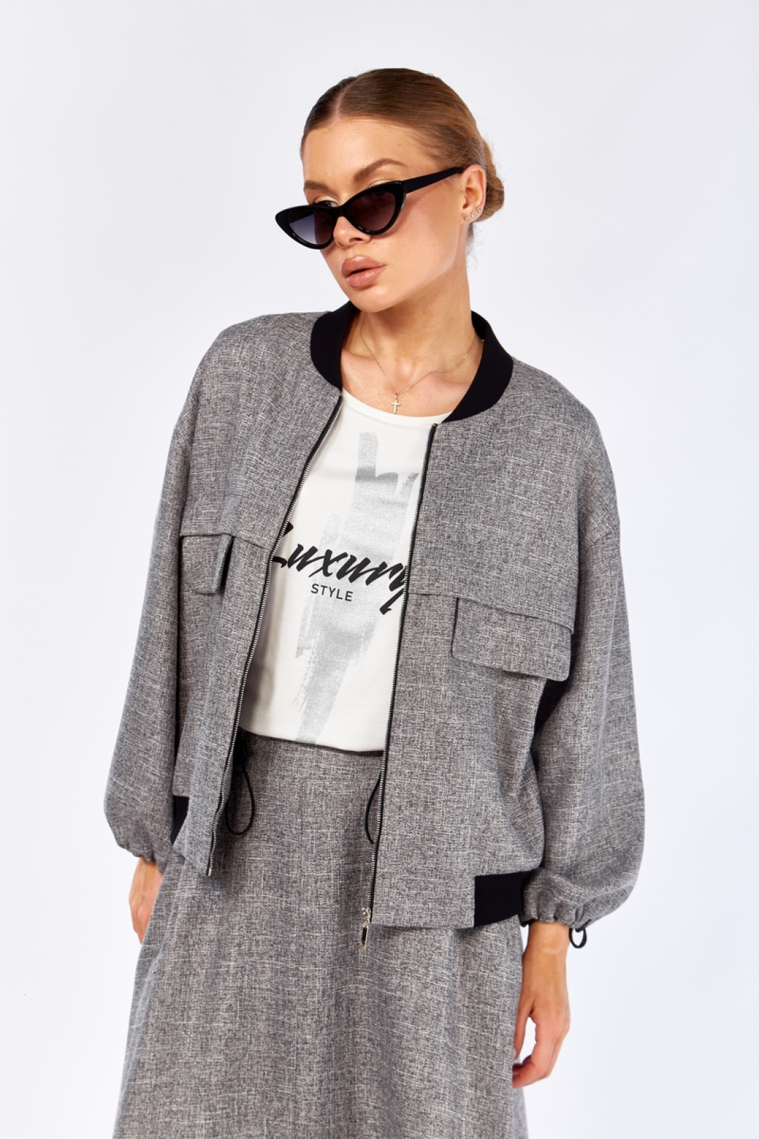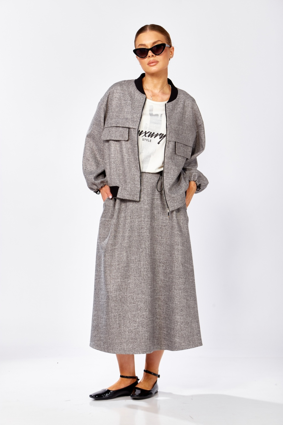 Комплект женский состоящий из 3-х предметов: бомбер, юбка и майка. Бомбер с застежкой на тесьму-молнию. Горловина и низ изделия обработаны трикотажной резинкой (кашкорсе). По переду декоративные подрезы с декоративными клапанами. Плечо спущенное, низ рукава стягивается на декоративную резинку с фиксаторами и карманами в боковых швах. Юбка А-образного силуэта, имеет боковые карманы в швах. Пояс на резинке, с добавлением декоративной резинки с фиксаторами. Майка полуприлегающего силуэта с нагрудными выточками. Горловина и проймы оформлены бейкой. На полочке имеется декоративная печать. Бомбер: длина по спинке – 53 см, длина рукава от горловины – 48 см. Юбка: длина - 81 см. Майка: длина по спинке – 55 см, длина рукава – 28 см.