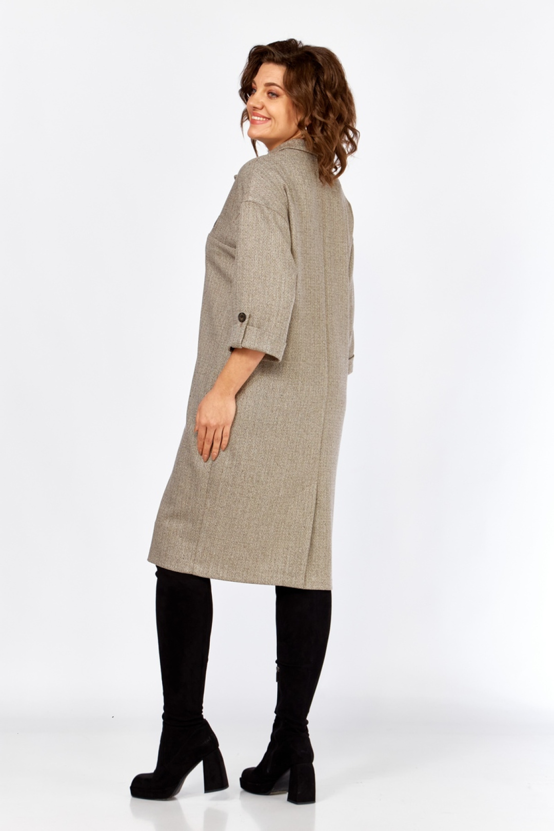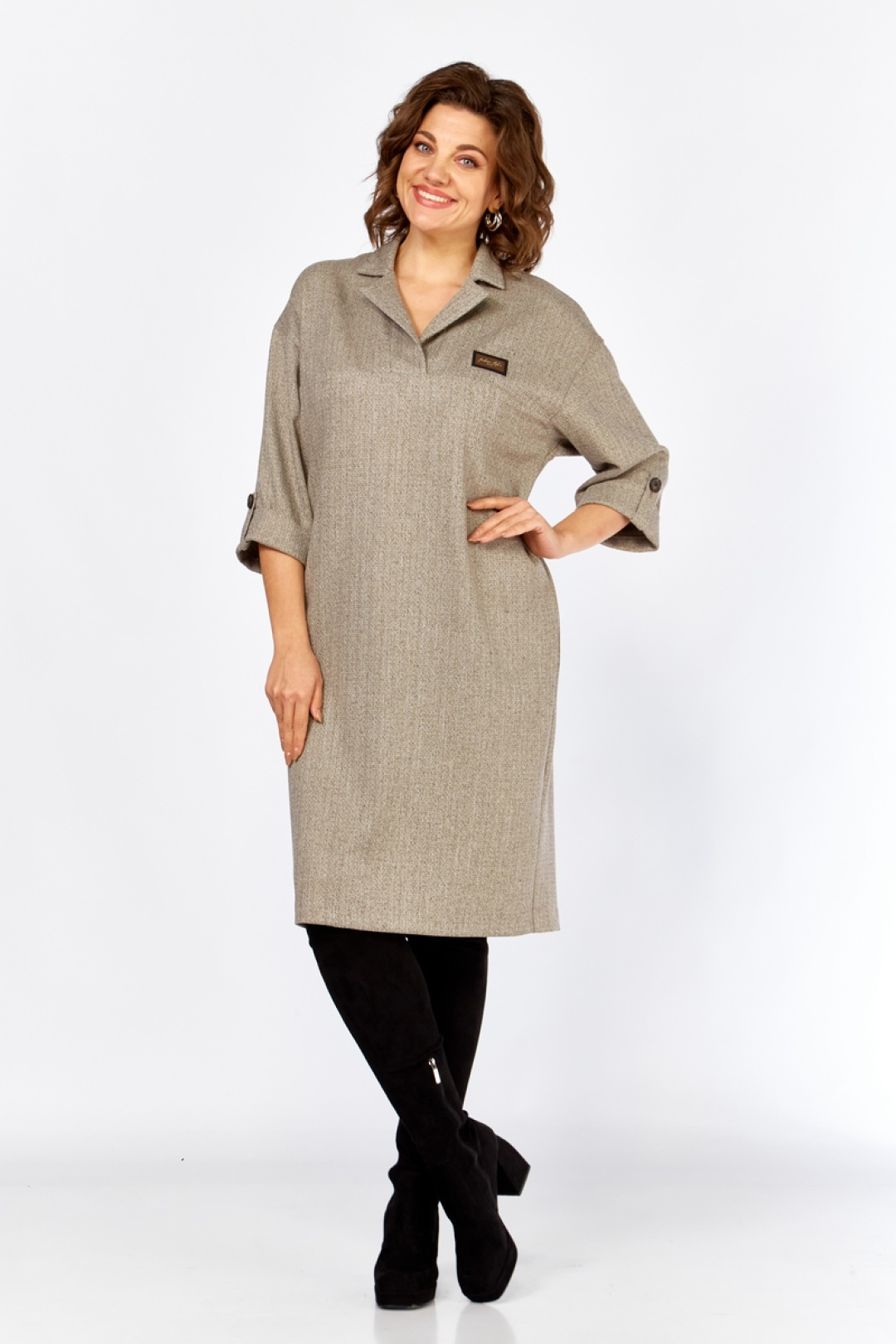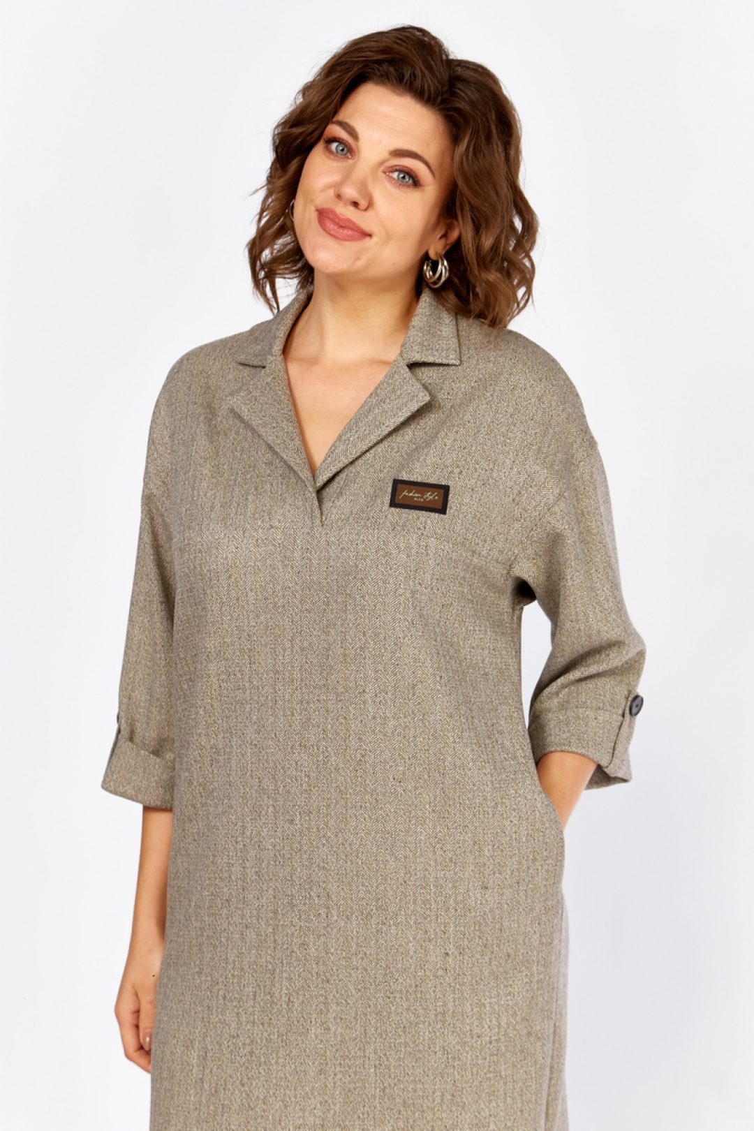 Платье полуприлегающего силуэта, длины миди, без подкладки. На полочке обработана отрезная кокетка, воротник отложной, пиджачного типа. Плечи изделия приспущены, рукава укорочены и заканчиваются манжетой, по низу пришит декоративный элемент (в виде паты), свободный край которого закреплен к рукаву пуговицей. Слева на груди – декоративный пришивной элемент (нашивка). По спинке шов, который заканчивается шлицей, для удобства при ходьбе. В боковых швах обработаны карманы-хулиганы. Длина по спинке - 101 см, длина рукава от горловины - 63 см