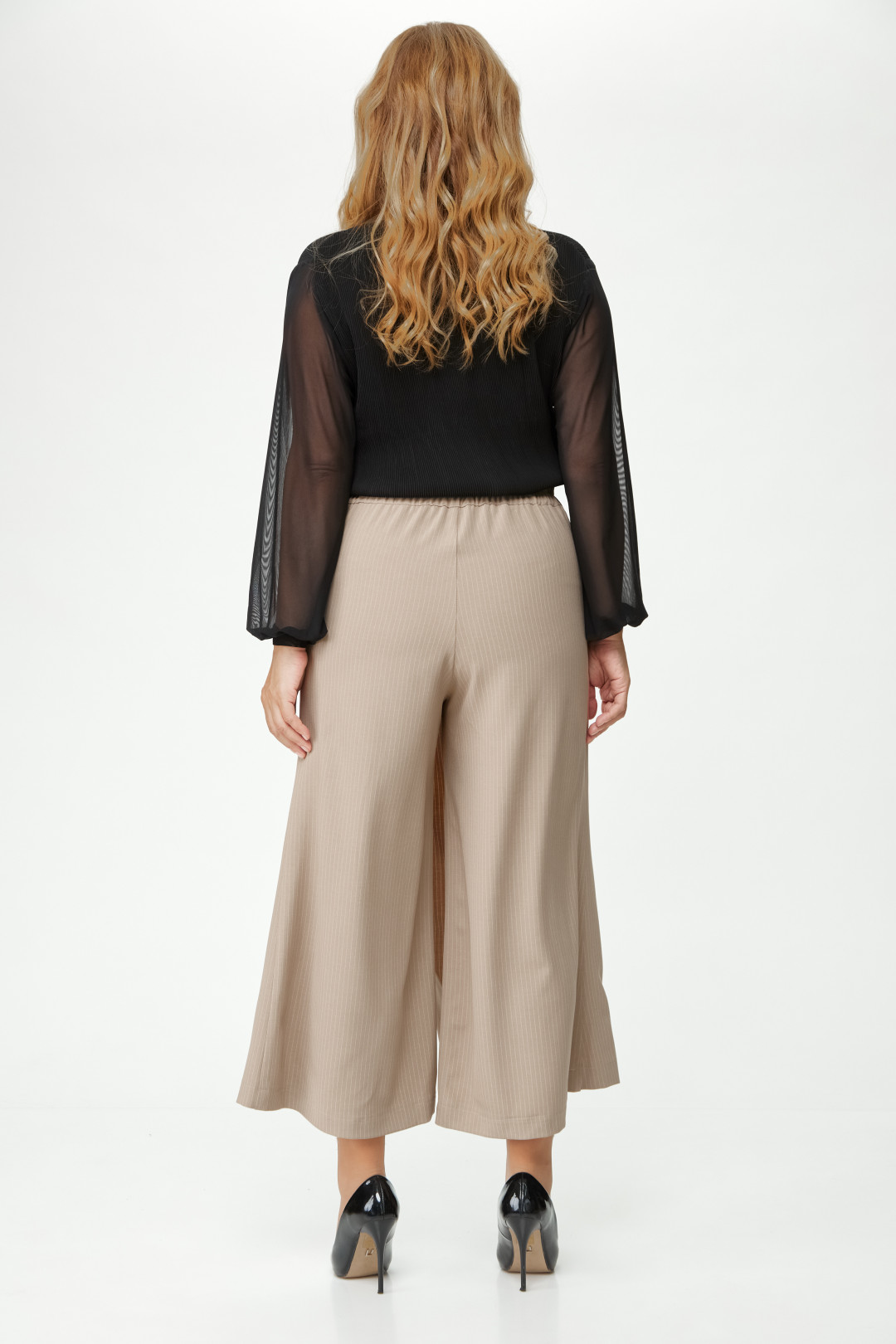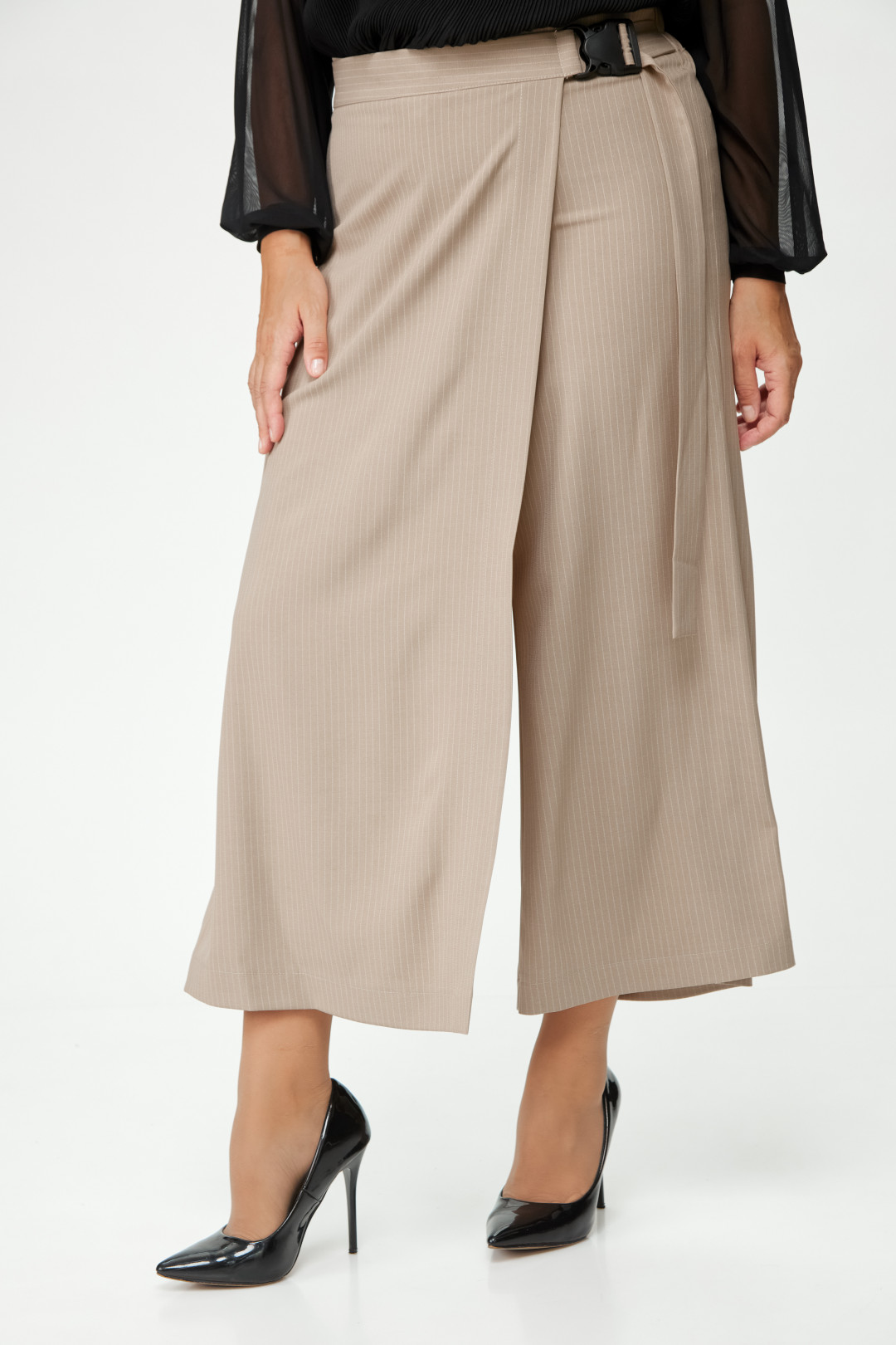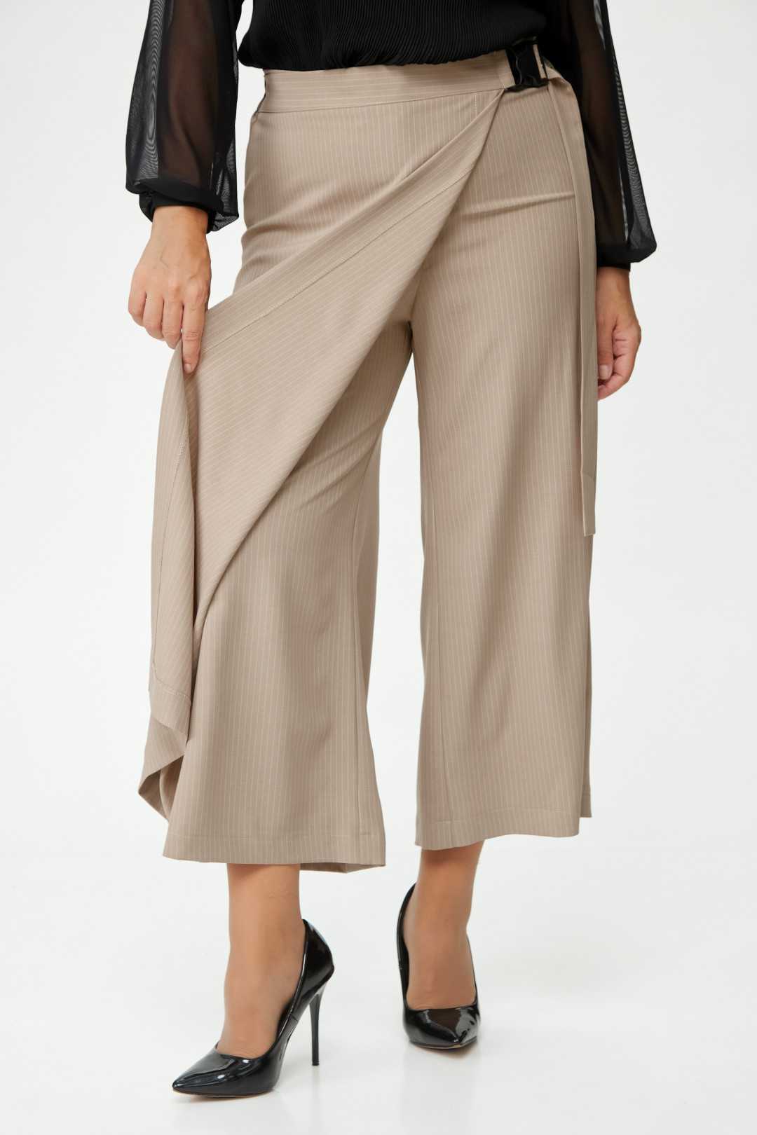 Модные брюки-кюлоты с элегантным запахом, свободной посадки, брючины широкие укороченные, чуть выше щиколотки. По переду молния, сзади по поясу вставлена резинка, запах фиксируется поясом на пряжке. С данными брюками можно смело создавать стильные комбинации с вещами Вашего гардероба. Длина брюк по боковому шву 94 см, шаговому — 60 см. Изделие подойдет на рост 170 см.