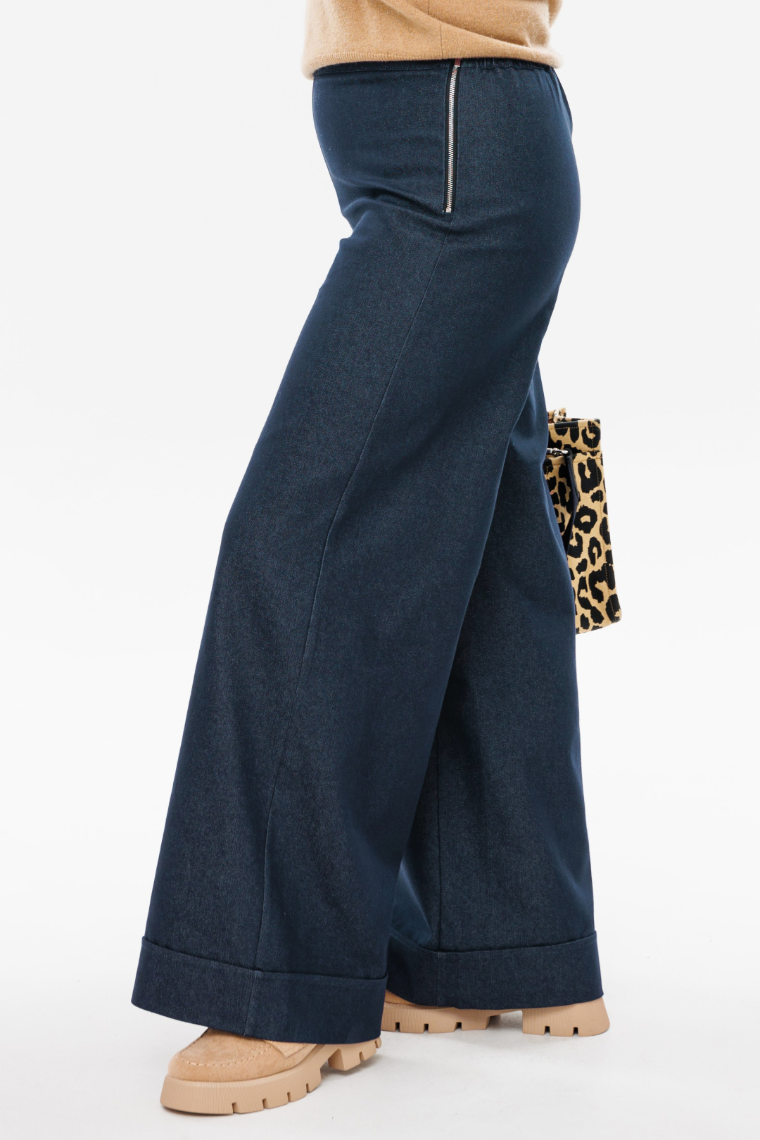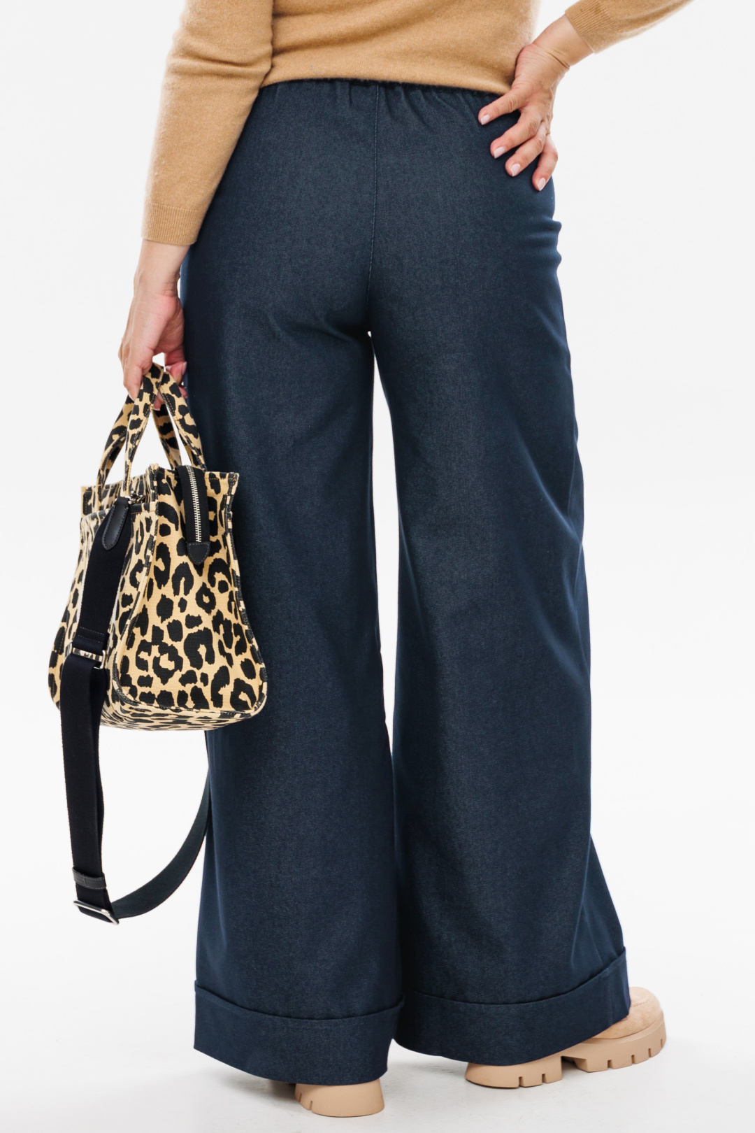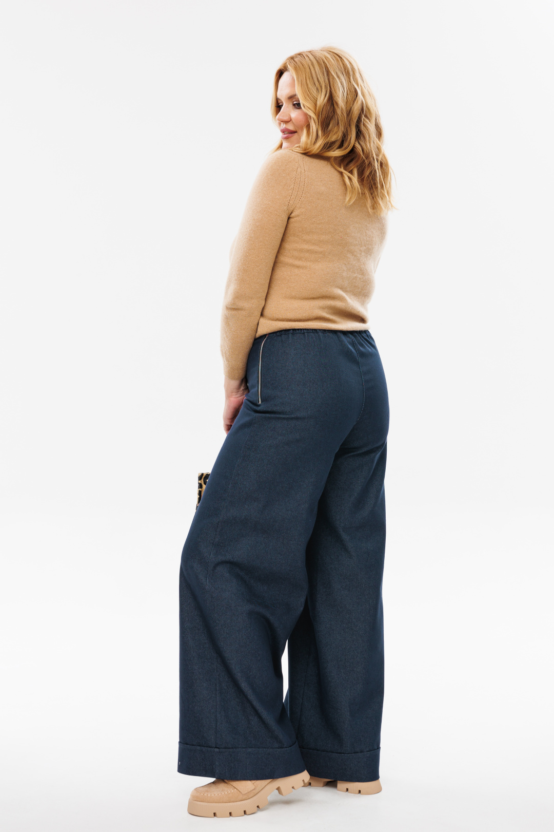 Женские брюки-палаццо – практичный вариант для прогулочных или офисных комплектов, который выгодно смотрится с белыми или цветными блузками, топами, футболками, пиджаками. Изделие выполнено из однотонного джинса средней плотности. Брюки идеально сидят на любой фигуре, подчеркивая все достоинства, скрывая недостатки. Изделие на притачном поясе с резинкой сзади, сбоку застежка на молнию. По низу брюк цельнокроеная манжета из широкой подгибки. С данными брюками можно смело создавать стильные образы и они станут незаменимой базой в Вашем гардеробе. Длина брюк по боковому шву 108 см, по шаговому 79 см. Изделие подойдет на рост 170 см.
