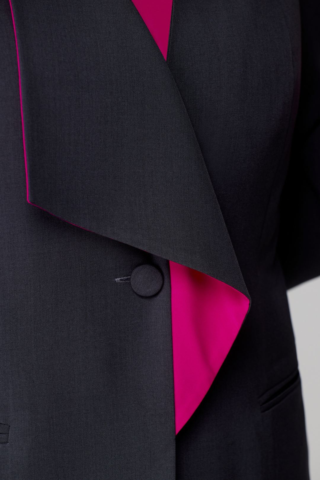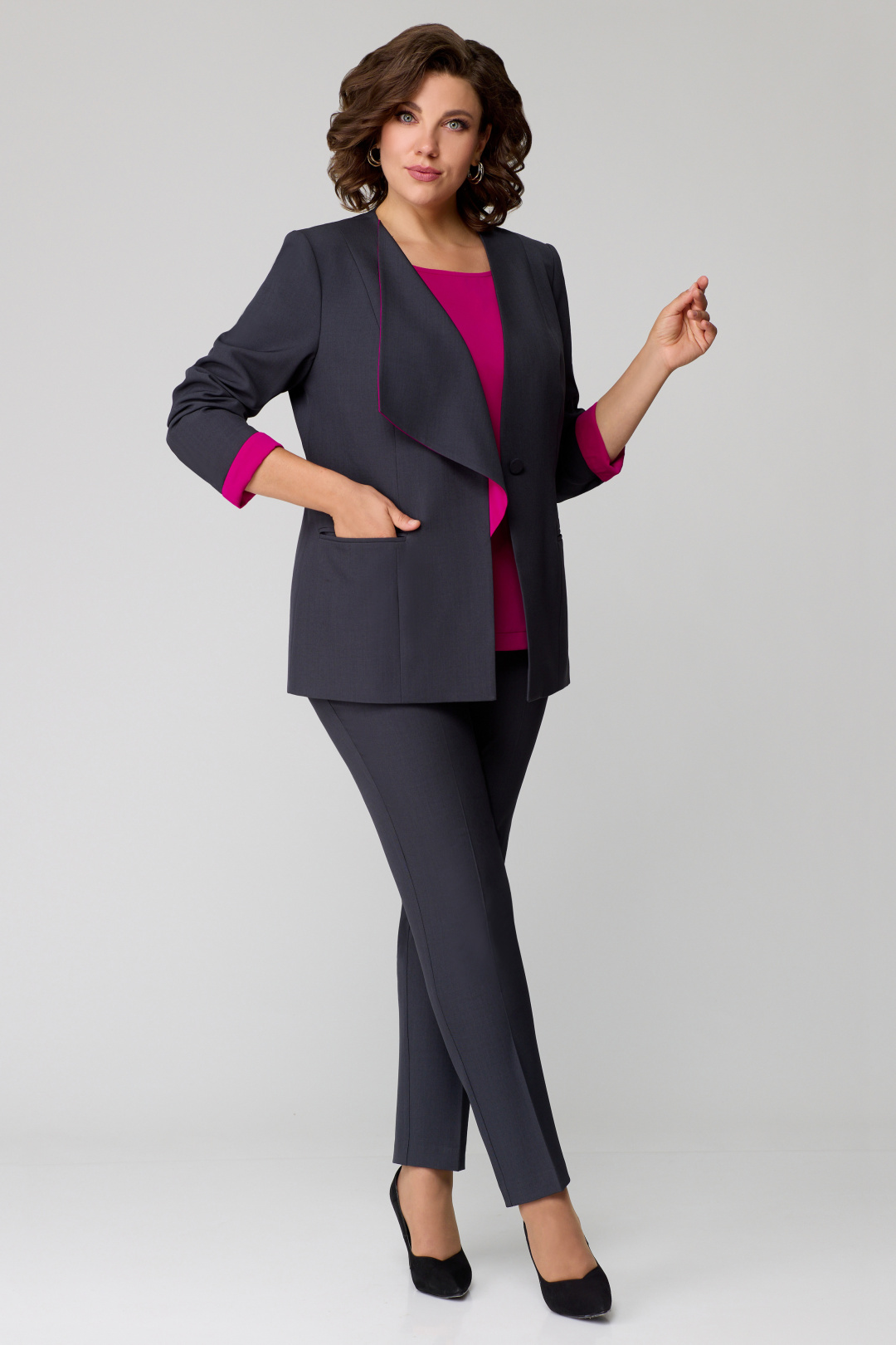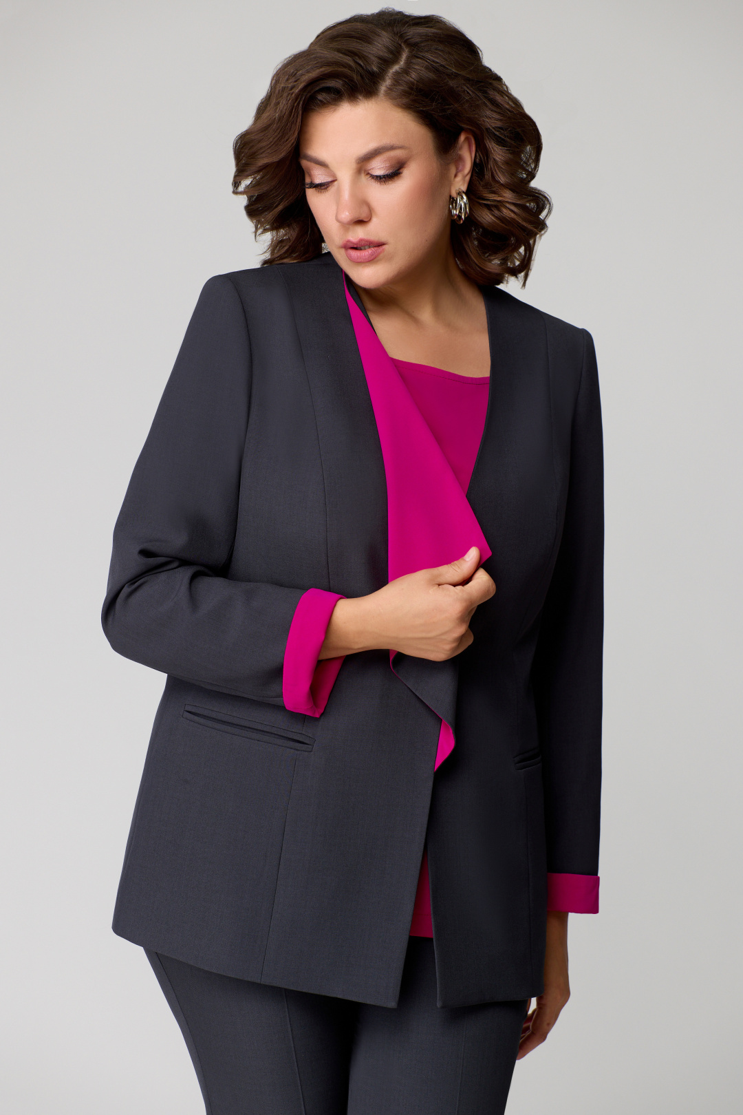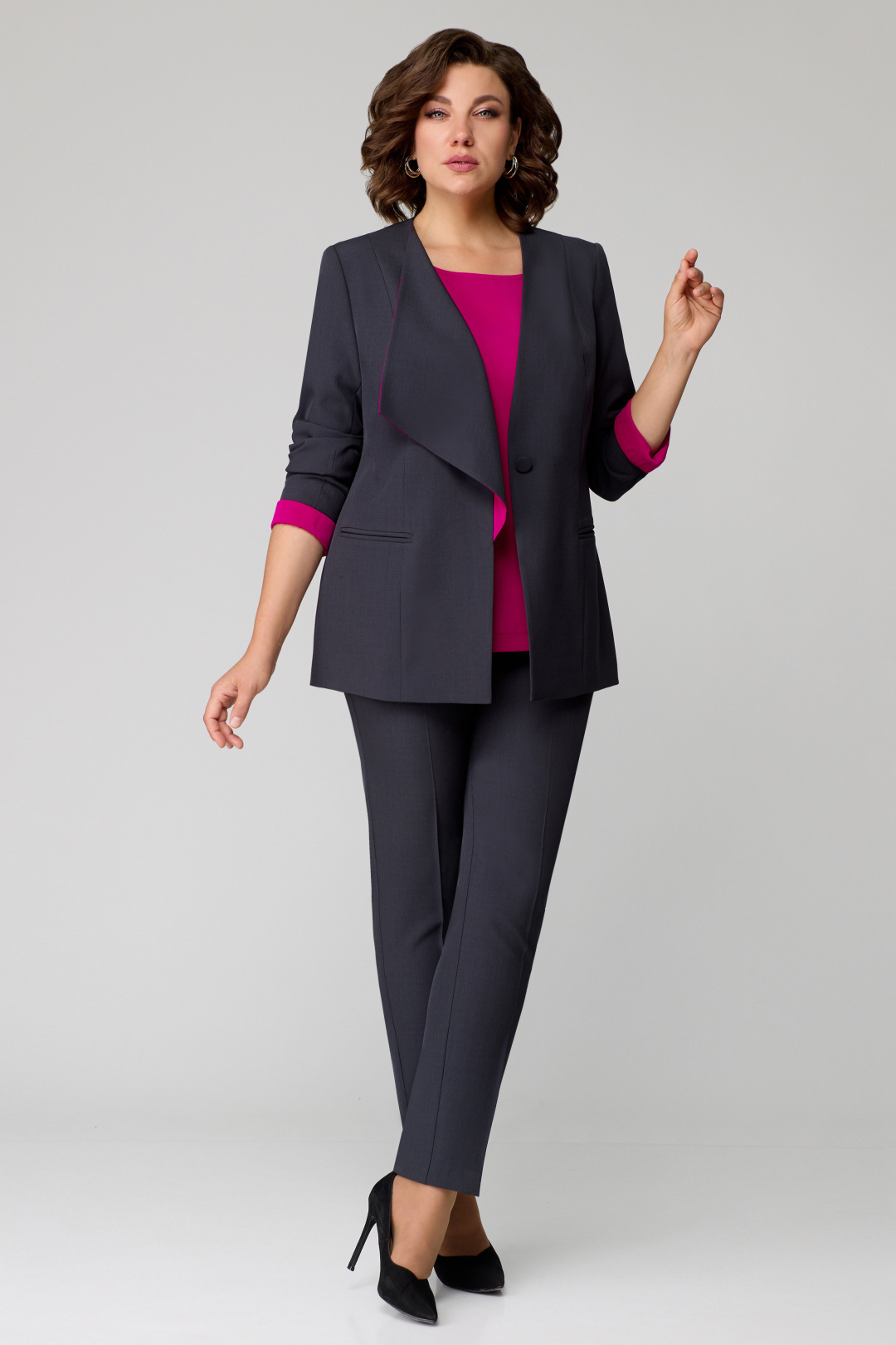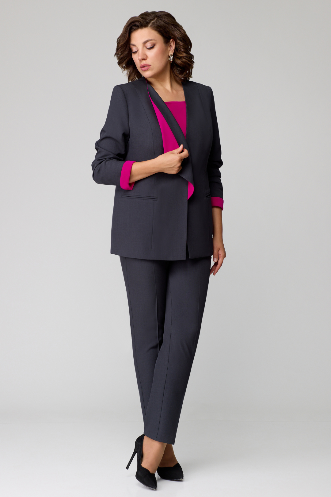 Комплект женский трехпредметный, затмит вашим образом. Жакет на подкладке с центральной застежкой на 1 петлю и пуговицу с асимметричным воротником и контрастной отделкой. По переду функциональные карманы. Спинка с рельефом выходящим из плеча и средним швом. Рукав втачной двухшовный с контрастной манжетой. Блузка с округлым вырезом горловины и спущенной линией плеча. Брюки классические средней посадки с боковыми карманами. Пояс с резинкой по бокам.