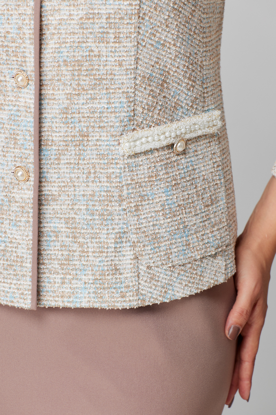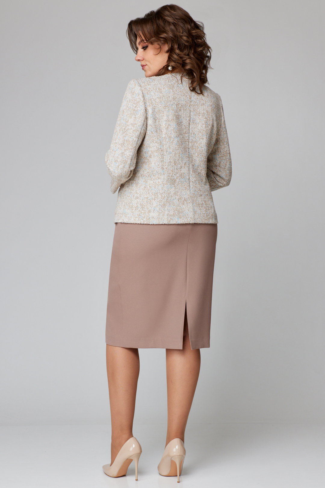 Элегантный и стильный комплект состоящий из жакета и юбки. Жакет слегка приталенного силуэта горловиной круглой формы и с застежкой на 5 петель и пуговиц. По переду жакета накладные карманы с декоративной тесьмой и пуговицей. По краю борта контрастная отделка в цвет юбки . Рукав втачной двухшовный. Спинка со средним швом и талиевыми вытачками. Юбка прямая, слегка зауженная к низу, на подкладке с притачным поясом, для максимального комфорта в поясе по бокам предусмотрена резинка. По спинке в среднем шве разрез и застёжка на молнию. Длина жакета 58 см, длина рукава 54 см, длина юбки 68 см
