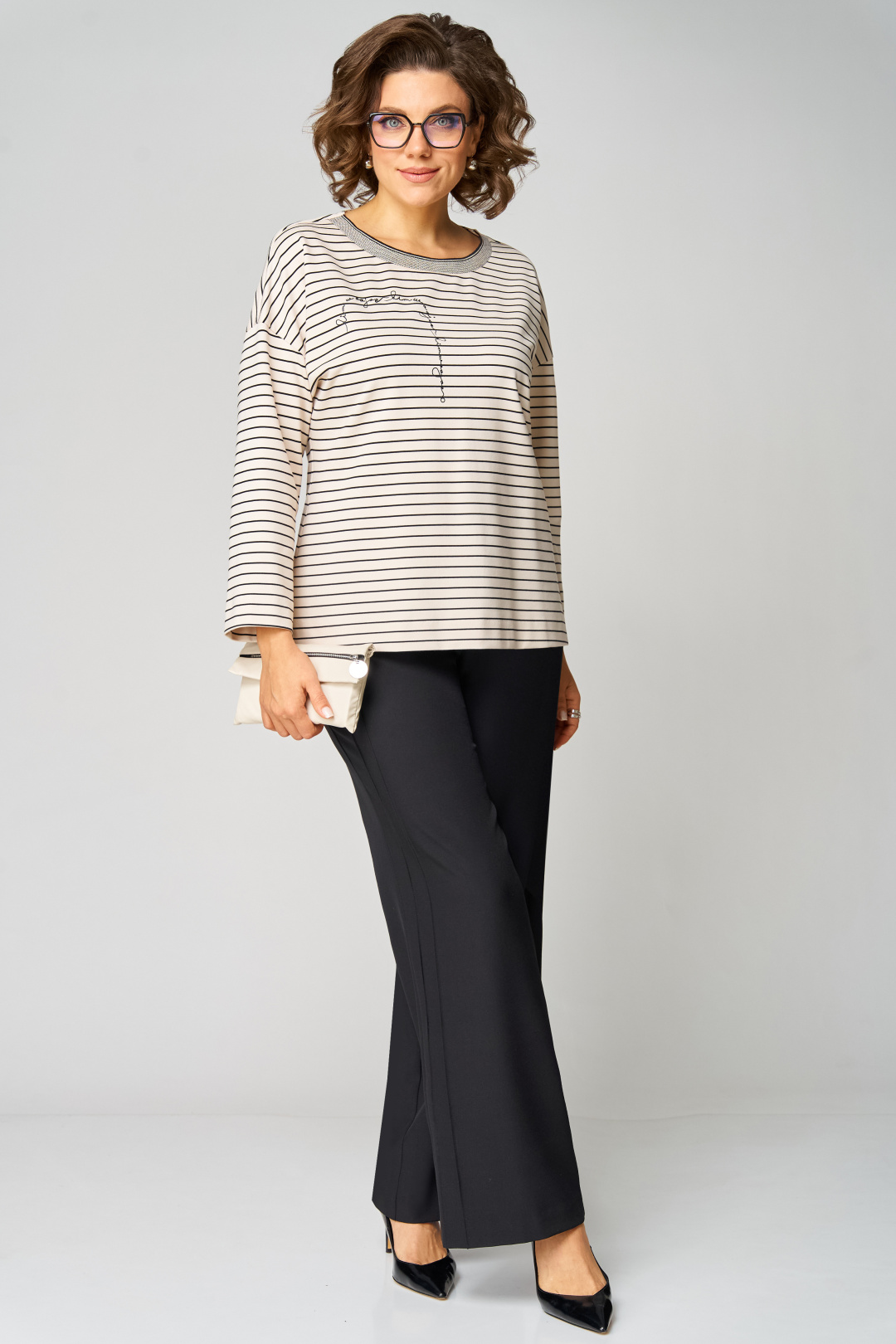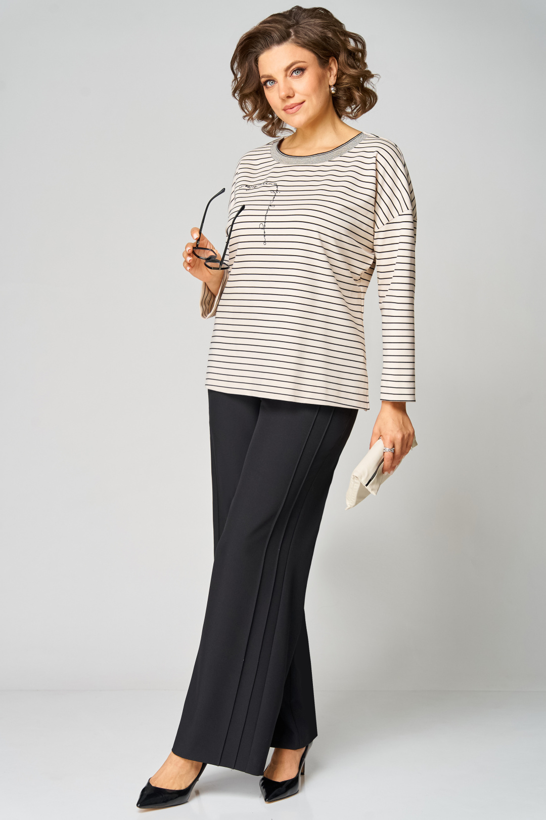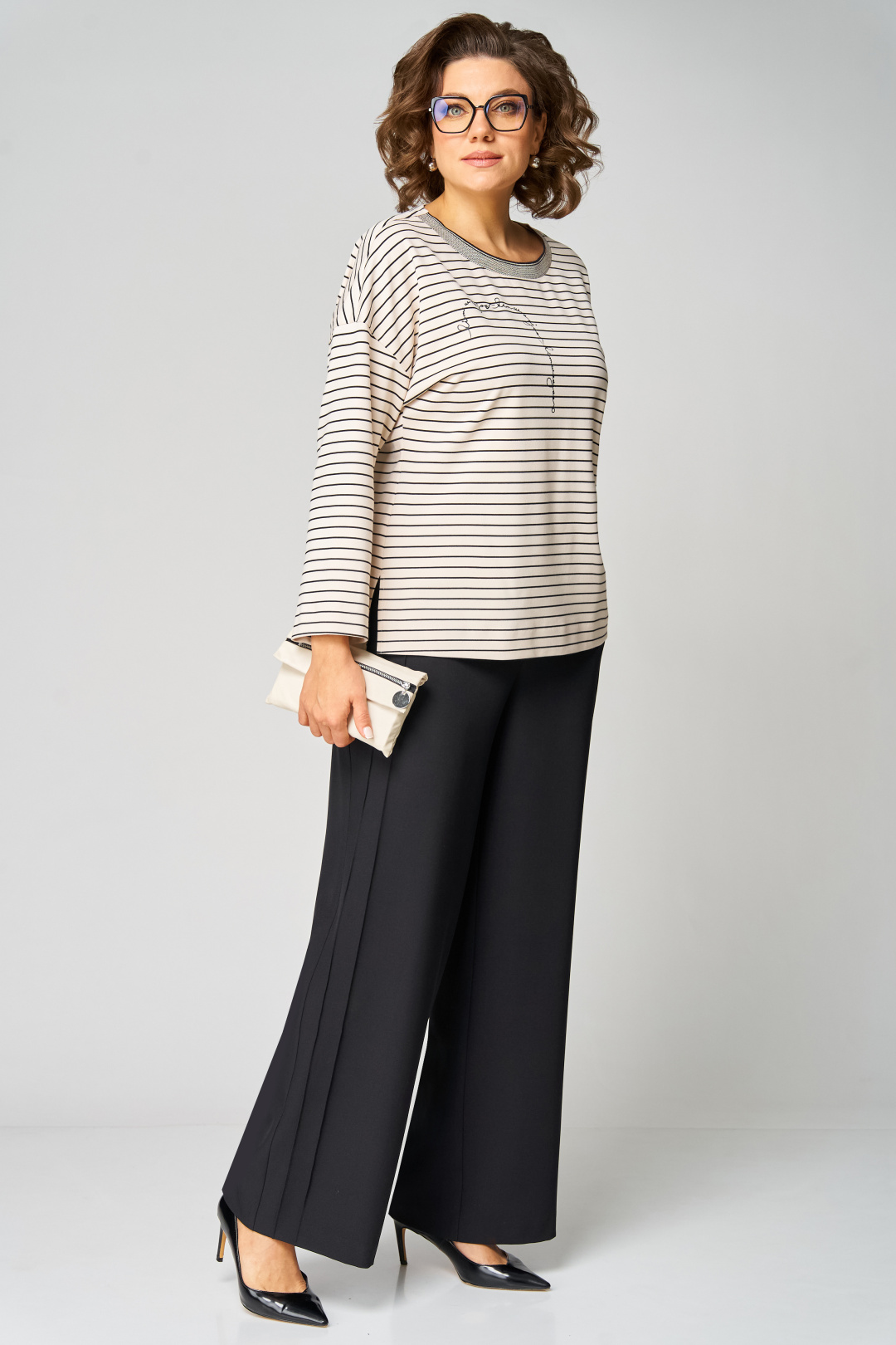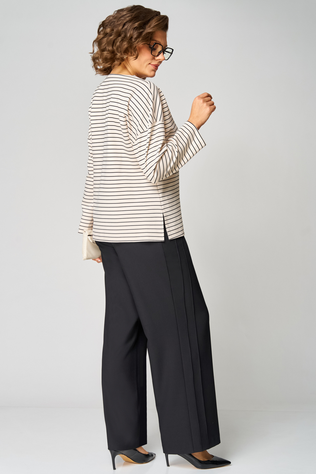 Комплект женский , двух предметный состоящий из туники и брюки. Туника прямого силуэта выполнена из трикотажного полотна « в полоску» . Горловина переда обработана довязом , горловина спинки обтачкой. Линия плеча спущена . По переду с правой стороны авторская печать. Рукав втачной, одношовный. Длина изделия по спинке- 65см, длина рукава от горловины – 66 см. По бокам имеются разрезы. Брюки палаццо прямого силуэта на притачном поясе, с застежкой на тесьму- молнию и 1 пуговицу и петлю, с боковыми наклонными карманами на передних половинках брюк . По передним половинкам брюк прострочены 2 канта. Для лучшего прилегания брюк в области талии в поясе со стороны спинки вставлена резинка. Длина брюк по боковому шву без пояса- 104 см.