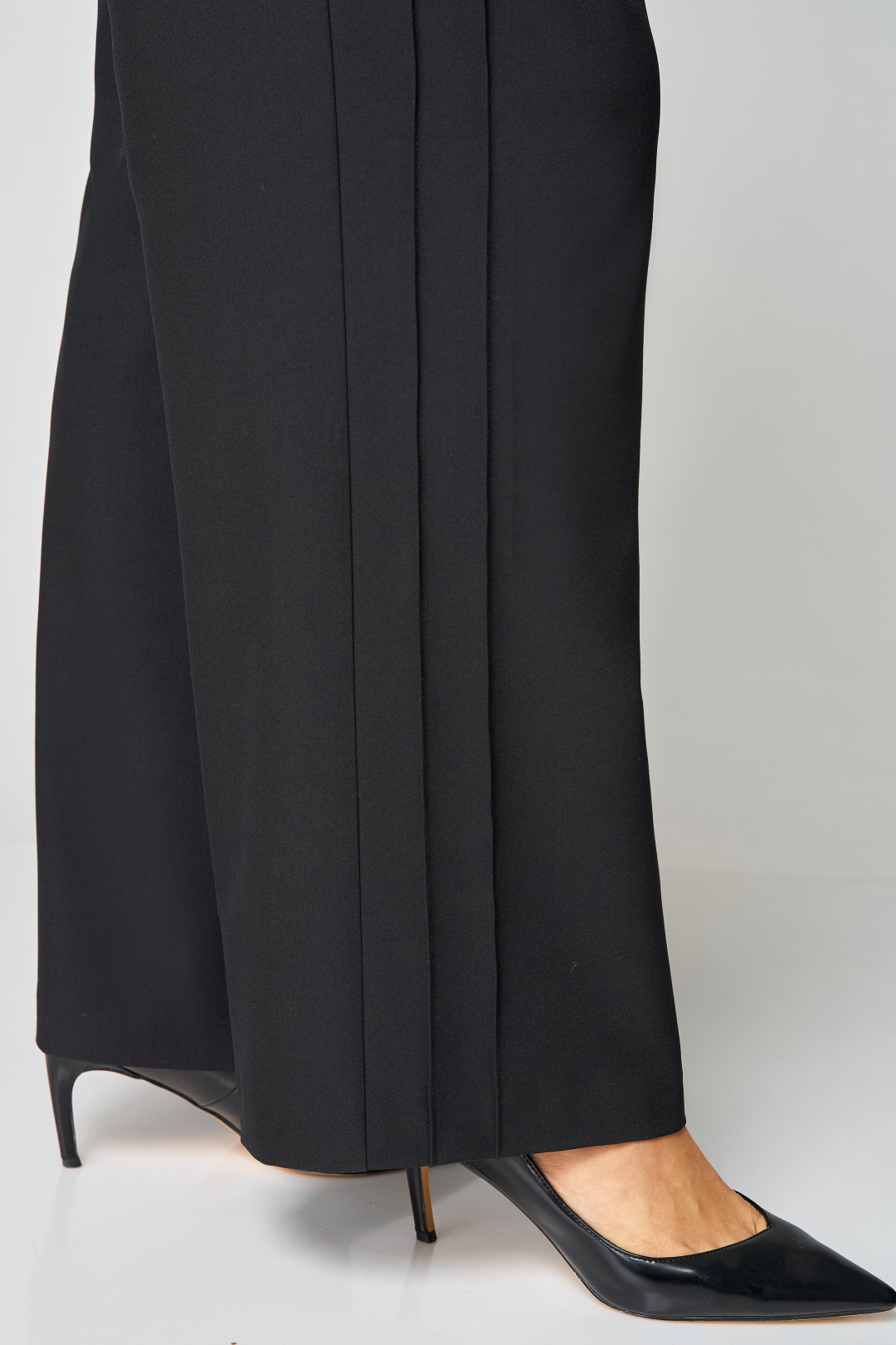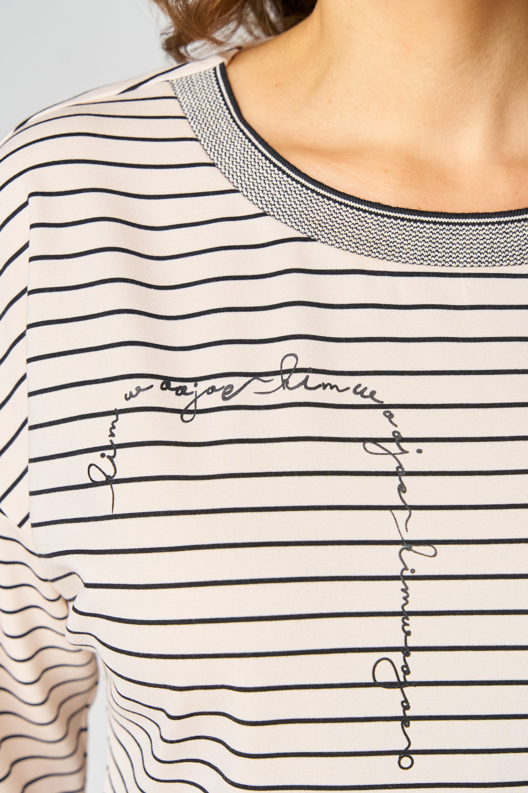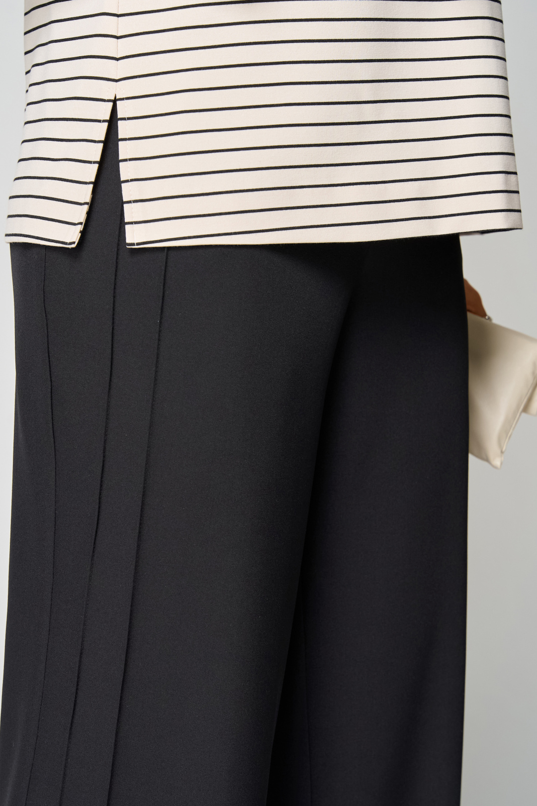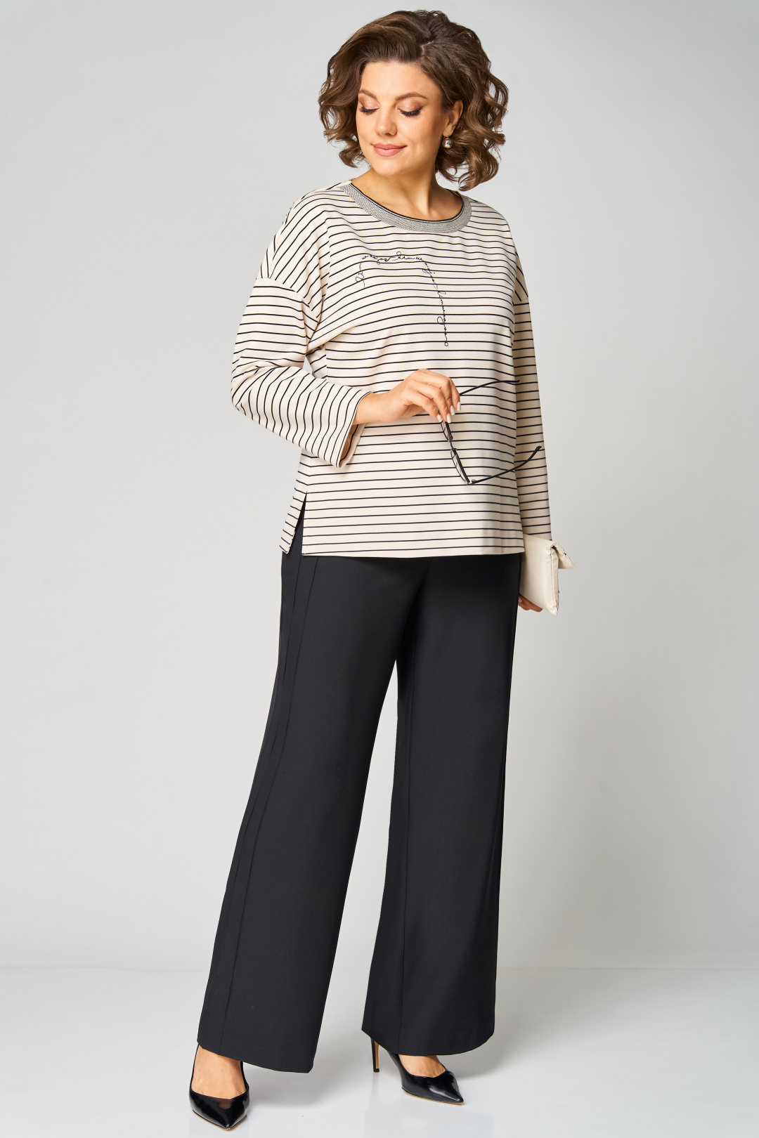 Комплект женский , двух предметный состоящий из туники и брюки. Туника прямого силуэта выполнена из трикотажного полотна « в полоску» . Горловина переда обработана довязом , горловина спинки обтачкой. Линия плеча спущена . По переду с правой стороны авторская печать. Рукав втачной, одношовный. Длина изделия по спинке- 65см, длина рукава от горловины – 66 см. По бокам имеются разрезы. Брюки палаццо прямого силуэта на притачном поясе, с застежкой на тесьму- молнию и 1 пуговицу и петлю, с боковыми наклонными карманами на передних половинках брюк . По передним половинкам брюк прострочены 2 канта. Для лучшего прилегания брюк в области талии в поясе со стороны спинки вставлена резинка. Длина брюк по боковому шву без пояса- 104 см.