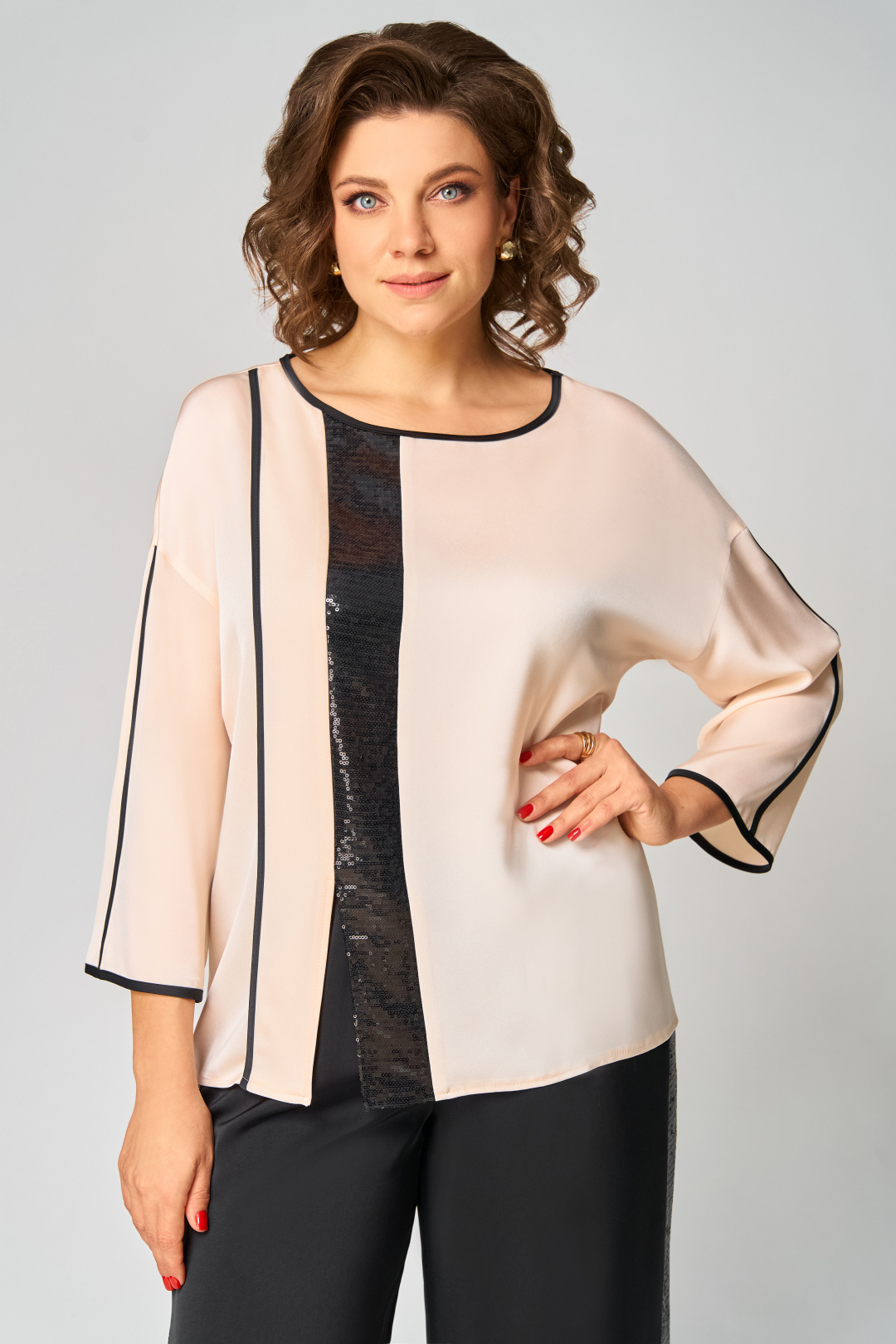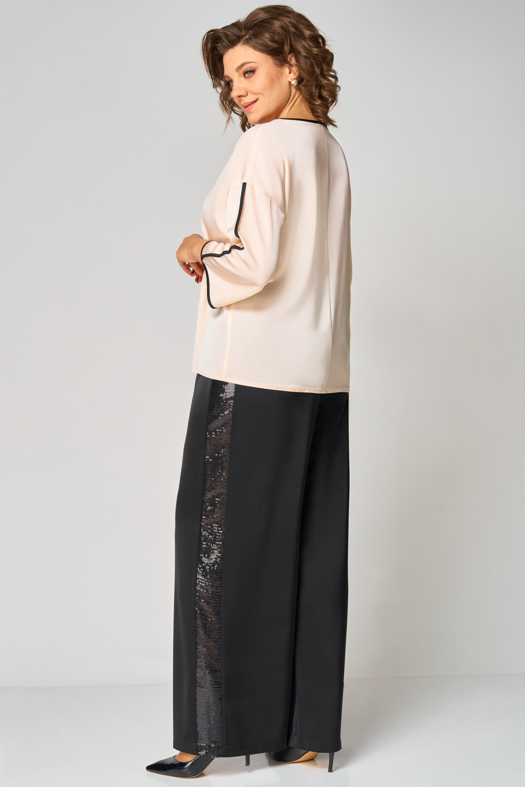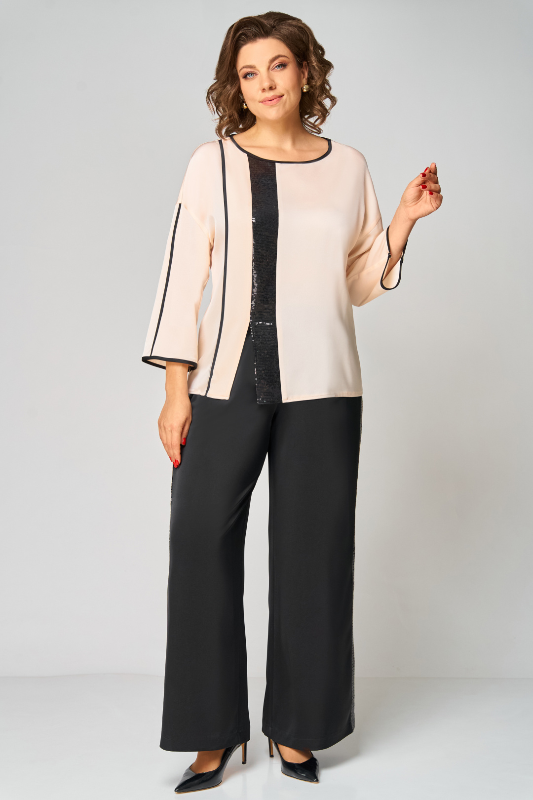 Комплект женский , двухпредметный состоящий из: туники и брюки. Туника прямого силуэта , со спущенной линией плеча . Округлый вырез горловины, обработан бейкой черного цвета. По переду с правой стороны отрезной рельеф , обработан бейкой черного цвета и вставка из пайеток. По переду имеется небольшой разрез. Спинка со средним швом. Рукав одношовный, центр рукава и по низу обработан бейка черного цвета. Длина рукава от горловины – 59см, длина по спинке -63см.Брюки прямые, пояс на эластичной резнике, по боковому шву лампас из пайеток. Длина брюк по боковому шву - 102 см.