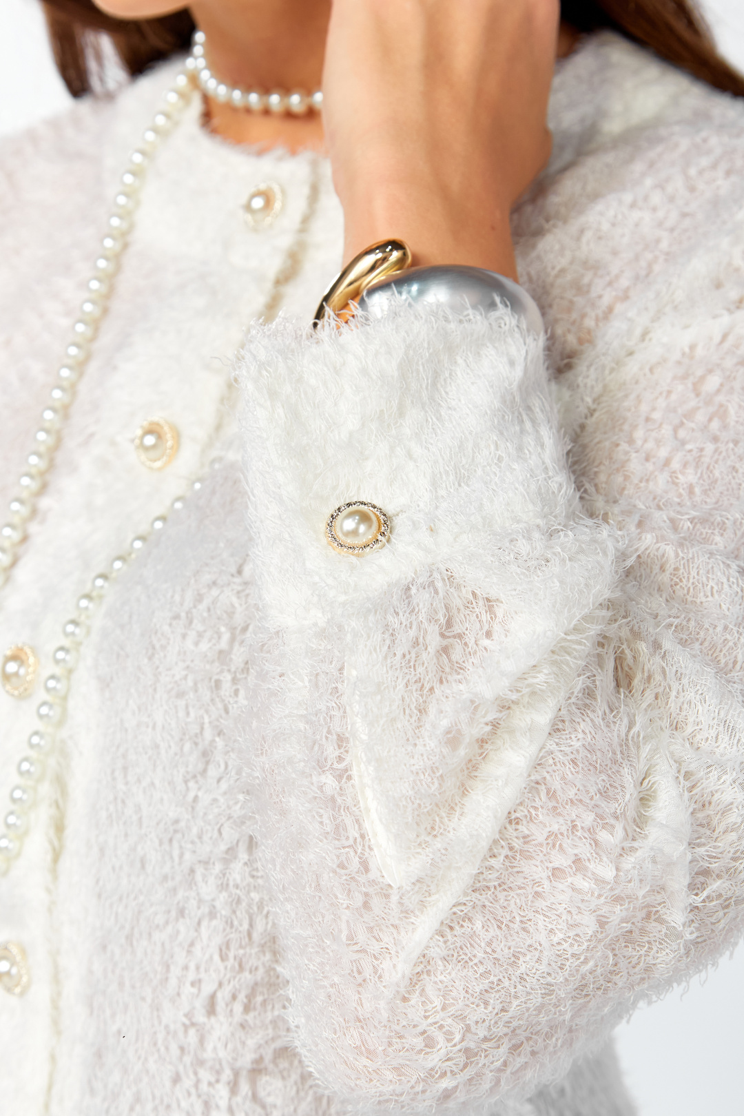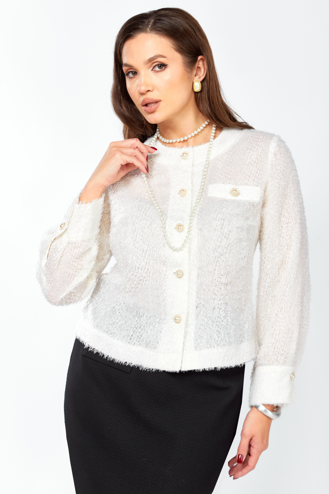 Блузка полуприлегающего силуэта выполнена из шифона «травки». Округлый вырез горловины. По переду настрочен нагрудный карман обманка листочка с 1 пуговицей. Спинка со средним швом и талевыми вытачками. Рукав втачной, одношовный на притачной манжете, застежка на 1 пуговицу и петлю . Застежка центральная 5 пуговиц и петель. Юбка с завышенной талией заужена к низу на обтачке выполнена. По переднему полотнищу юбки настрочена карман «листочка». Сзади разрез и застежка на потайную тесьму-молнию. Юбка на подкладке.