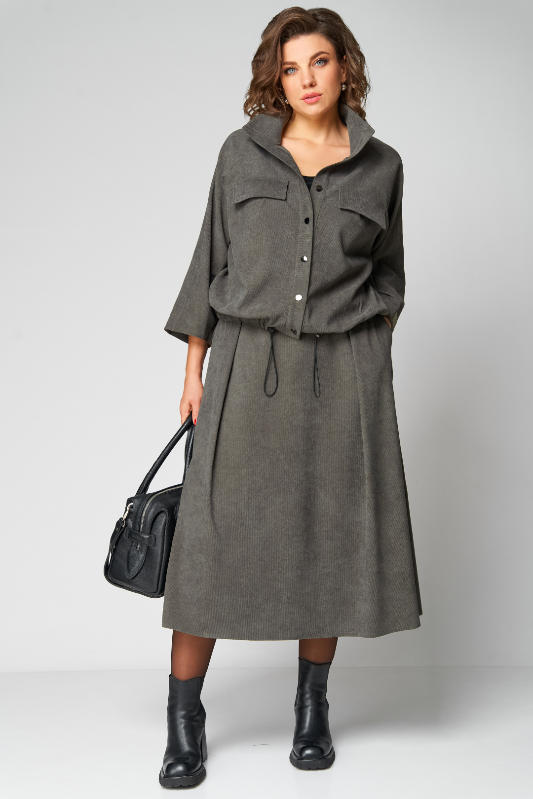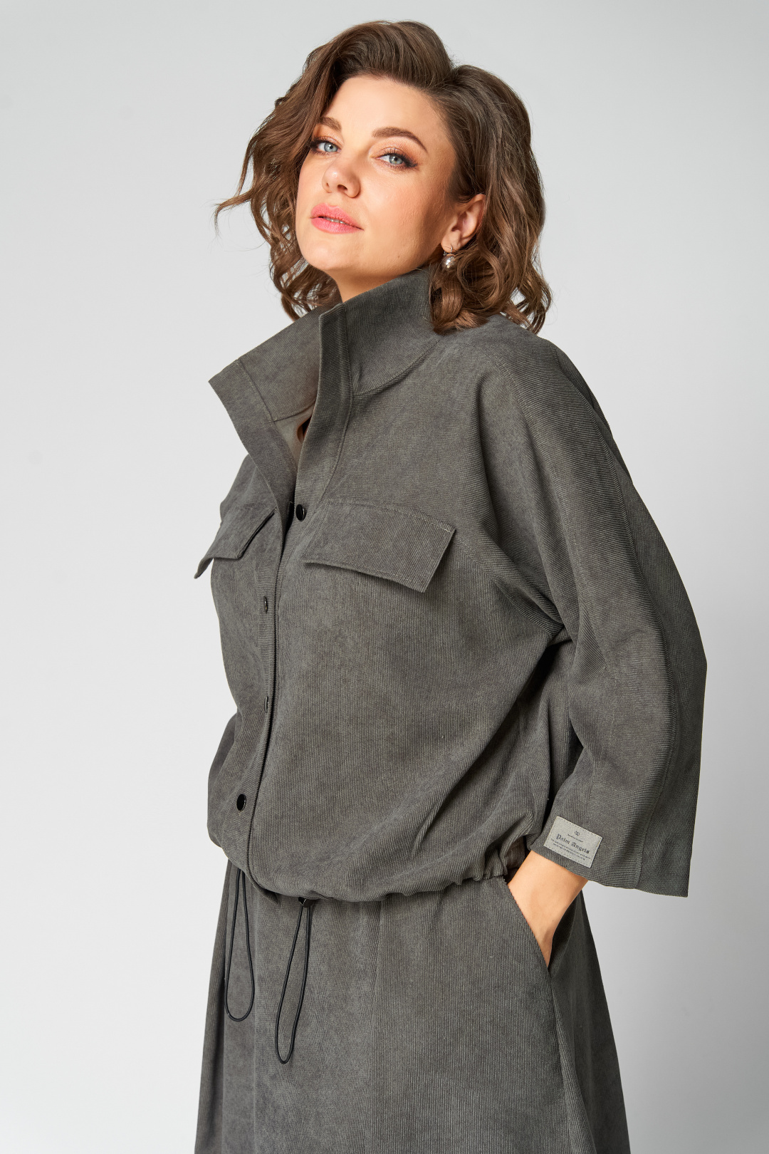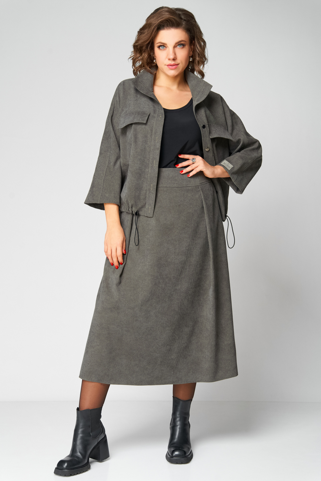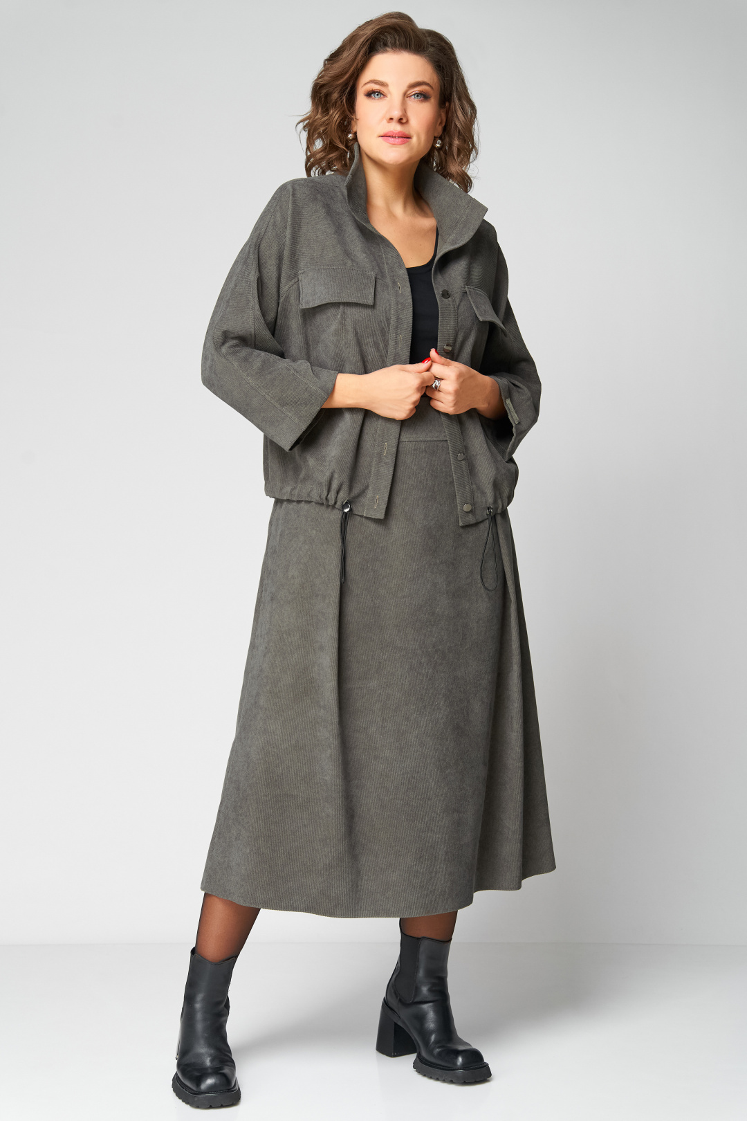 Комплект женский 2-ух предметный, состоящий из жакета и юбки. Жакет со спущенной линией плеча и цельнокроеным рукавом. По переду отрезная кокетка, воротник- стойка, рукава и планки. По переду настрочены нагрудные клапаны. Синка со средним швом. На левом рукаве о низу настрочена нашивка. Центральная застежка по планкам на 5 пуговиц и петель. Низ жакета можно регулировать с помощью эластичного шнура и фиксатора. Жакет без подкалки. Юбка на широкой обтачке А- силуэта, на подкладке. По переднему и заднему полотнищу заложены складки. По бокам расположены наклонные карманы. Застежка сзади на потайную тесьму-молнию.