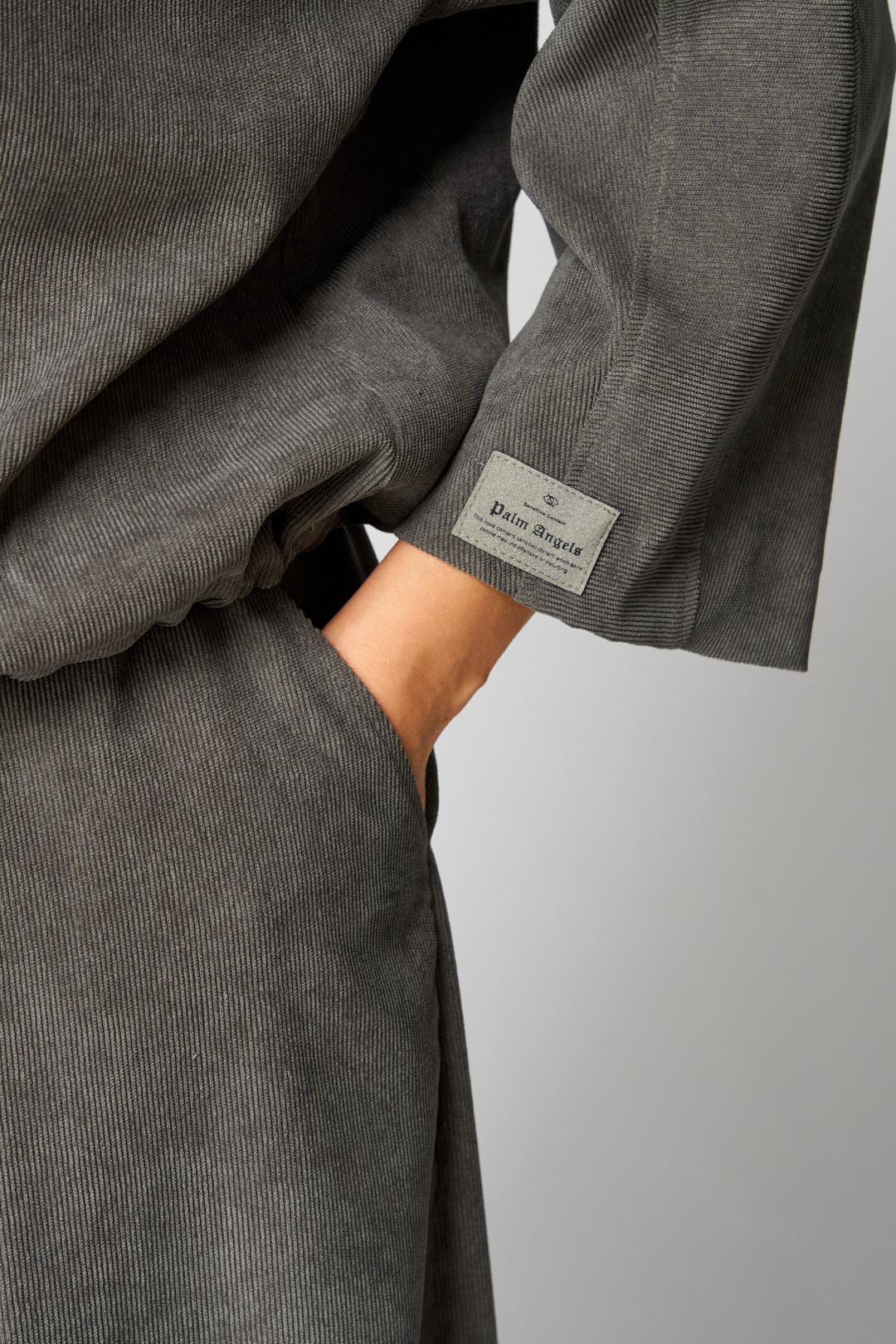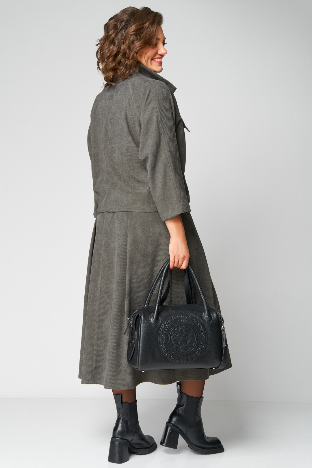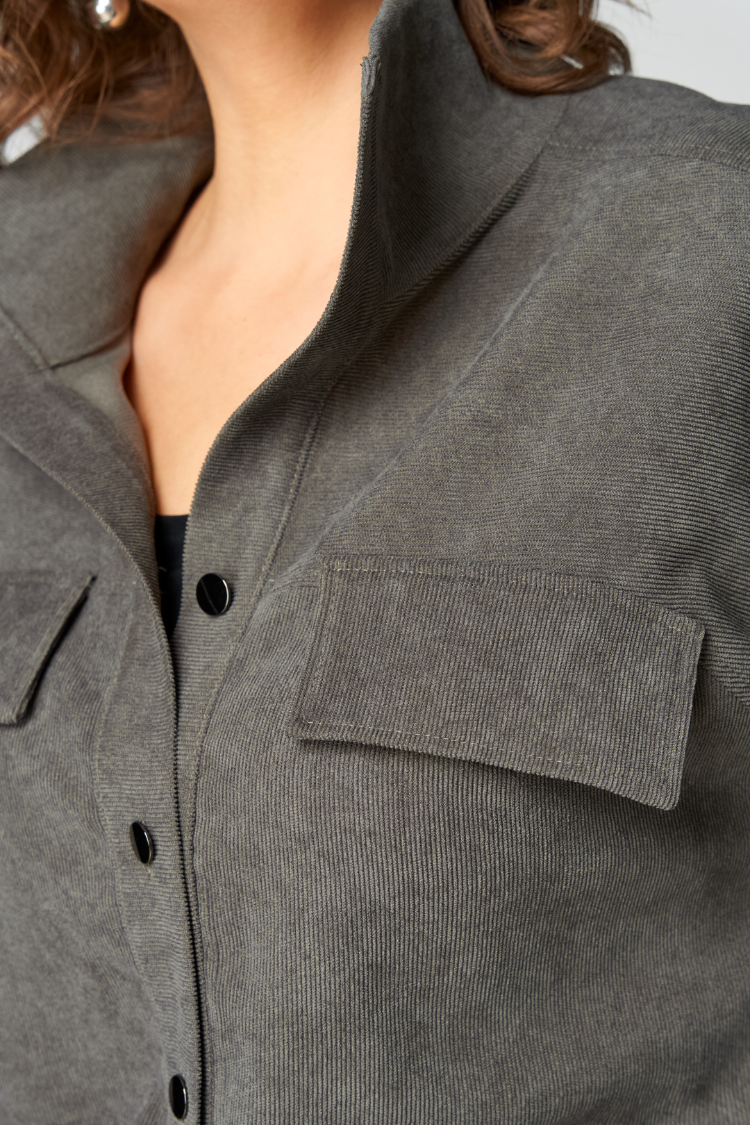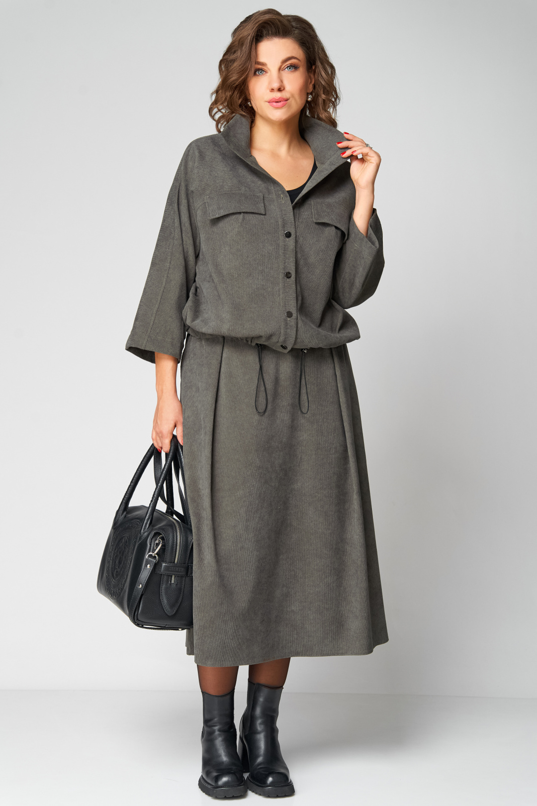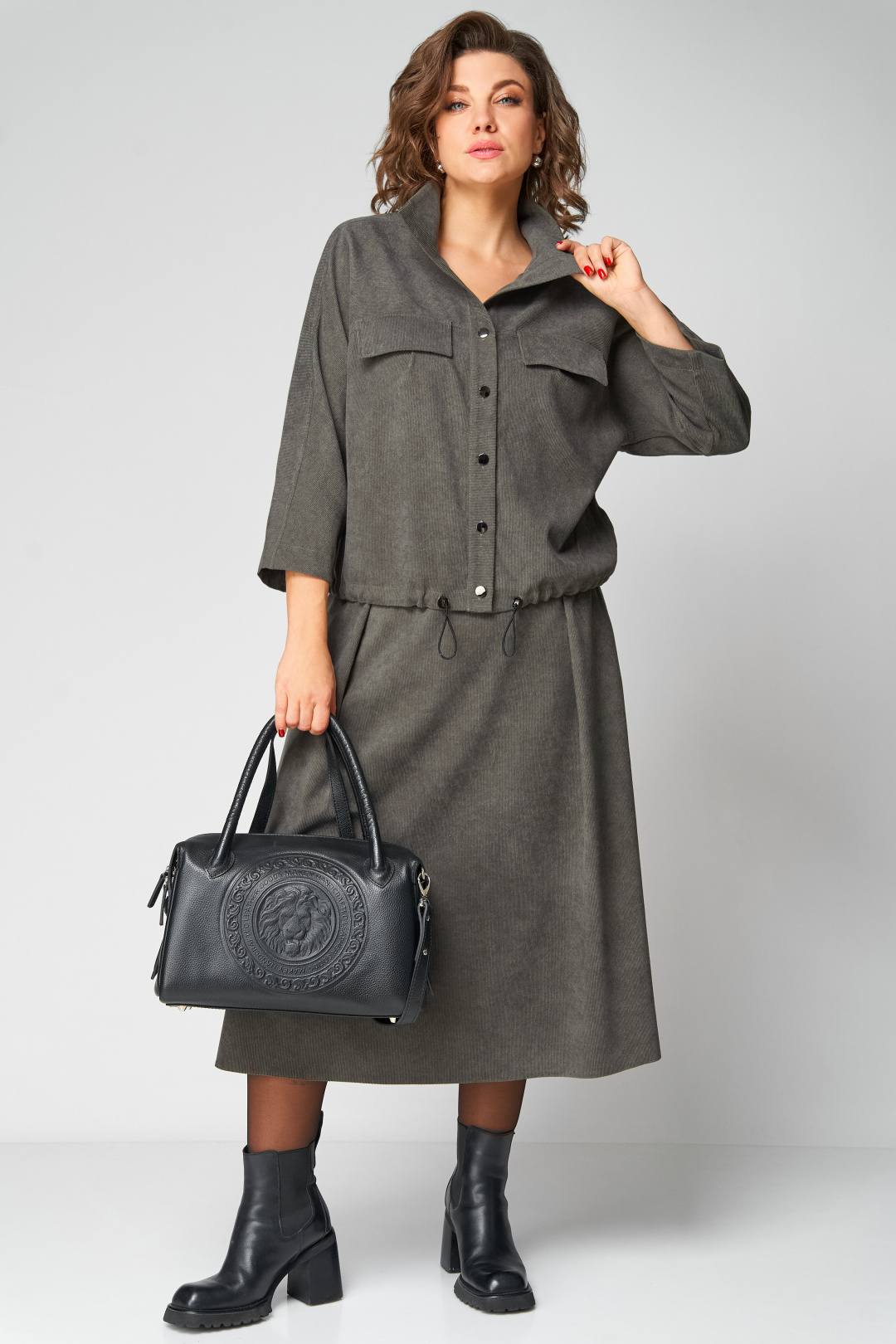 Комплект женский 2-ух предметный, состоящий из жакета и юбки. Жакет со спущенной линией плеча и цельнокроеным рукавом. По переду отрезная кокетка, воротник- стойка, рукава и планки. По переду настрочены нагрудные клапаны. Синка со средним швом. На левом рукаве о низу настрочена нашивка. Центральная застежка по планкам на 5 пуговиц и петель. Низ жакета можно регулировать с помощью эластичного шнура и фиксатора. Жакет без подкалки. Юбка на широкой обтачке А- силуэта, на подкладке. По переднему и заднему полотнищу заложены складки. По бокам расположены наклонные карманы. Застежка сзади на потайную тесьму-молнию.