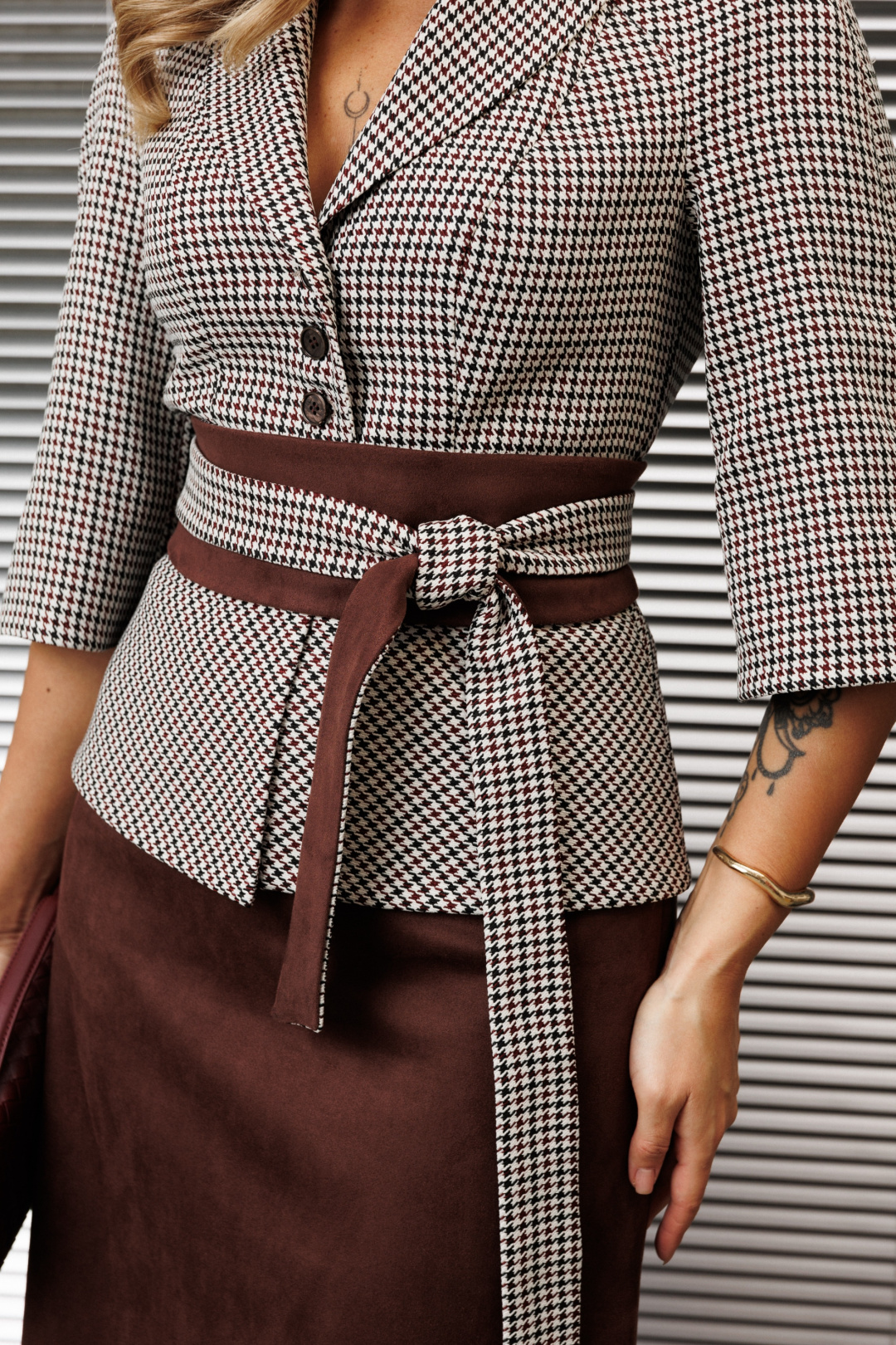 Бестселлер нашей коллекции - двухпредметный костюм, состоящий из жакета и юбки. Акцентом данного комплекта является съемный пояс. Для создания данного образа мы использовали мелкую клетку в тандеме с экокожей.Жакет прилегающего силуэта с отрезной баской по переду и спинка с рельефами. Рукав-реглан.Юбка А-силуэта на притачном поясе, сзади с резинкой. Застежка на тесьму-молнию в боковом шве.Костюм на подкладке.