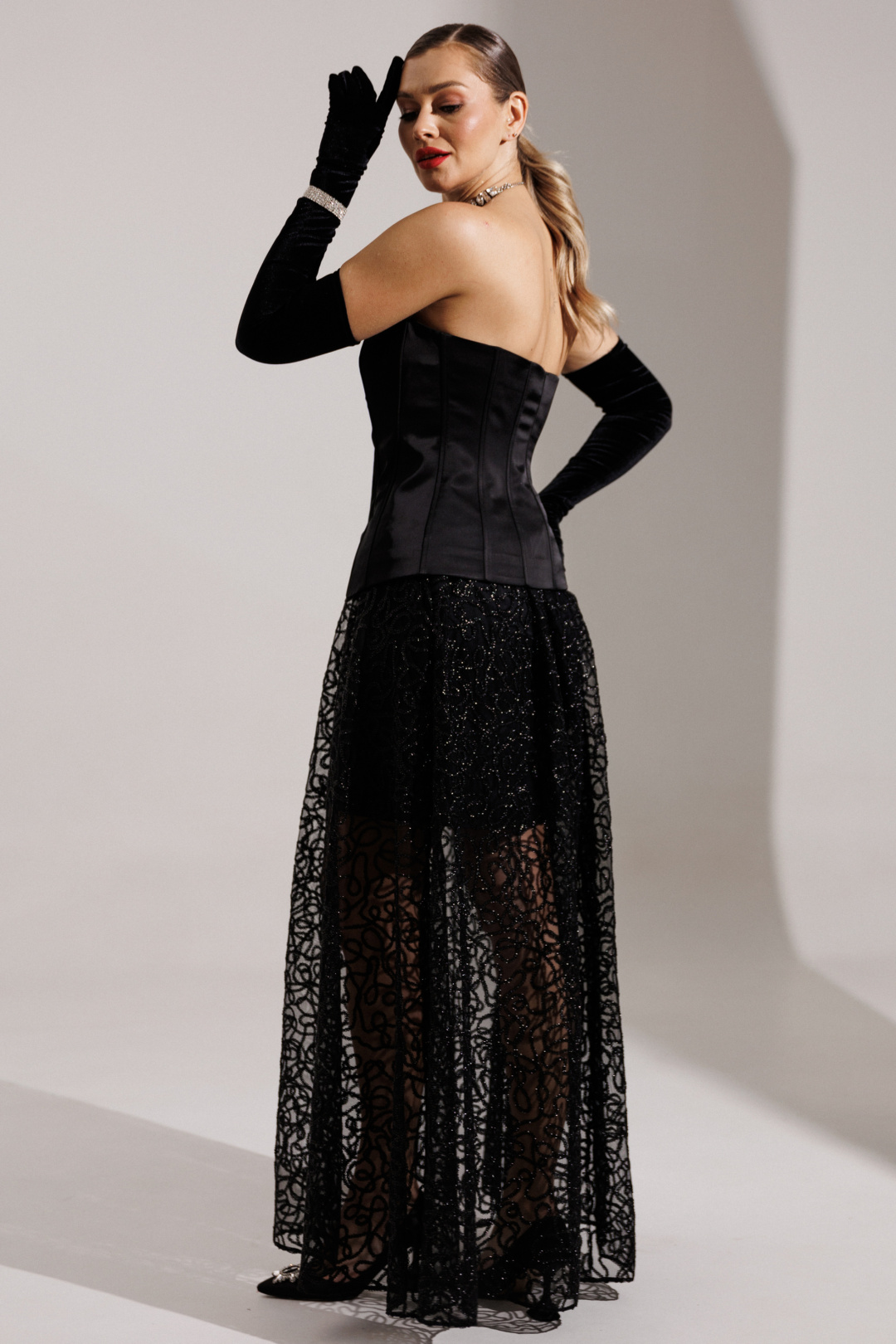 Хотите образ, который соберет все восторженные взгляды? Не ищите дальше! Встречайте главную героиню новогодней ночи! Юбка, которая состоит из двух слоев: нижняя часть зауженная мини, а верхняя — длинная, пышная. Верхний слой выполнен из черной сетки, расшитой декоративной тесьмой. Притачной пояс и молния сзади завершают образ. Вы выглядите безупречно и чувствуете себя уверенно в любом движении! Завершите образ с помощью корсета из нашей новогодней коллекции. В дуэте они раскрываются на все 100%: баланс пышности низа и собранного верха. Ваш готовый билет на самый стильный Новый год!