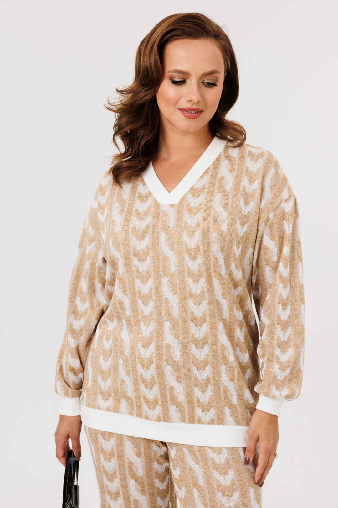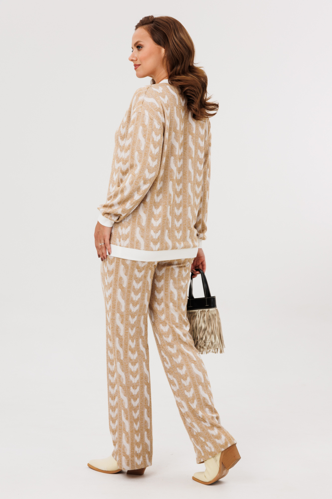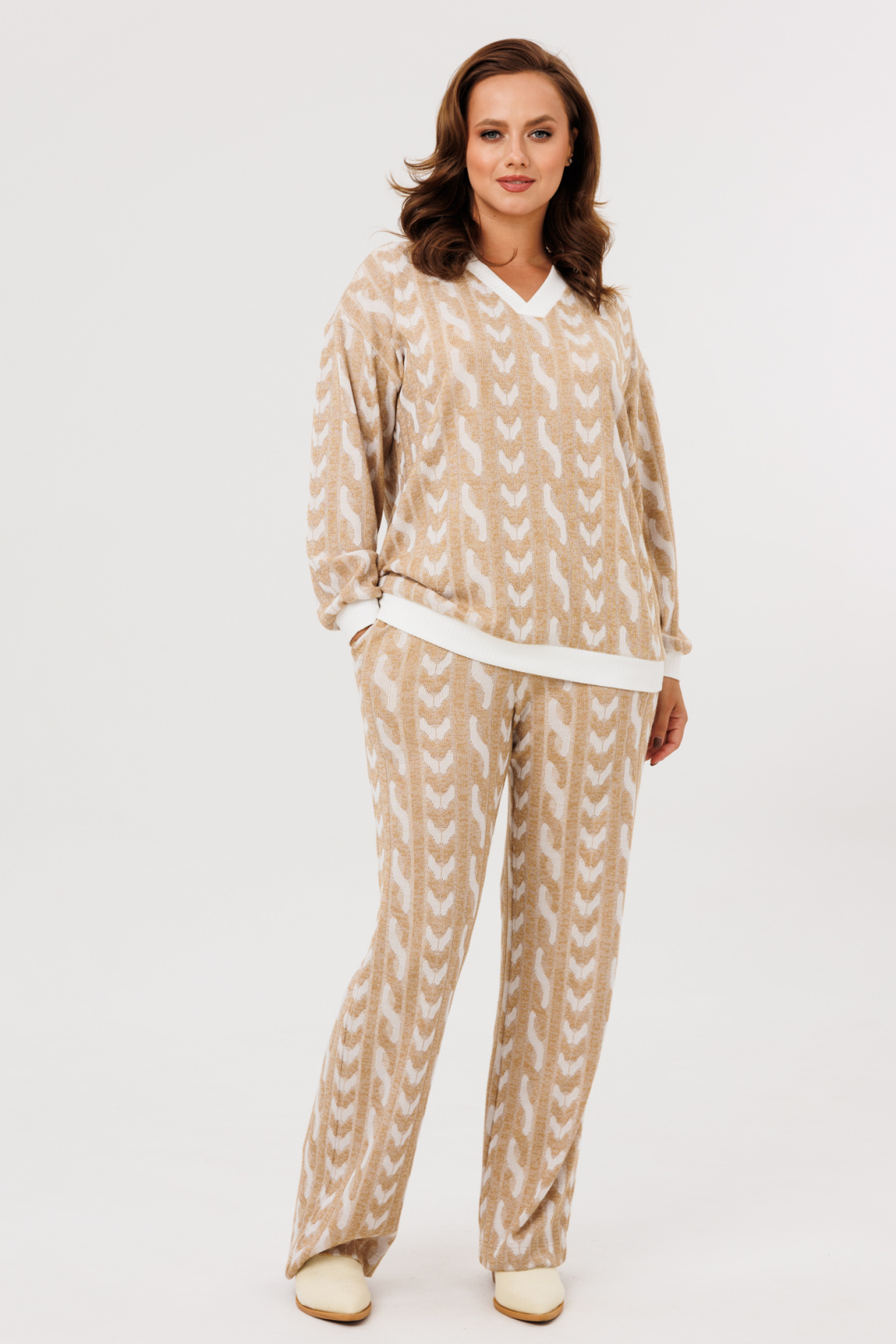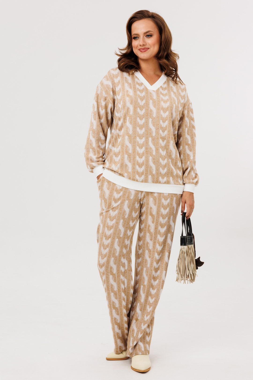 Стильный женский костюм, состоящий из джемпера и брюк.