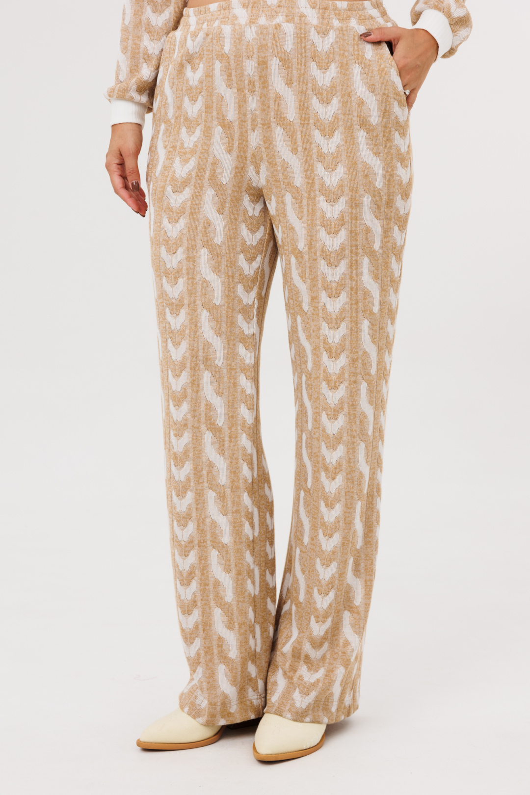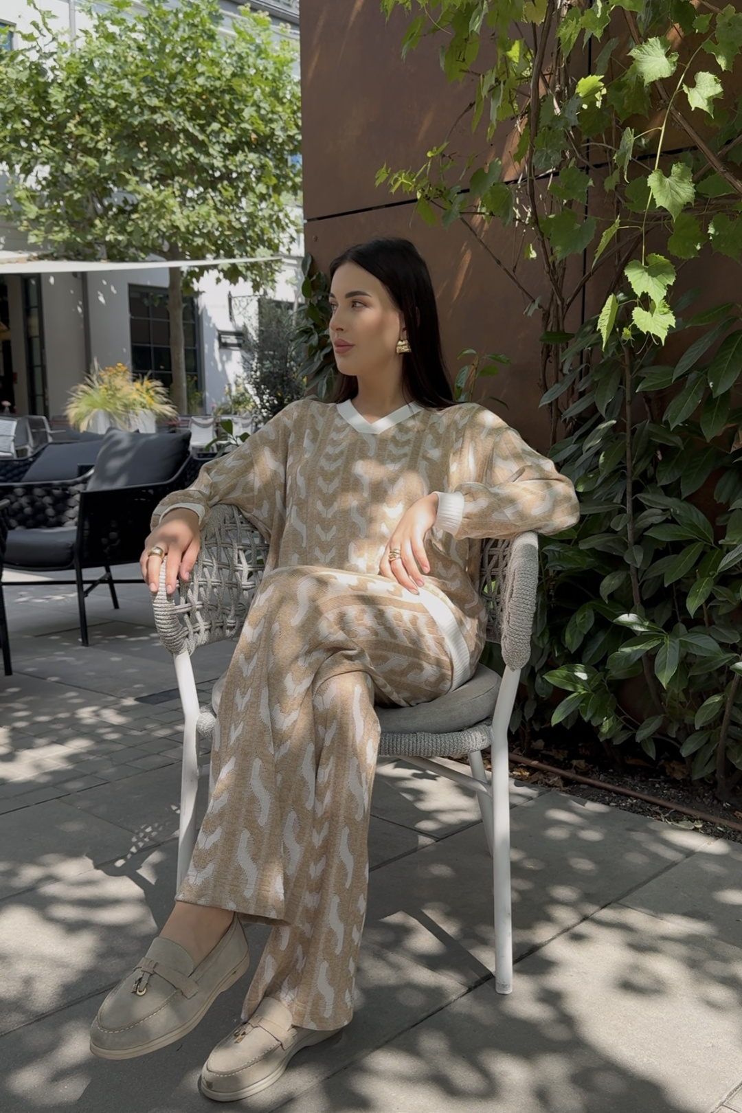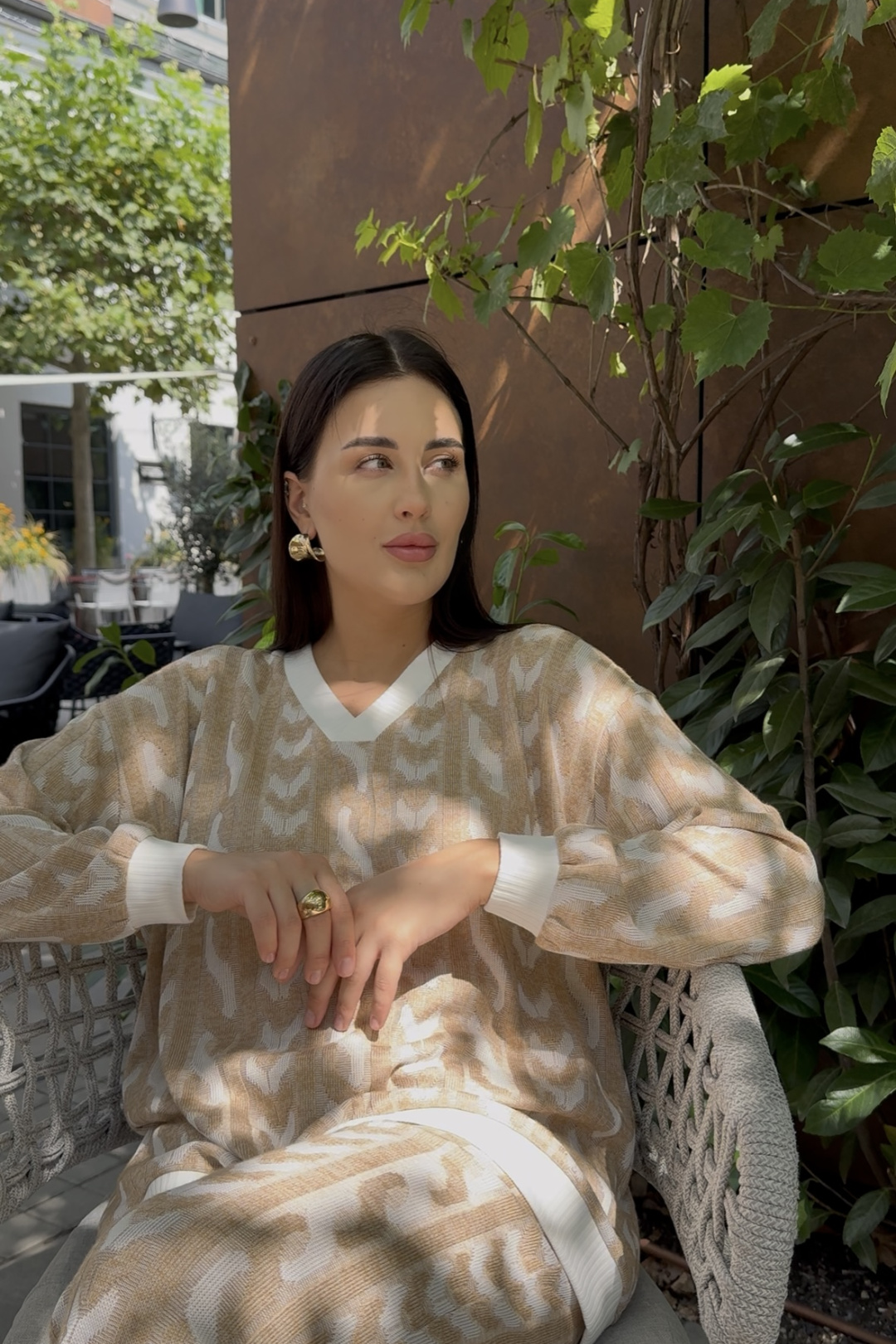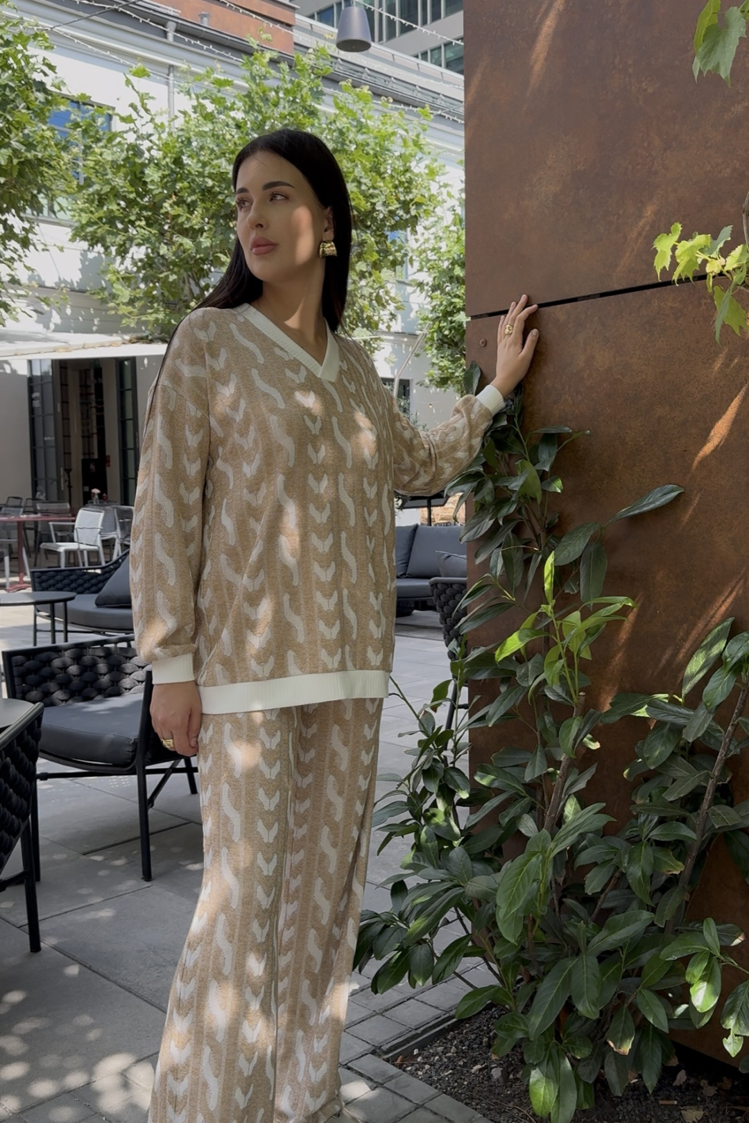 Стильный женский костюм, состоящий из джемпера и брюк.