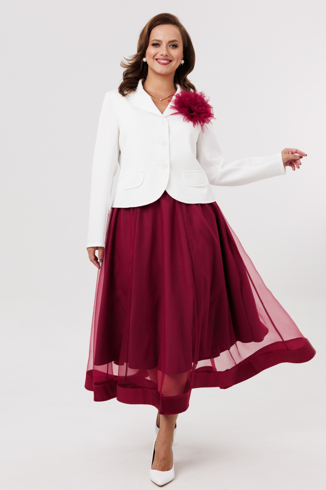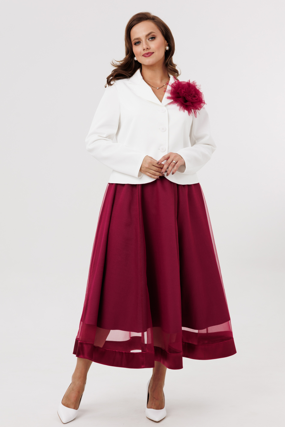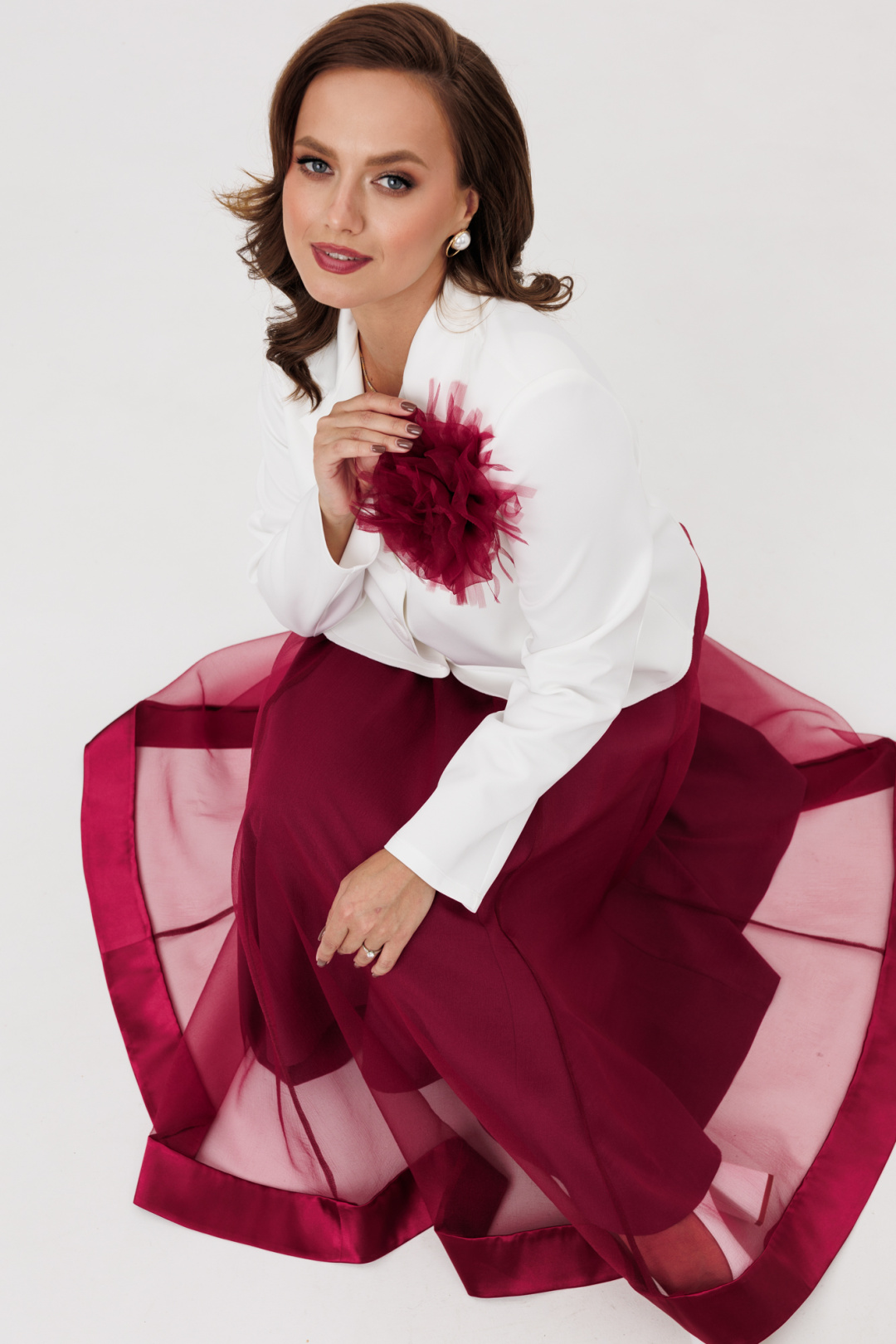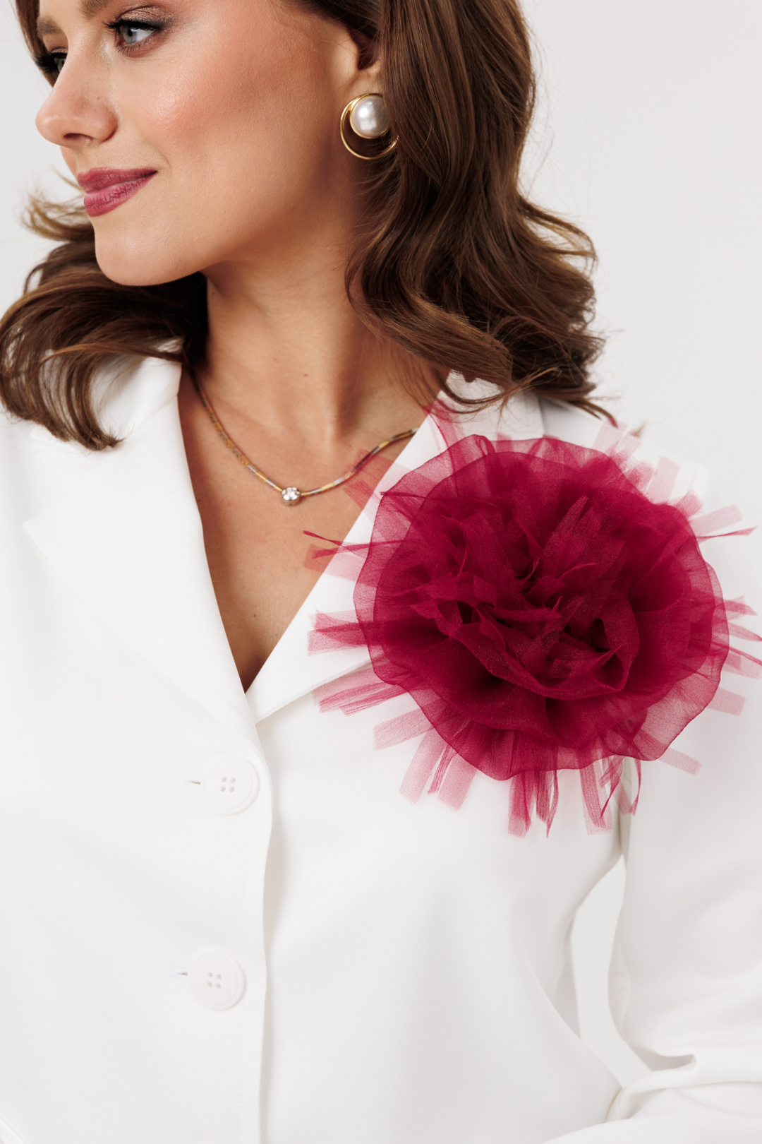 В модели 285 молочно-бордового цвета жакет декорирован съемным цветком бордового цвета (на булавочке).