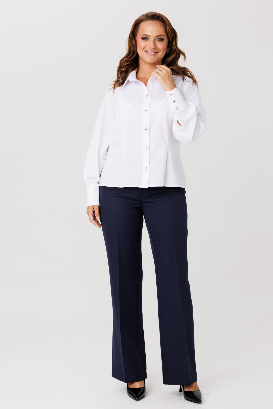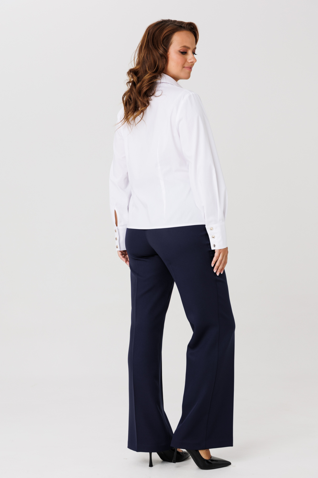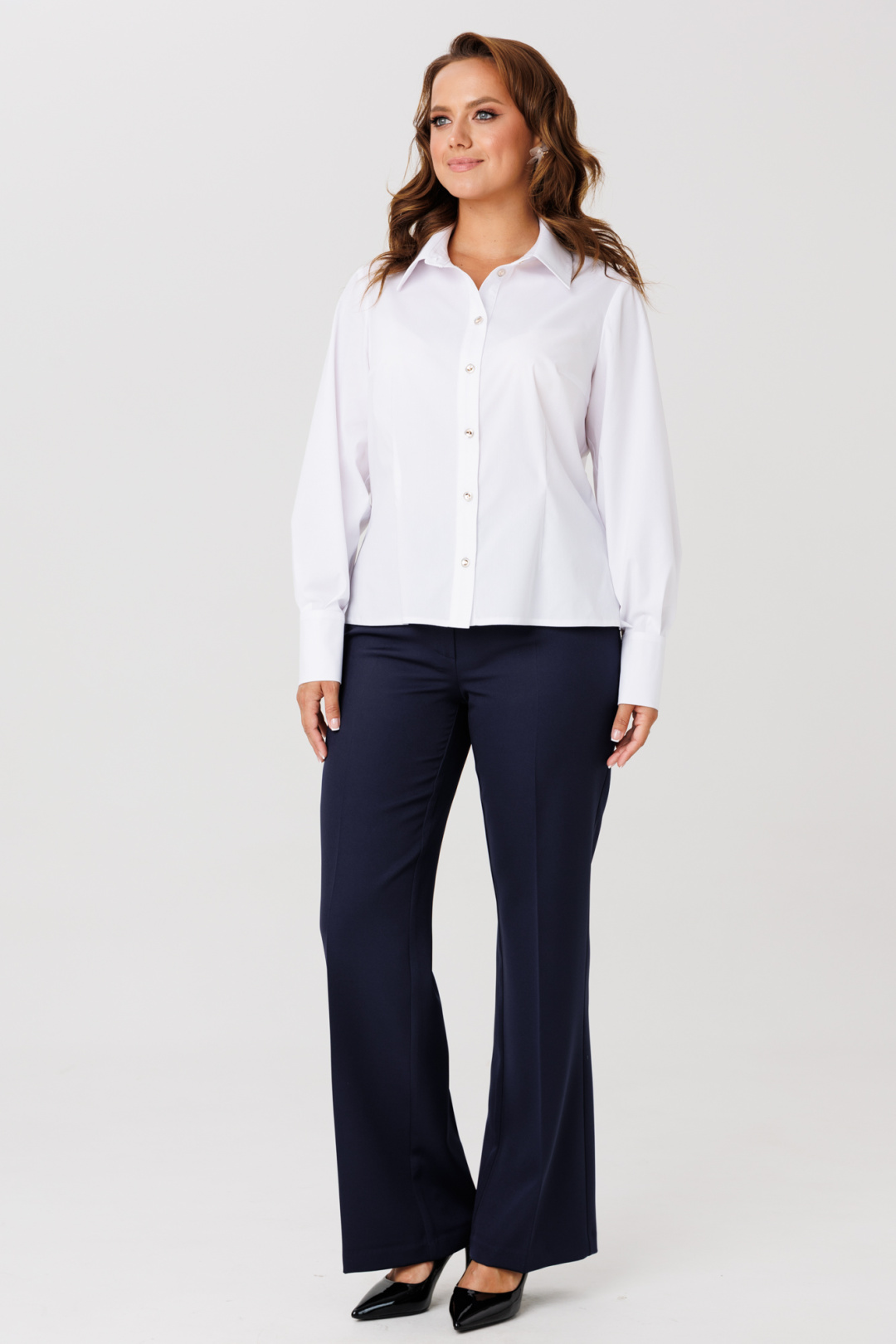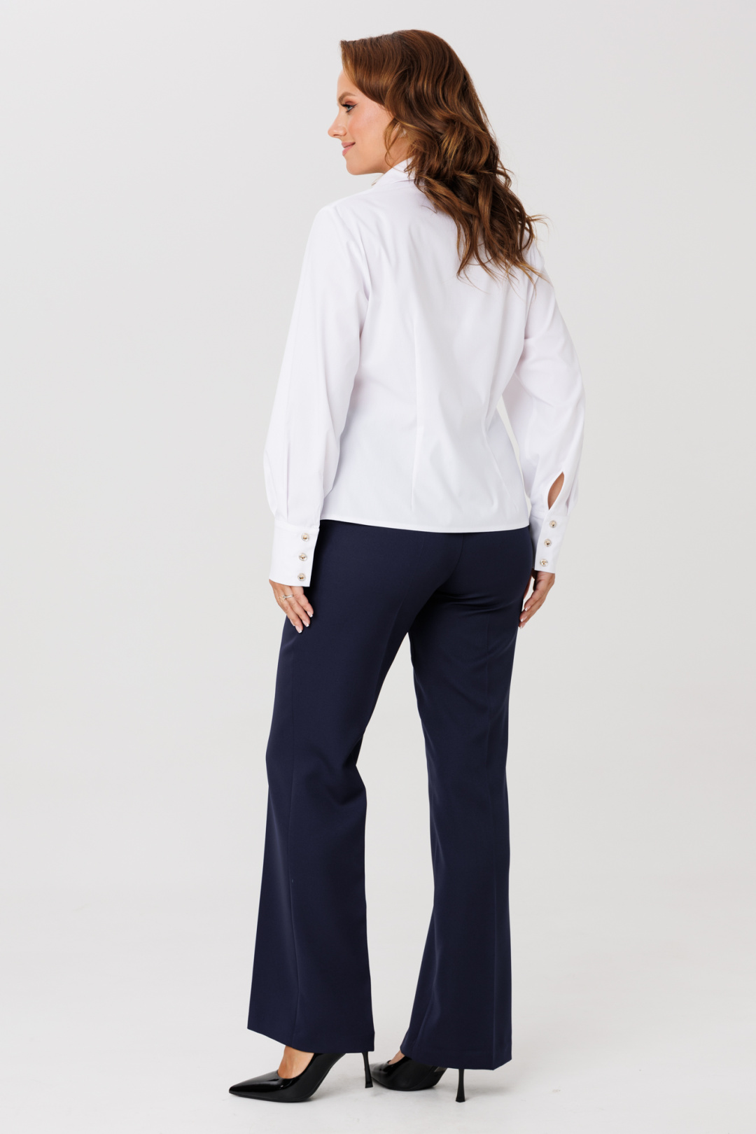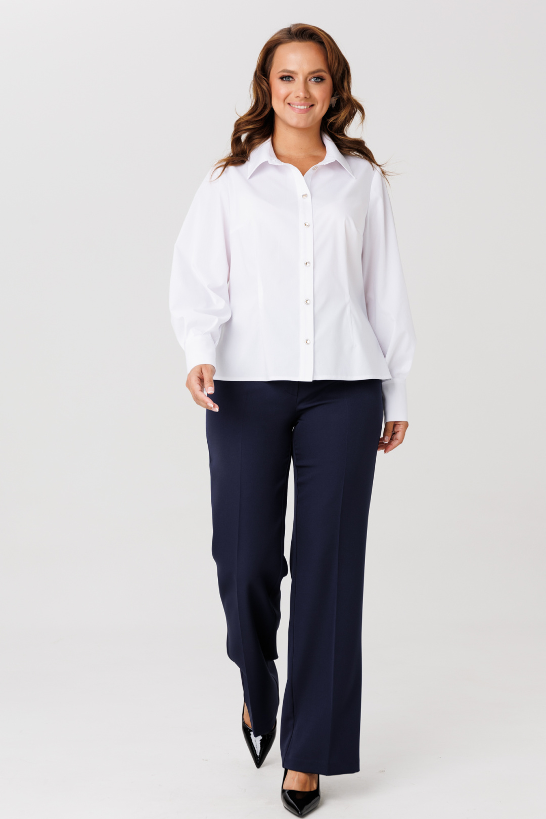 Блуза полуприлегающего силуэта, выполнена из хлопка (чуть тянется). По переду нагрудные вытачки, центральная застежка на петли-пуговицы. По спинке талиевые вытачки. Горловина оформлена рубашечным воротником со стойкой. Рукава втачные, одношовные со складками и притачной манжетой по низу, застегивающейся на пуговицы.