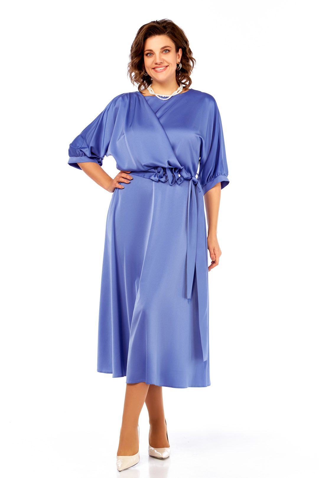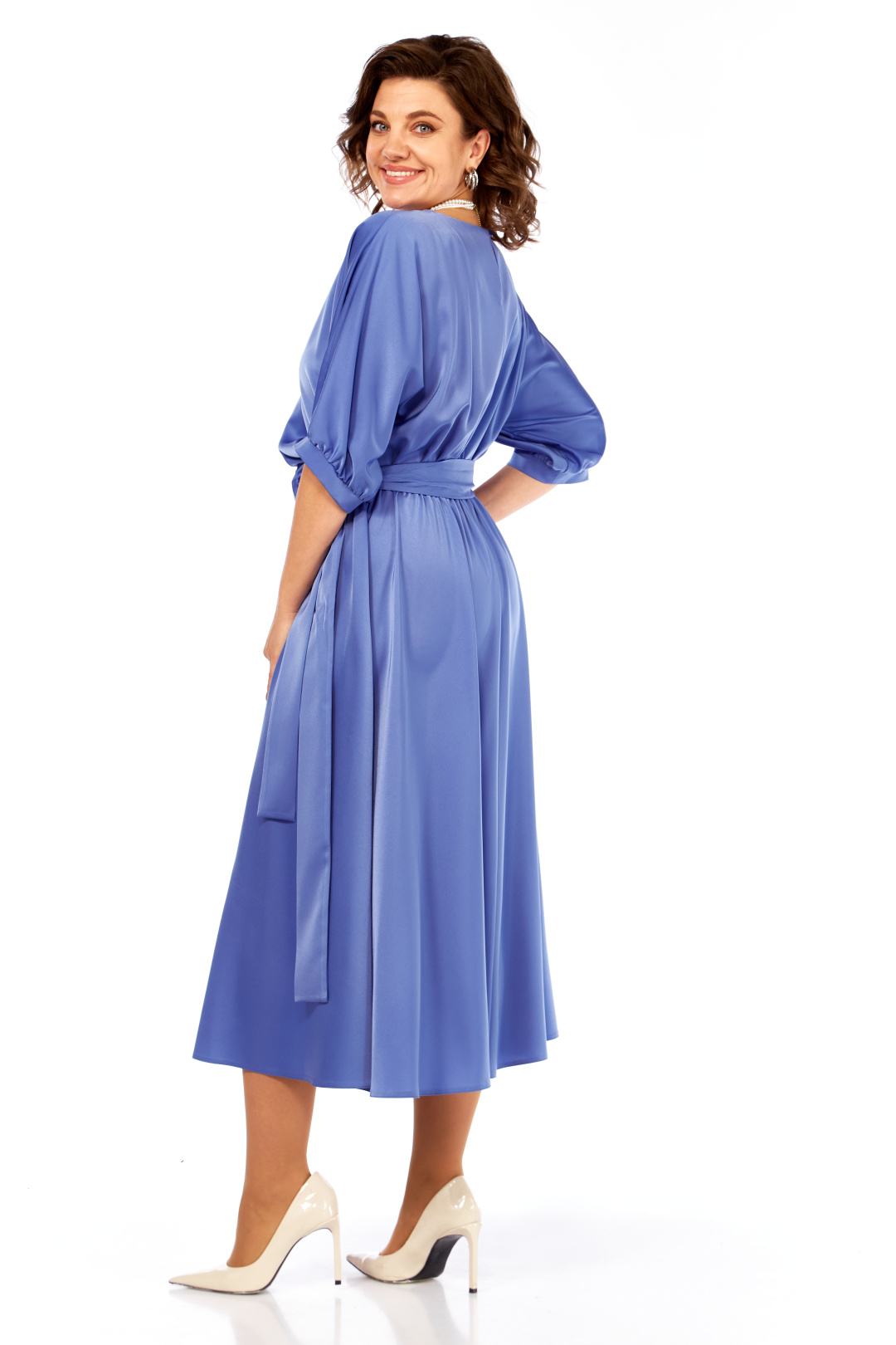 Нарядное платье из струящейся ткани, отрезное по линии талии. Верх летучая мышь, по низу рукава сборка и притачная манжета. Вырез горловины округлой формы. По переду ассиметричная деталь от плеча до линии подреза. По линии подреза резинка. Нижняя часть платья клеш. К платью прилагается интересный пояс, украшенный стразами. Длина платья 124см, длина рукава от горловины 46см