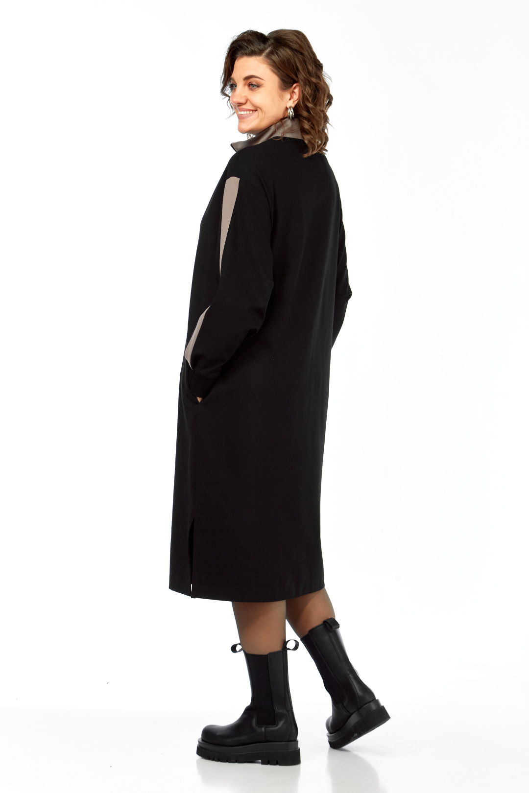Платье в стиле спорт-шик прямого силуэта, с воротником-стойкой. По переду, по центру контрастная отделка, молния, переходящая в воротник, декоративная нашивка. В боковых швах карманы и разрезы в низу. Рукав апущенный на манжете, с контрастными полосками.