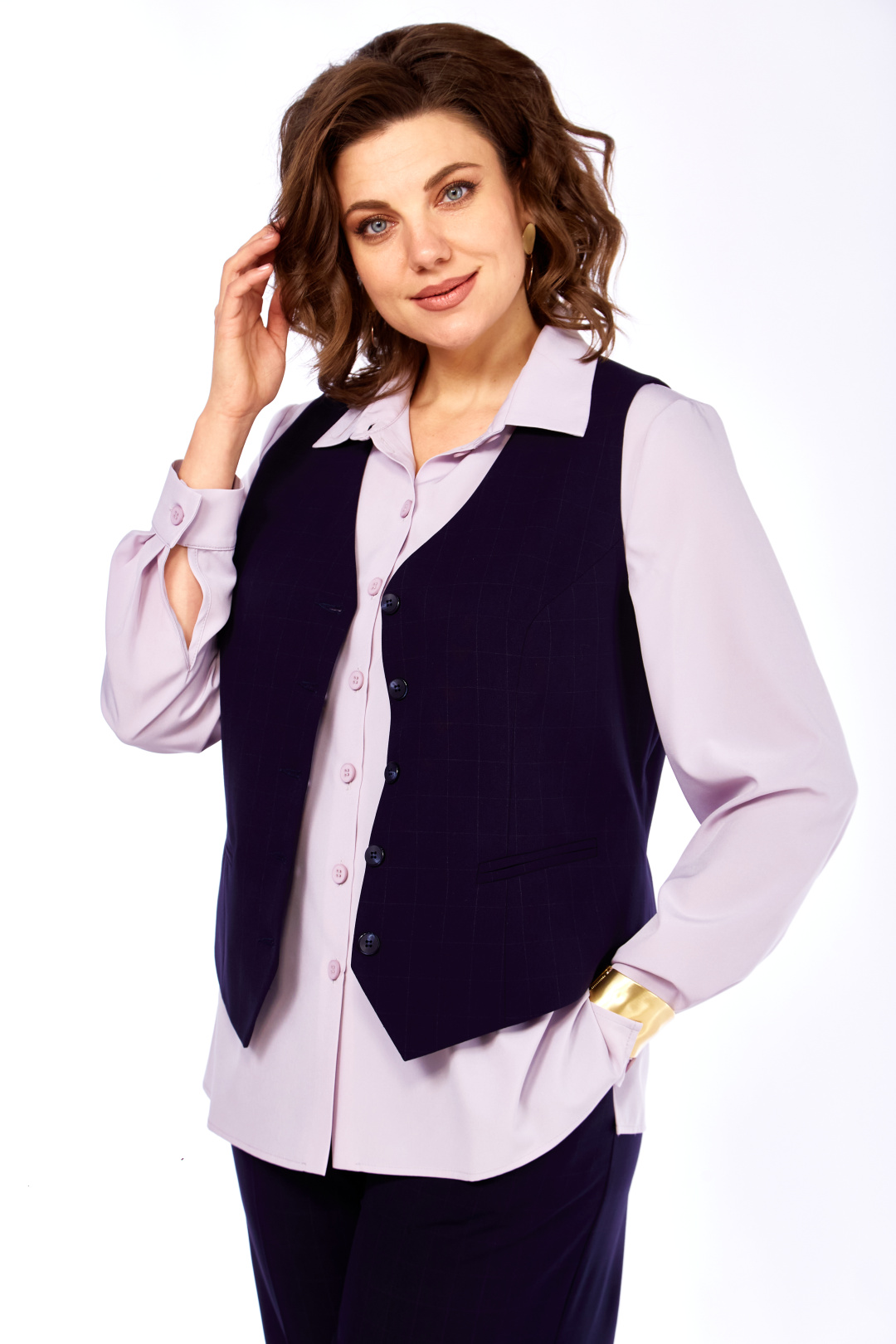 Комплект женский, состоит из блузки, жилета и брюк. Полуприлегающий силуэт, жилет с V-образной формой горловины, на переде рельефы от проймы, имитация карманов с клапаном, по спинке хлястик с пуговицей. Блузка с рубашечным воротником и застежкой на петли и пуговицы, нагрудные вытачки, рукав одношовный с манжетой. Разрезы в боковых швах. Брюки прямые, с карманами. Пояс по спинке на резинке. На переде и спинке заутюжены стрелки. Длина жилета 49см, блина блузки 70см, длина брюк 111см.