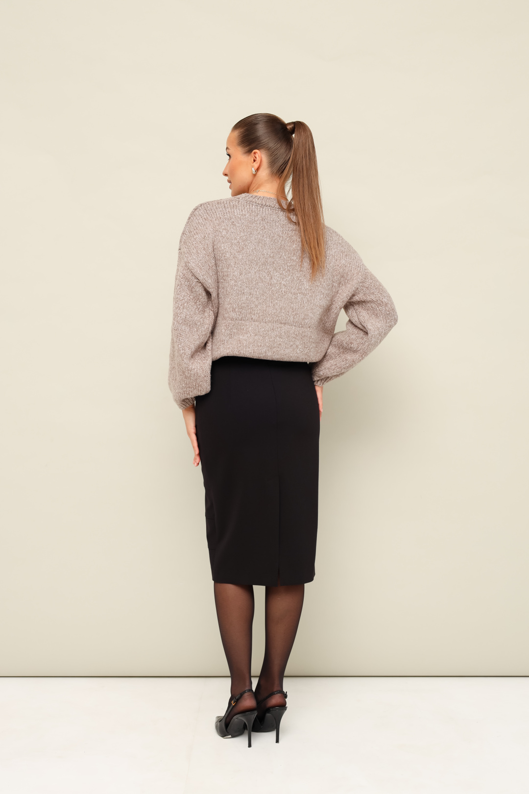 Юбка-карандаш с посадкой на талии и горизонтальными подрезами по переду. Обтачной пояс, застежка на потайную тесьму-молнию в среднем шве спинки. Для удобства движения сзади обработана шлица. В юбке предусмотрены шлевки. В комплекте прилагается акцентный ремень.
