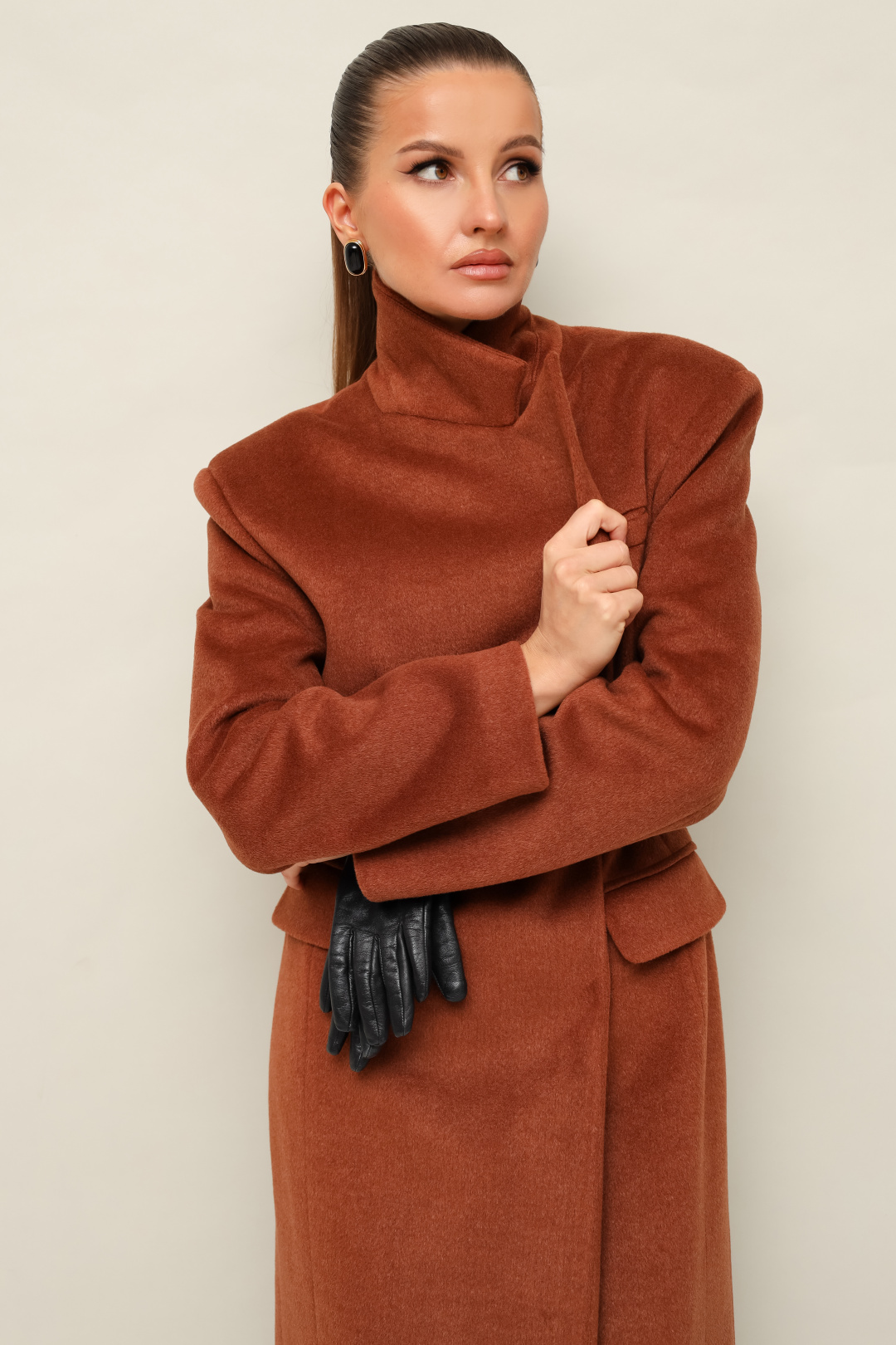 Демисезонное пальто прямого силуэта, выполнено из качественной пальтовой ткани. Воротник пиджачного типа с отложными лацканами. Двубортная застёжка на потайные пришивные кнопки. Слегка удлиненный плечевой шов. Спереди обработаны прорезные карманы в рамку с клапанами и нагрудный прорезной карман с листочкой. Рукава втачные, двухшовные. Спинка со средним швом, переходящим в шлицу. Пальто на подкладке.