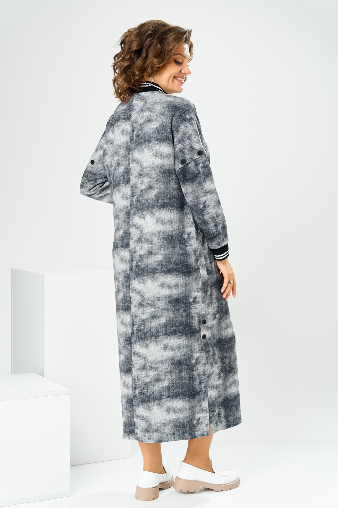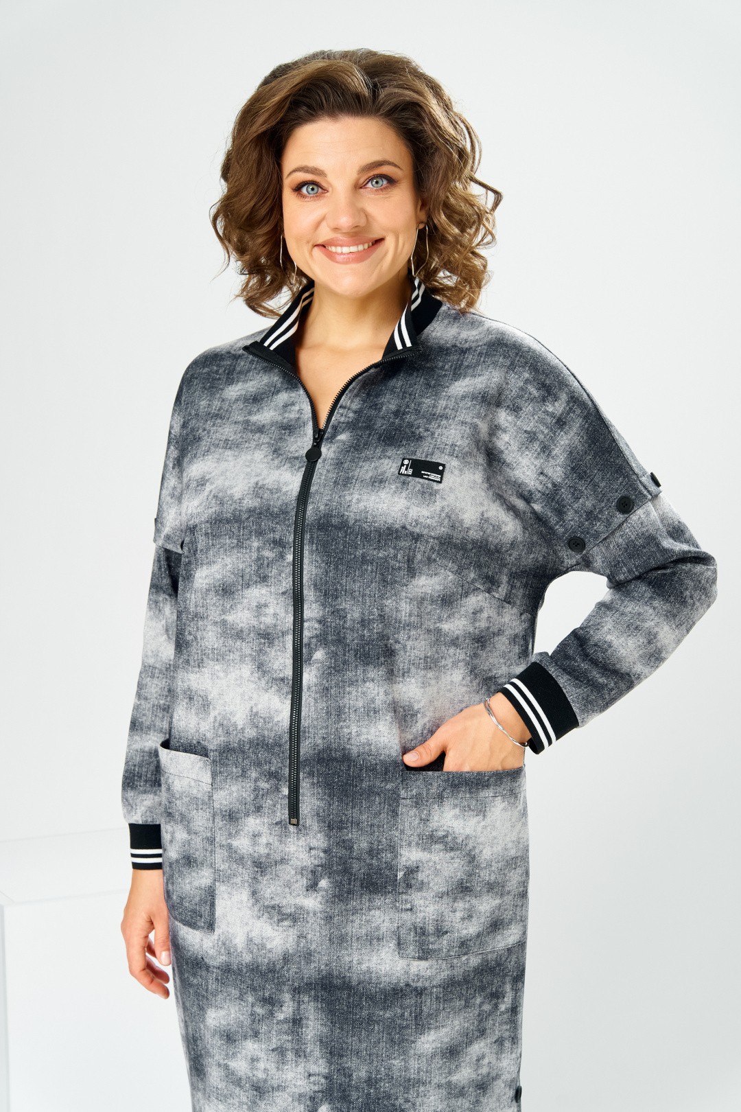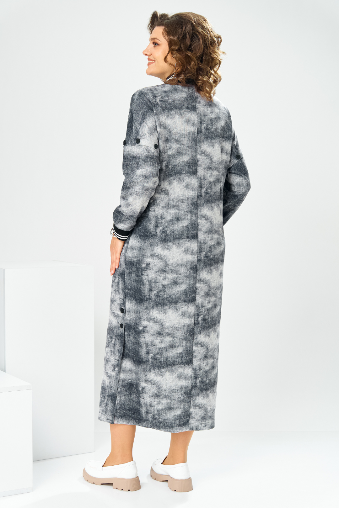 Платье женское, предназначено для повседневной носки. Платье женское прямого силуэта, длиной до нижней части икры. Перед с 2-мя нагрудными выточками с настрочной аппликацией на левой части переда на уровне линии груди, с 2-мя накладными прямоугольными карманами на уровне линии бёдер. Спинка со средним швом и 2-мя таллиевыми вытачками. Боковые швы внизу со шлицами закреплёнными пришивными пуговицами. Горловина круглая с втачной отделочной стойкой. Застёжка на втачную тесьму-молнию по центру переда. Платье с цельнокроенным рукавом с горизонтальным подрезом, с верхней части сформирована цельнокроенная планка, закреплённая на нижней 4-мя пришивными пуговицами. Рукав длинный с притачной отделочной манжетой. Платье без плечевых накладок. Длина спинки платья 127 см, ширина рукава под проймой 22 см.