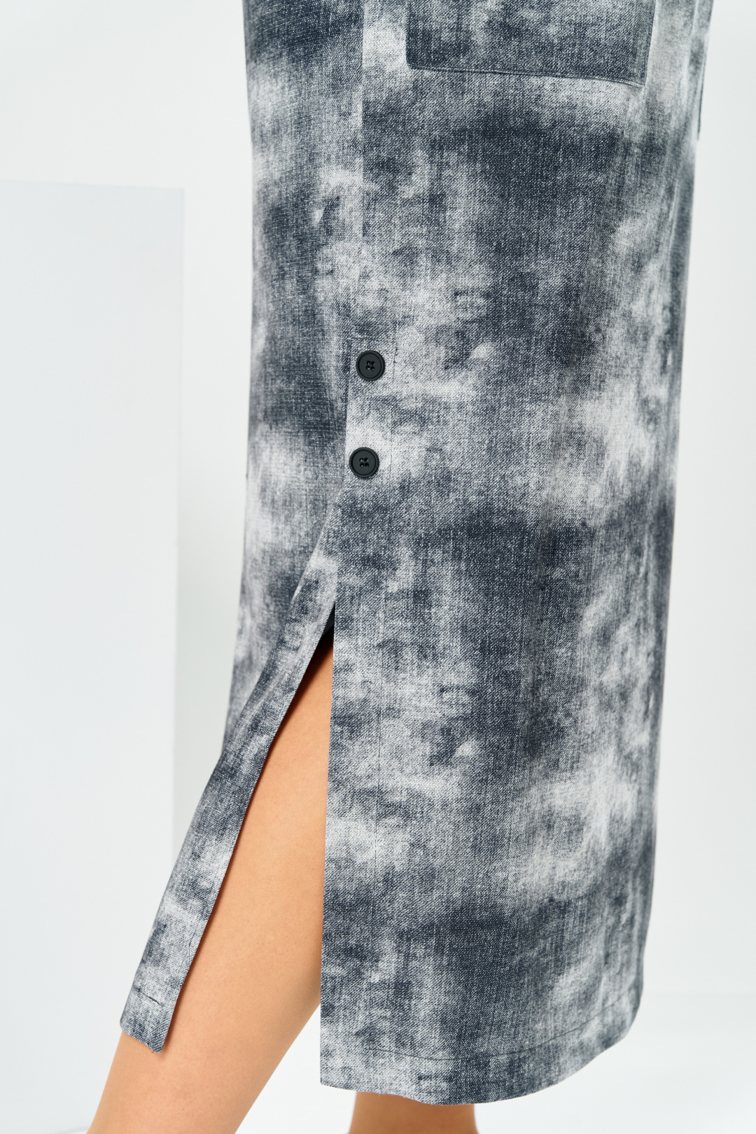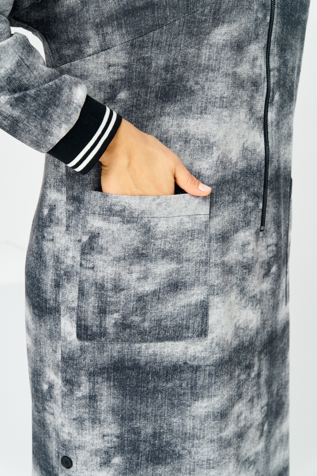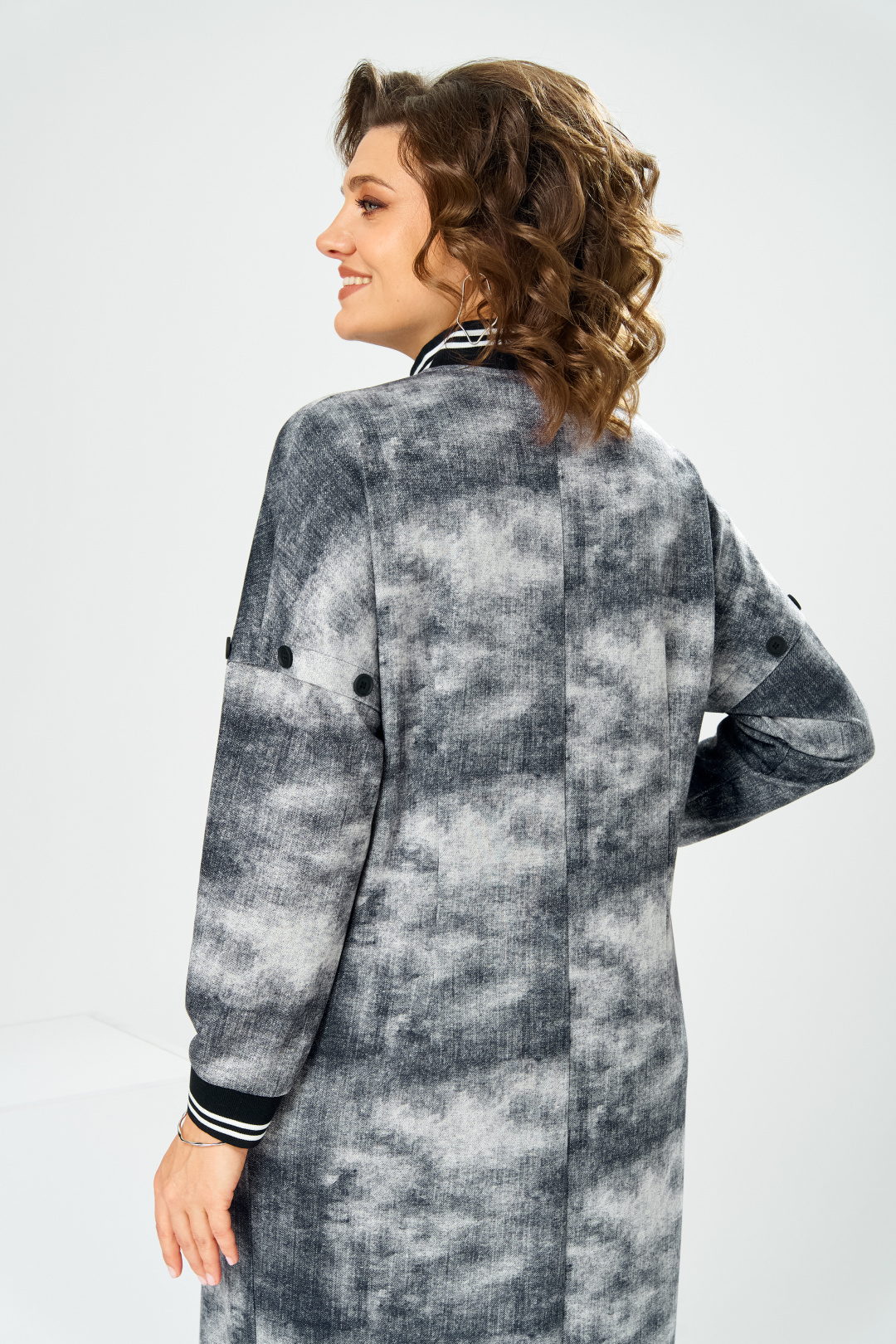 Платье женское, предназначено для повседневной носки. Платье женское прямого силуэта, длиной до нижней части икры. Перед с 2-мя нагрудными выточками с настрочной аппликацией на левой части переда на уровне линии груди, с 2-мя накладными прямоугольными карманами на уровне линии бёдер. Спинка со средним швом и 2-мя таллиевыми вытачками. Боковые швы внизу со шлицами закреплёнными пришивными пуговицами. Горловина круглая с втачной отделочной стойкой. Застёжка на втачную тесьму-молнию по центру переда. Платье с цельнокроенным рукавом с горизонтальным подрезом, с верхней части сформирована цельнокроенная планка, закреплённая на нижней 4-мя пришивными пуговицами. Рукав длинный с притачной отделочной манжетой. Платье без плечевых накладок. Длина спинки платья 127 см, ширина рукава под проймой 22 см.