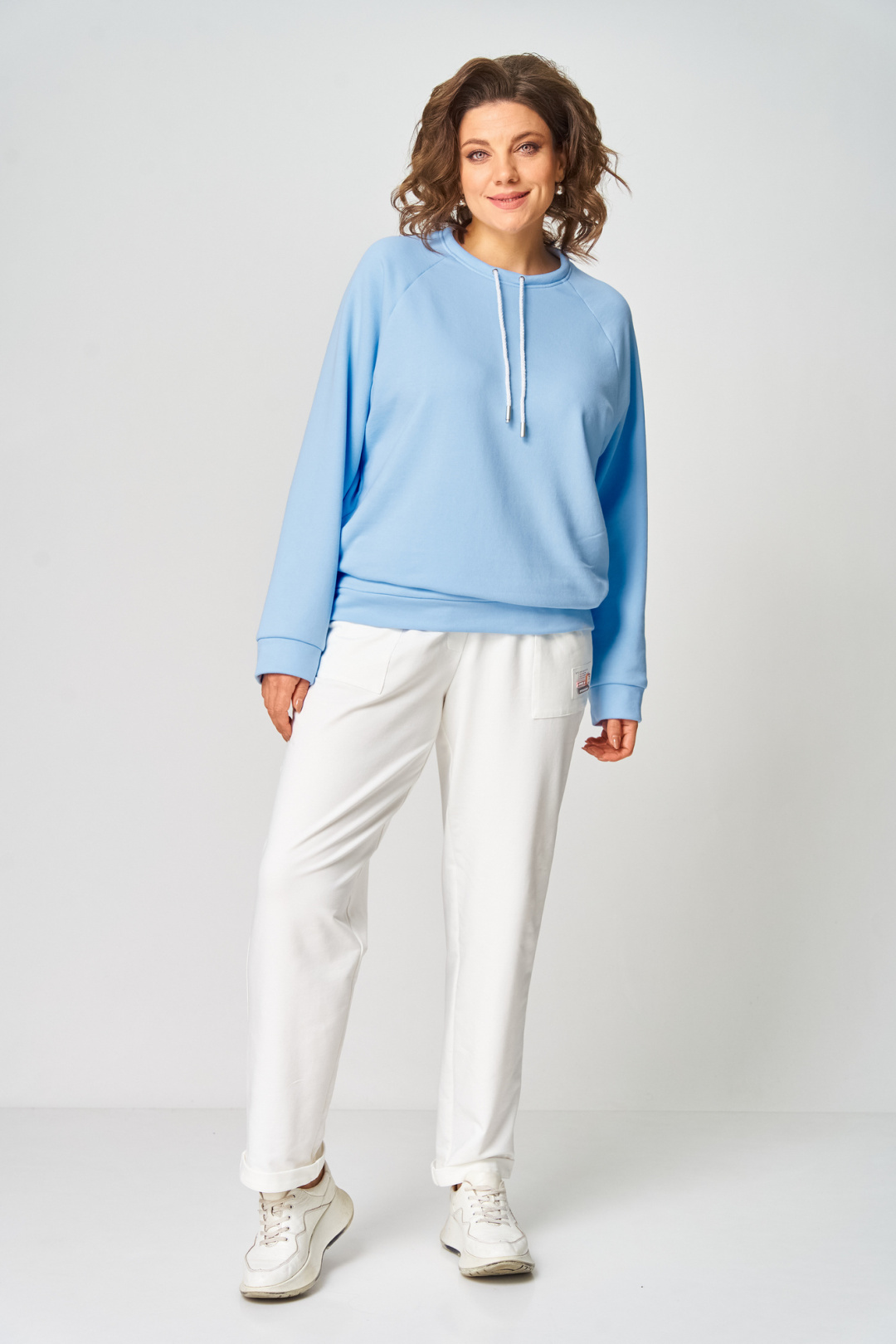 Брюки женские из трикотажной ткани (двунитка), слегка заужены к низу. По переду брюк расположены накладные карманы. На левом кармане настрочной декоративный элемент. В пояс вставлена резинка по кругу.