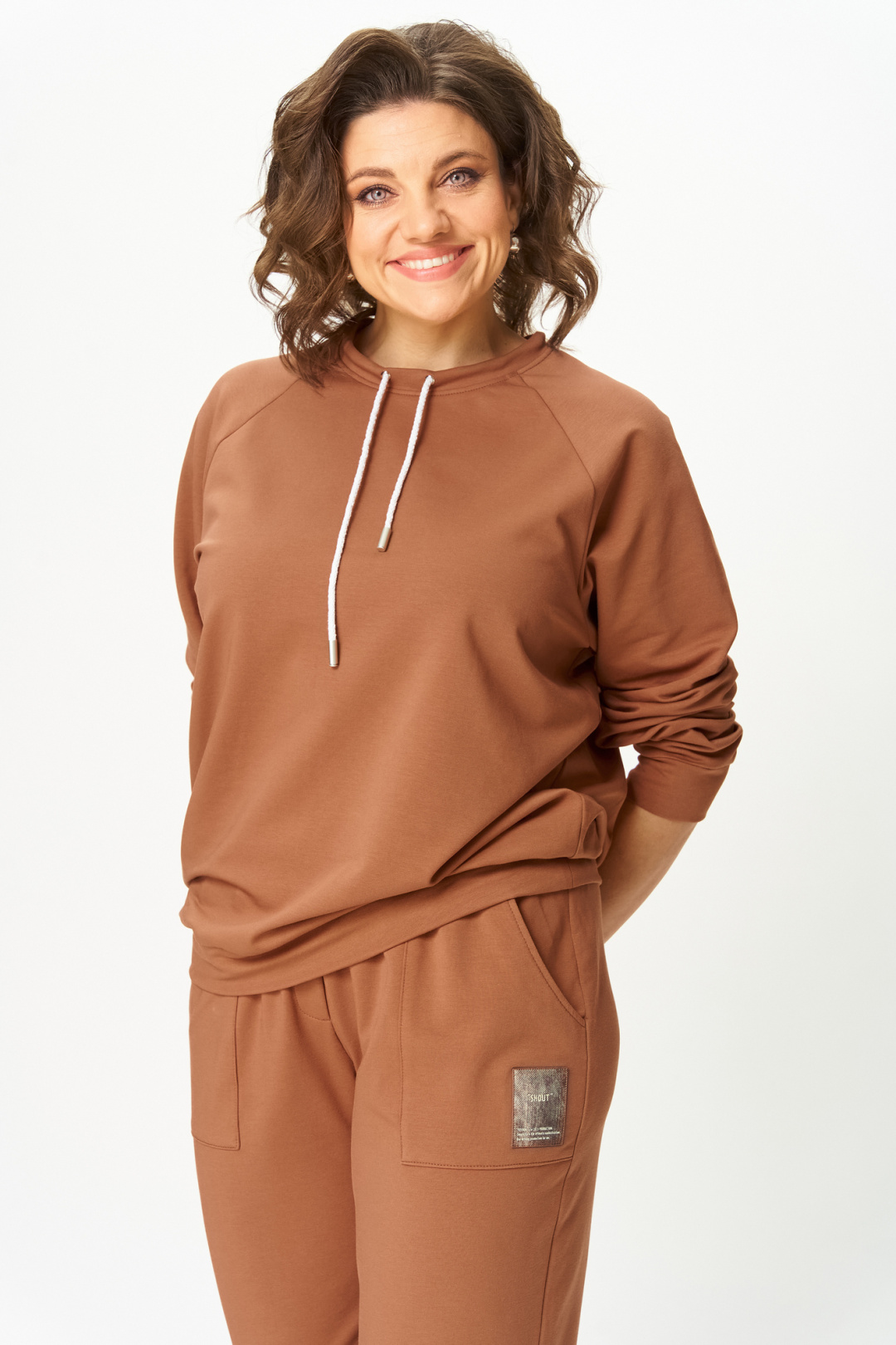 Джемпер женский из трикотажной хлопковой ткани (трехнитка). Рукав реглан. Низ рукава обработан притачной манжетой. Низ изделия оформлен притачным поясом. На спинке настрочен декоративный элемент. Вырез горловины круглый, обработан бейкой со шнуром.