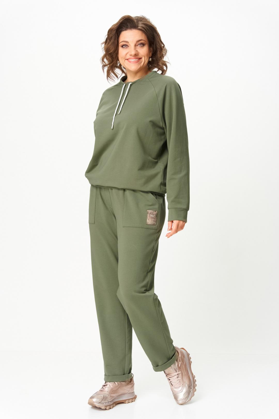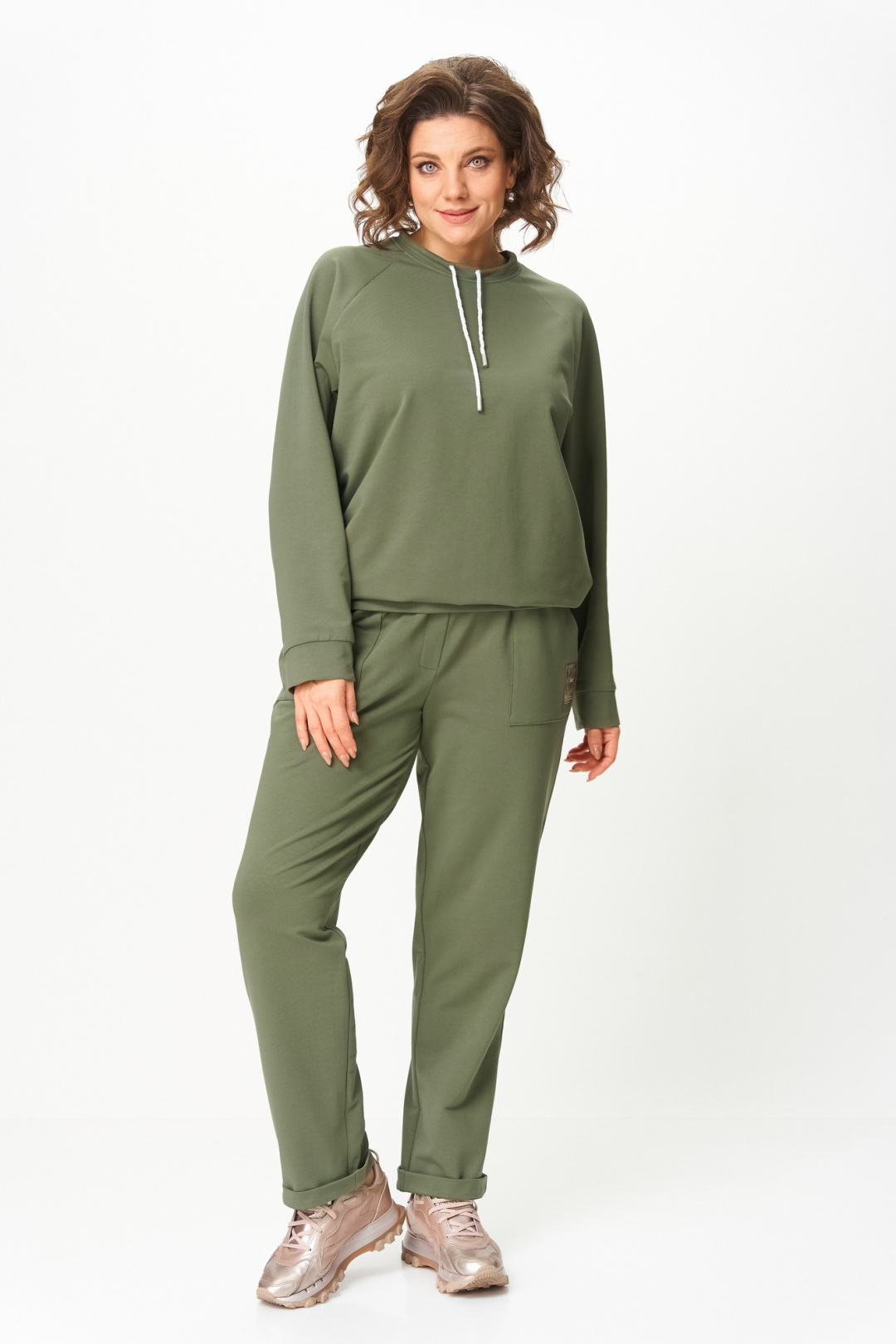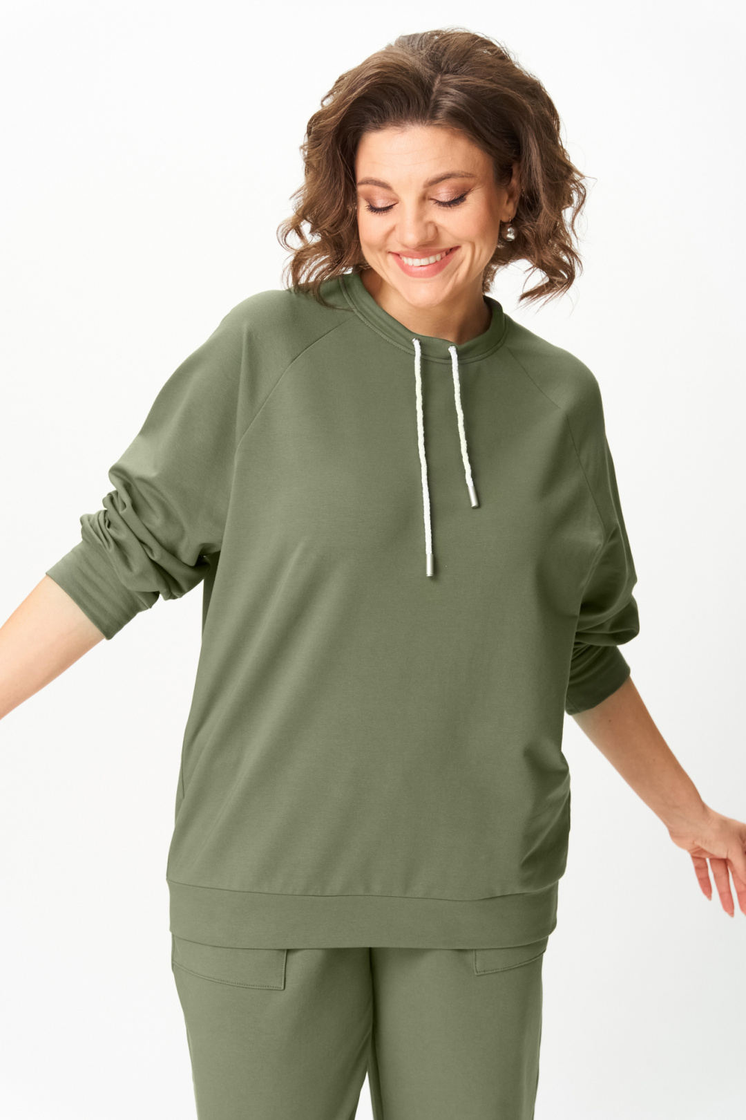 Джемпер женский из трикотажной хлопковой ткани (трехнитка). Рукав реглан. Низ рукава обработан притачной манжетой. Низ изделия оформлен притачным поясом. На спинке настрочен декоративный элемент. Вырез горловины круглый, обработан бейкой со шнуром.