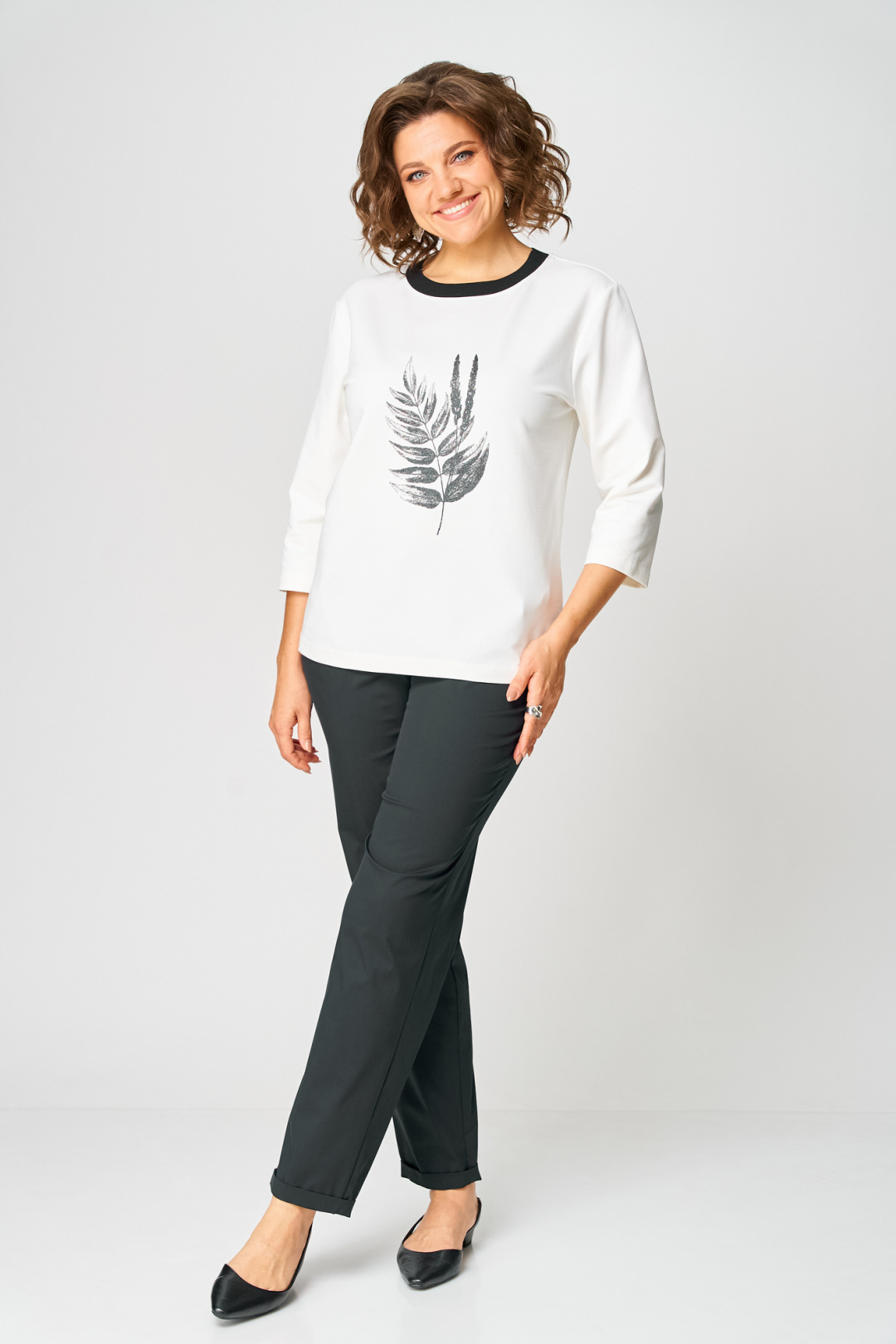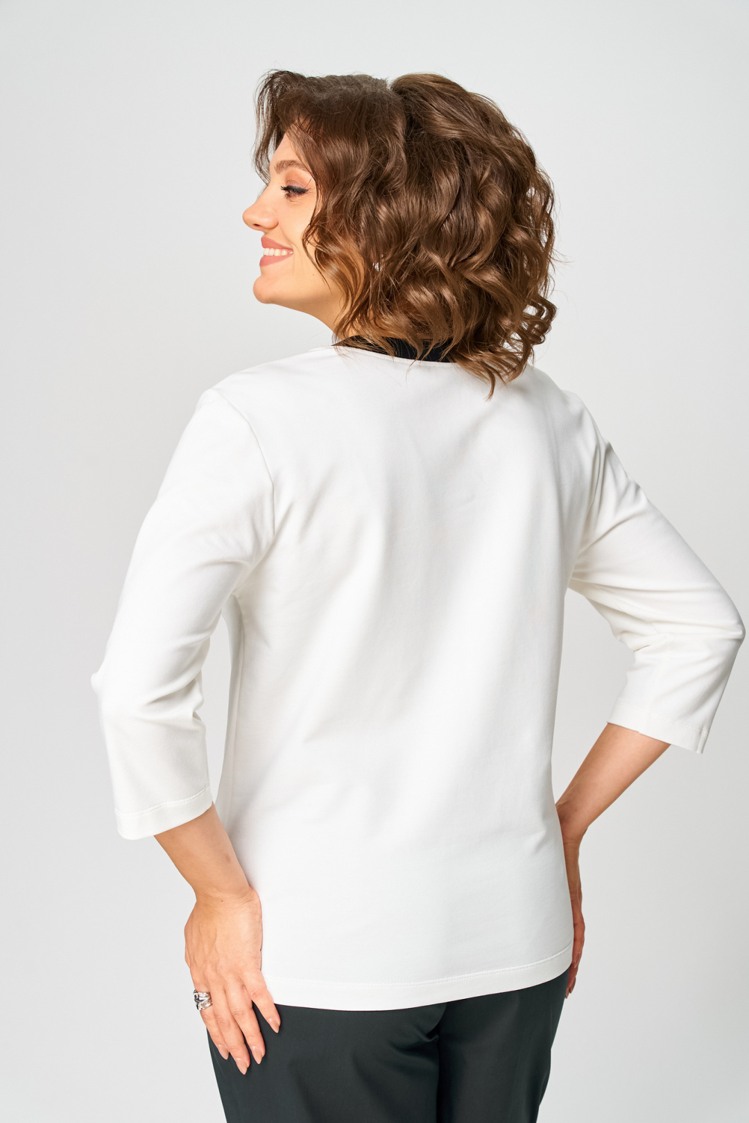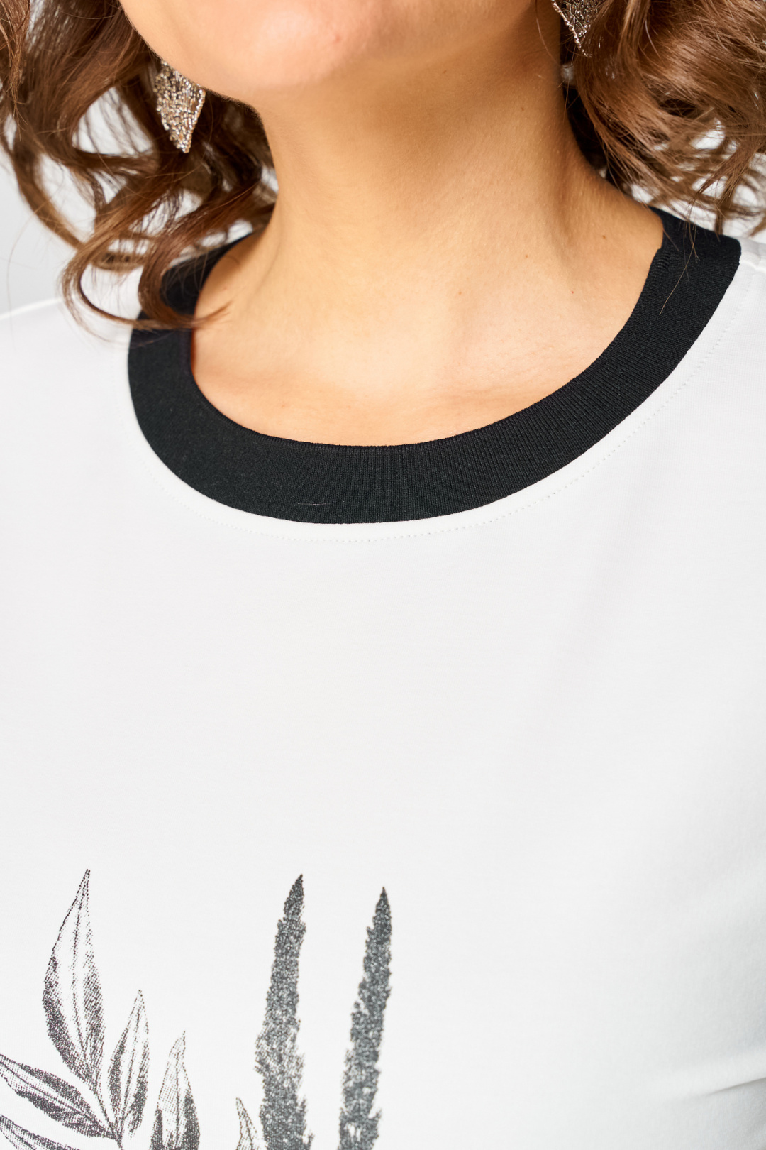 Джемпер женский из трикотажной хлопковой ткани (двунитка). По переду расположен принт. Рукав прямой втачной. Рукав 3/4. Вырез горловины круглый, обработан довязом.