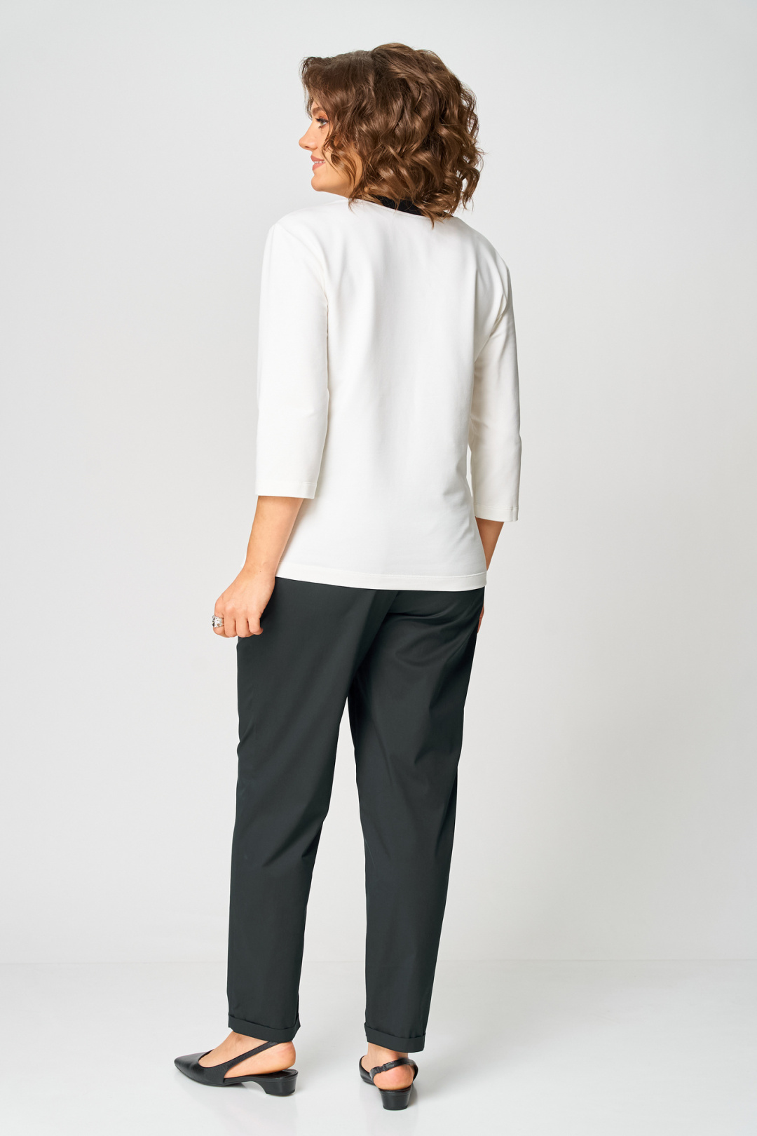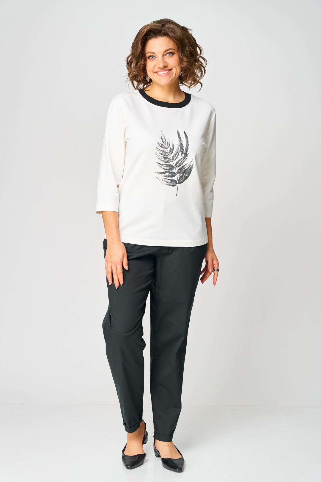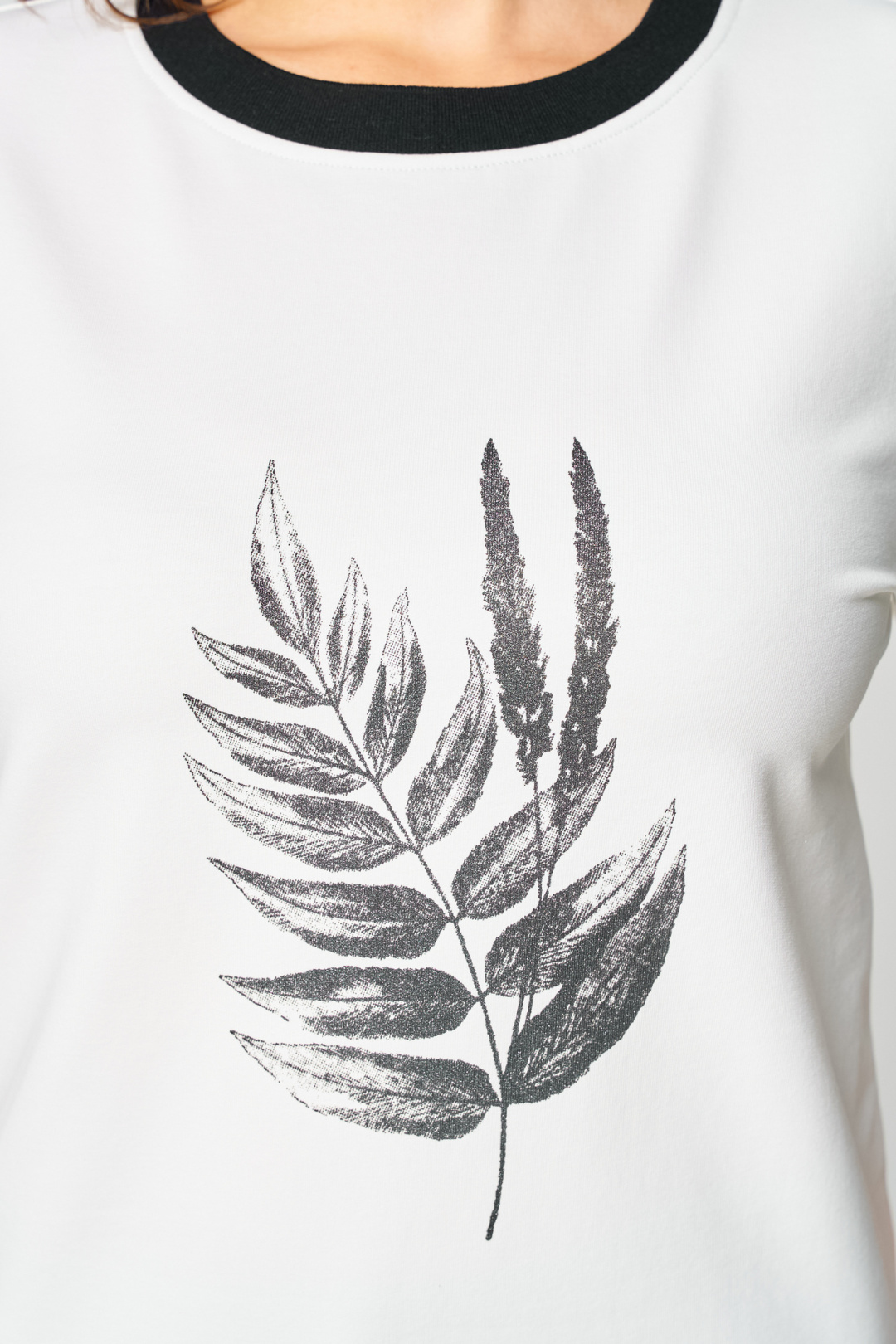 Джемпер женский из трикотажной хлопковой ткани (двунитка). По переду расположен принт. Рукав прямой втачной. Рукав 3/4. Вырез горловины круглый, обработан довязом.