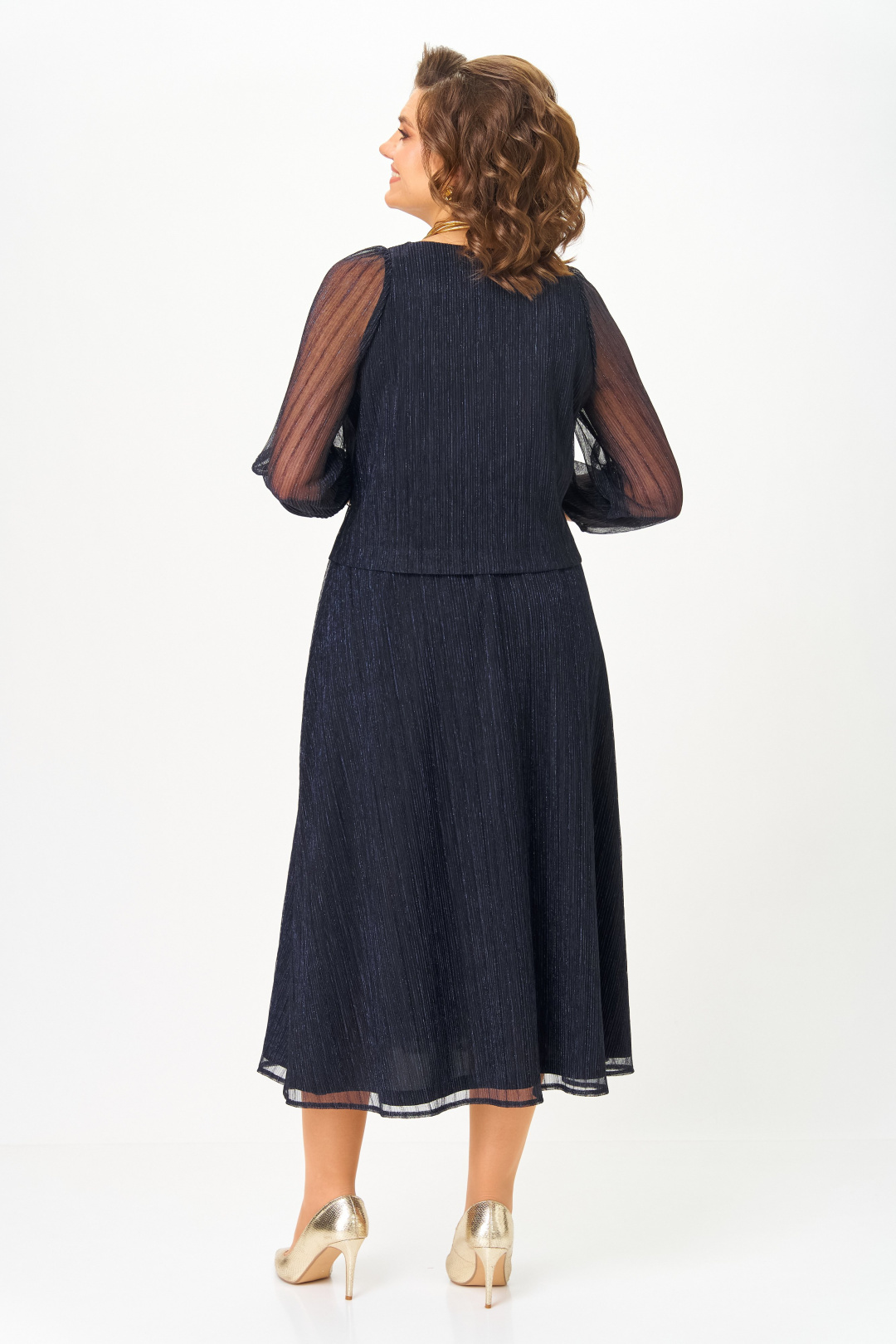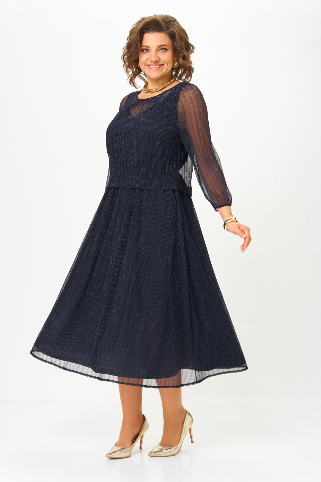 Платье Х-образного силуэта, отрезное по линии талии с расширенной линией низа и 2-ух слойным лифом-имитация костюма. Лиф на подкладке, верхняя часть отлетная по низу, перед и спинка цельнокроеные. Вырез горловины верхнего переда - круглый со сборкой по центру. Вырез горловины подкладки переда V- образный фигурной формы. Линия плеча укорочена на 3см от естественной. Рукав полуреглан, одношовный со сборкой по окату, низ на резинке. Юбка колокол на подкладке, с боковыми швами. Шов талии на резинке.