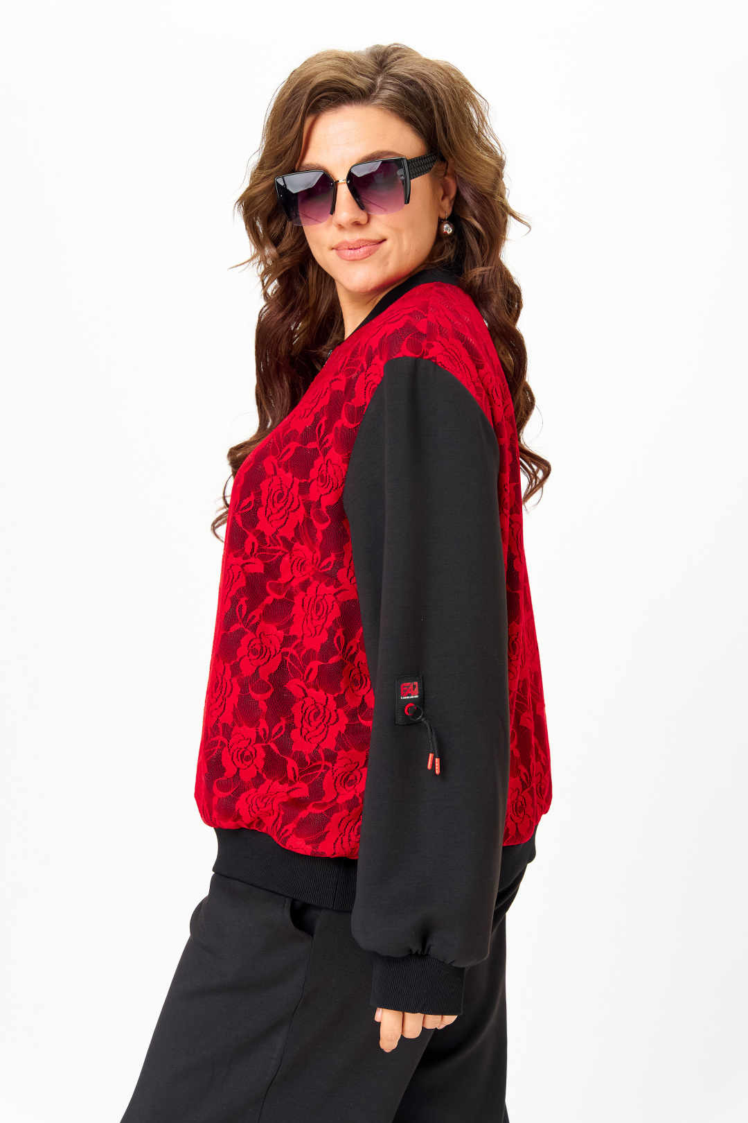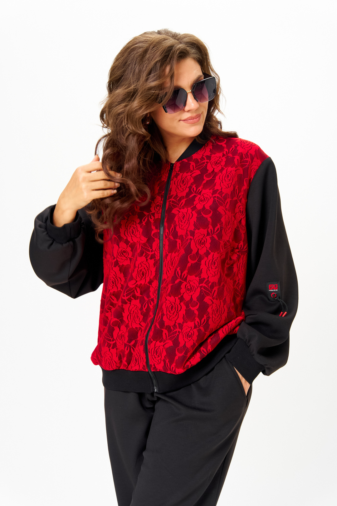 Костюм женский спортивный, состоящий из бомбера и брюк. Легкий джемпер-бомбер, предназначен для молодых и стильных женщин. Выполнен из двойной костюмно-плательной ткани. Перед и спинка выполнены из гипюра. Стойка-воротника выполнена из ткани кашкорсе, из этой же ткани выполнены манжеты на рукавах. По центру изделия молния. Украшением изделия служит нашивка на рукаве.
