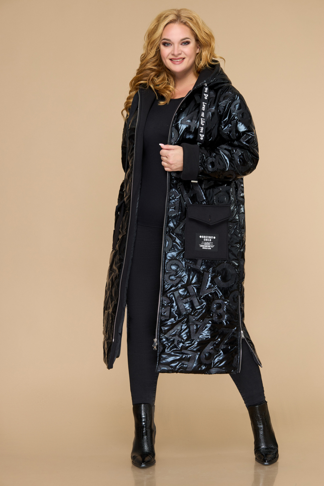 Пальто женское, прямого силуэта, со спущенной плечевой линией. По переду с накладными карманами с клапанами, которые застёгиваются на петлю и пуговицу, с центральной застёжкой на тесьму молнию. Рукав втачной, длинный, с отложной манжетой. По горловине капюшон с кулисой и декоративной тесьмой. В боковых швах разрезы с тесьмой молнией.