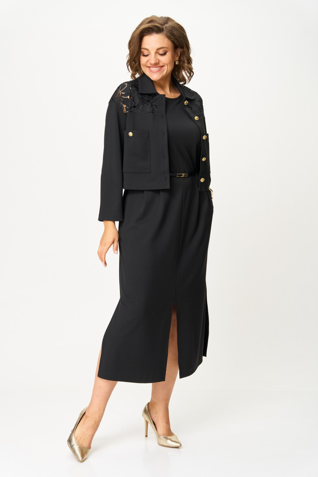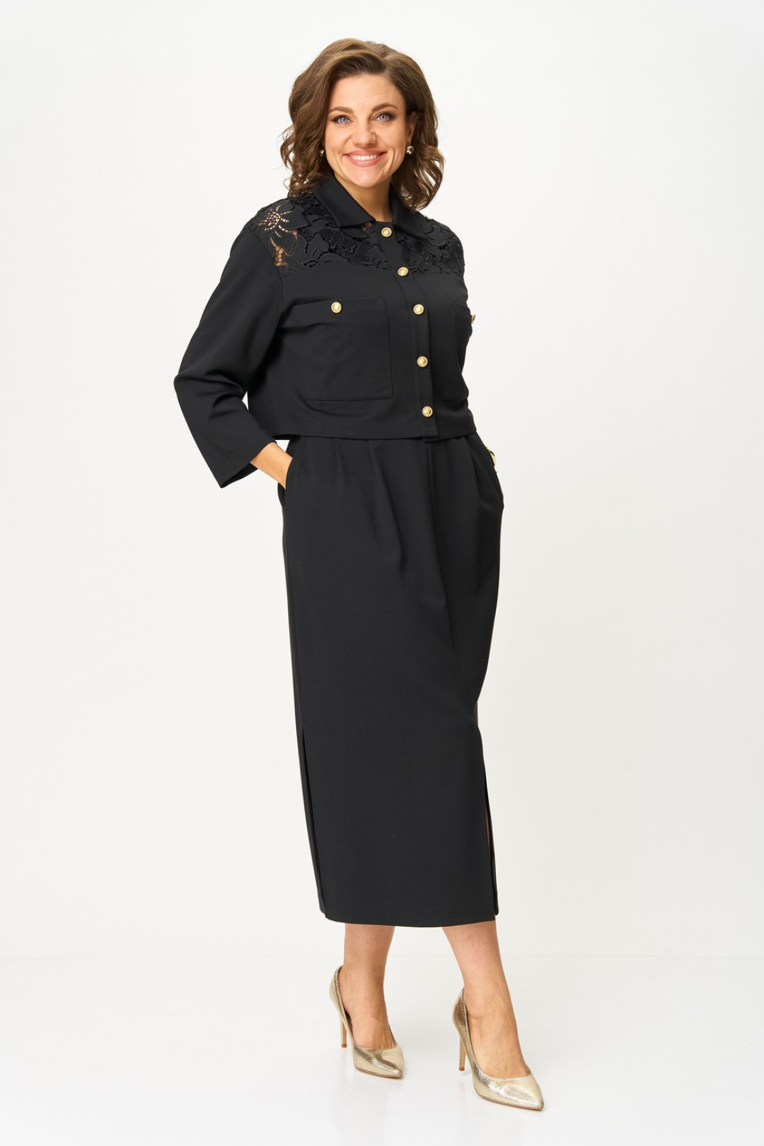 Жакет прямого кроя с застежкой на петли и пуговицы, с втачным рукавом. Линия плеча спущена, по горловине отложной воротник. По переду накладные карманы. Кокетка из кружева по переду и спинке добавляет романтичности и легкости.