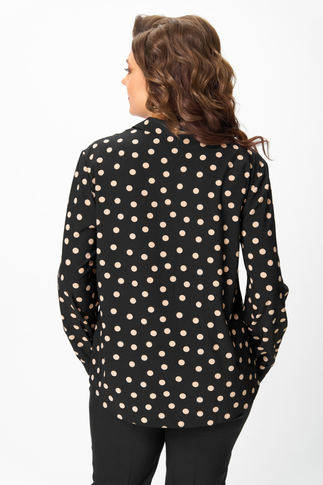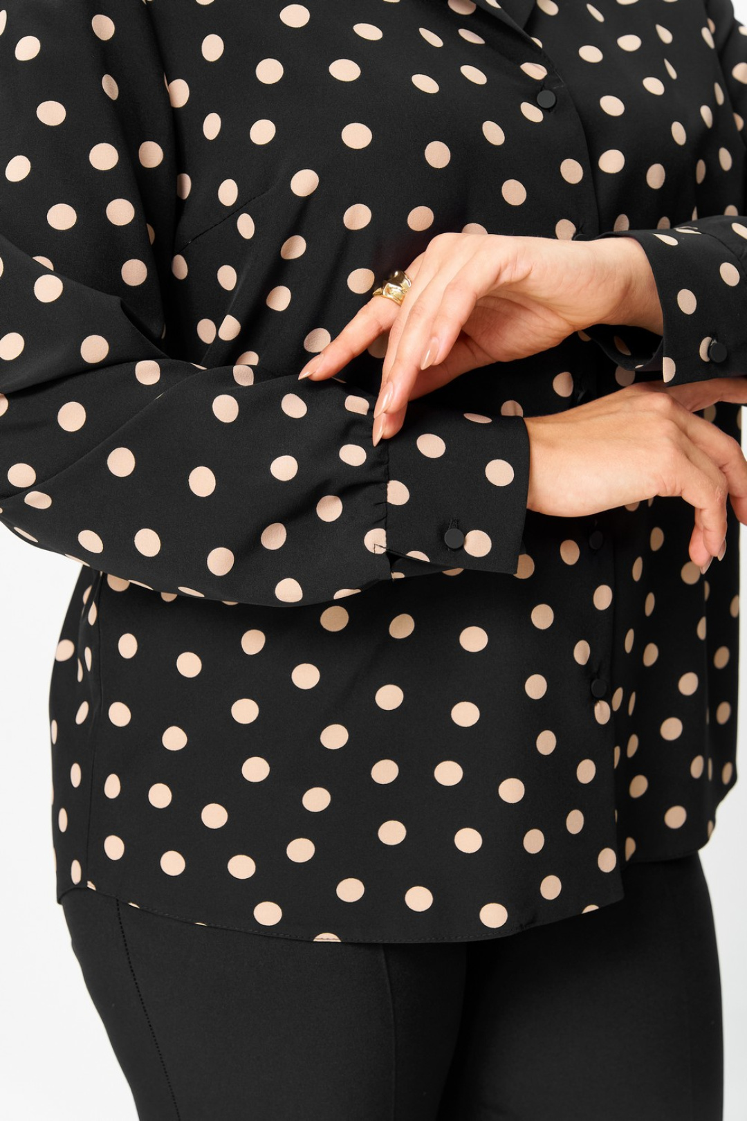 Блузка женская прямого силуэта с втачным рукавом. Линия плеча слегка спущена. Застежка центральная на петли и пуговицы. Воротник отложной с лацканами. По линии груди вытачки. Рукав длинный по низу со сборкой и притачной манжетой с застежкой петлю и пуговицу. Линия низа фигурная.