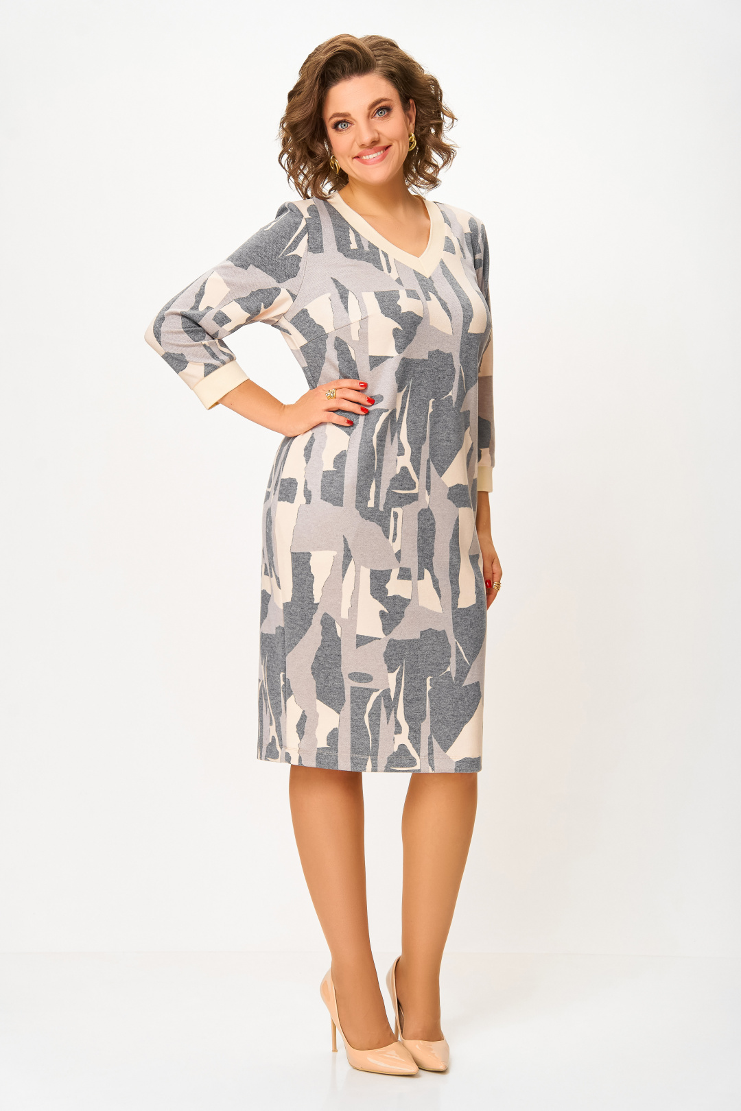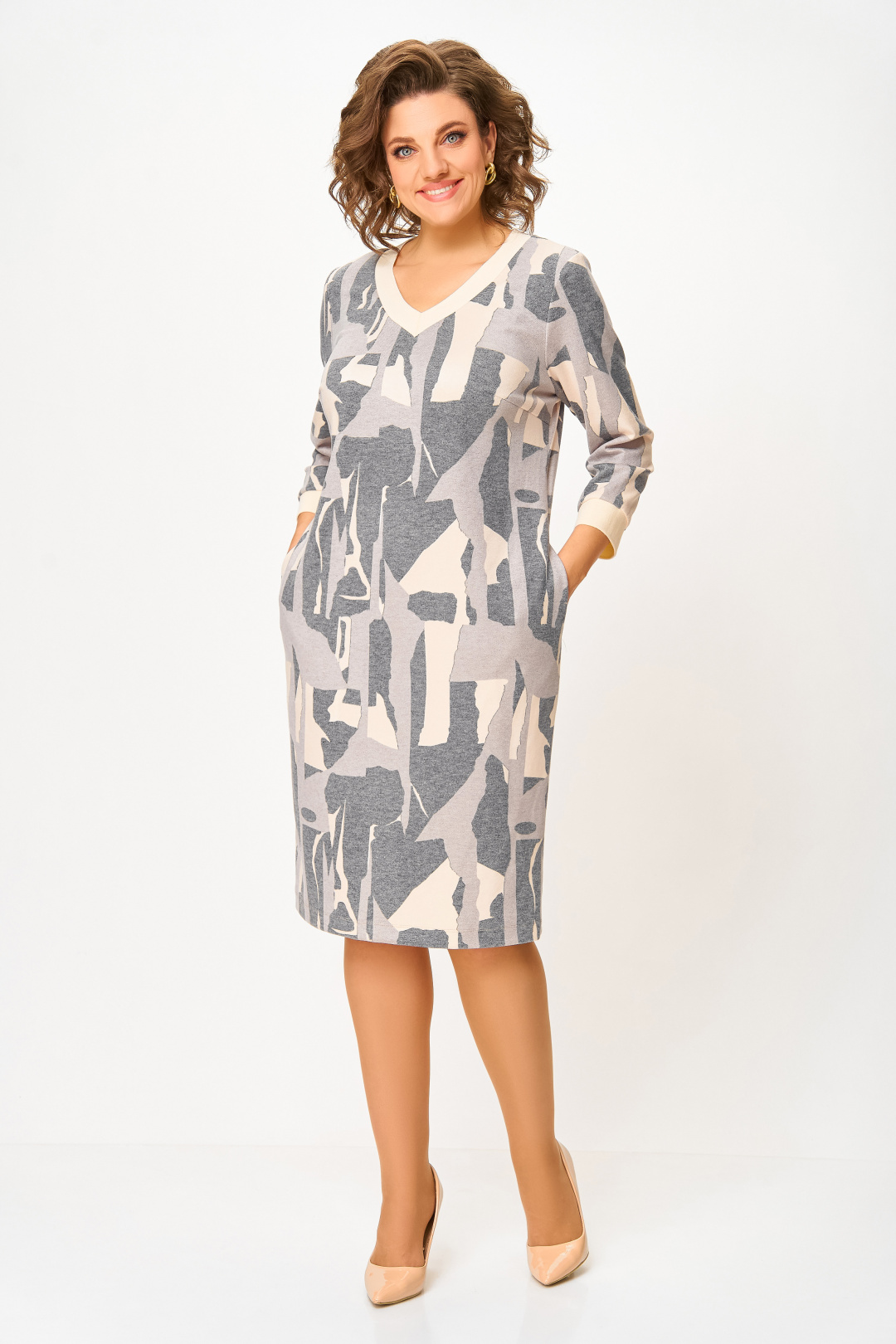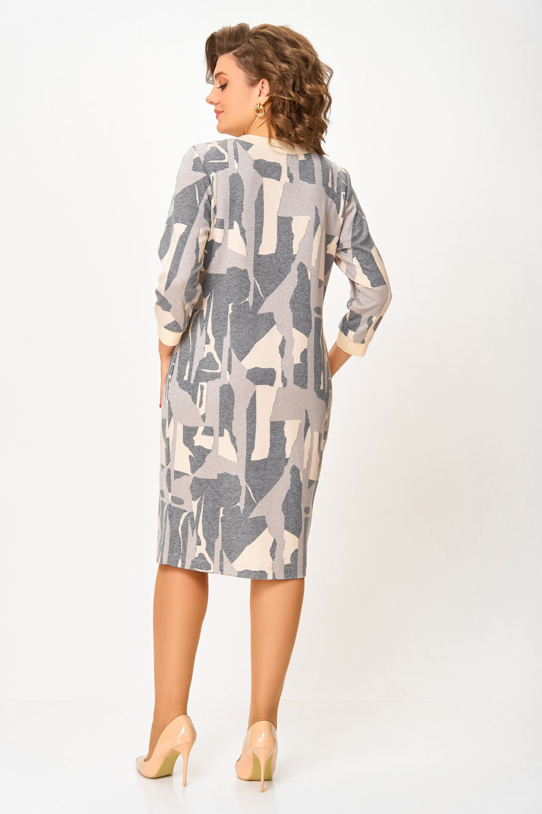 Платье из эластичного трикотажного полотна полуприлегающего силуэта. По переду обработаны нагрудные вытачки. Спинка цельнокроеная. Рукав втачной одношовный длиной 4/5 с манжетой из декоративного трикотажного довяза. В боковых швах обработаны карманы. Горловина V-оборазной формы, обработана декоративным трикотажным довязом.