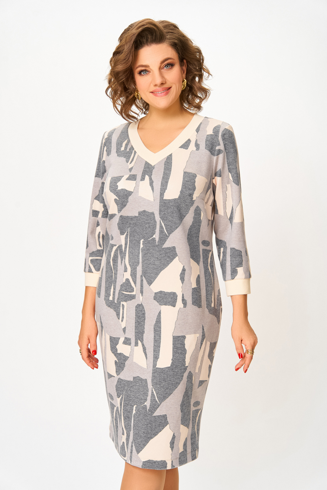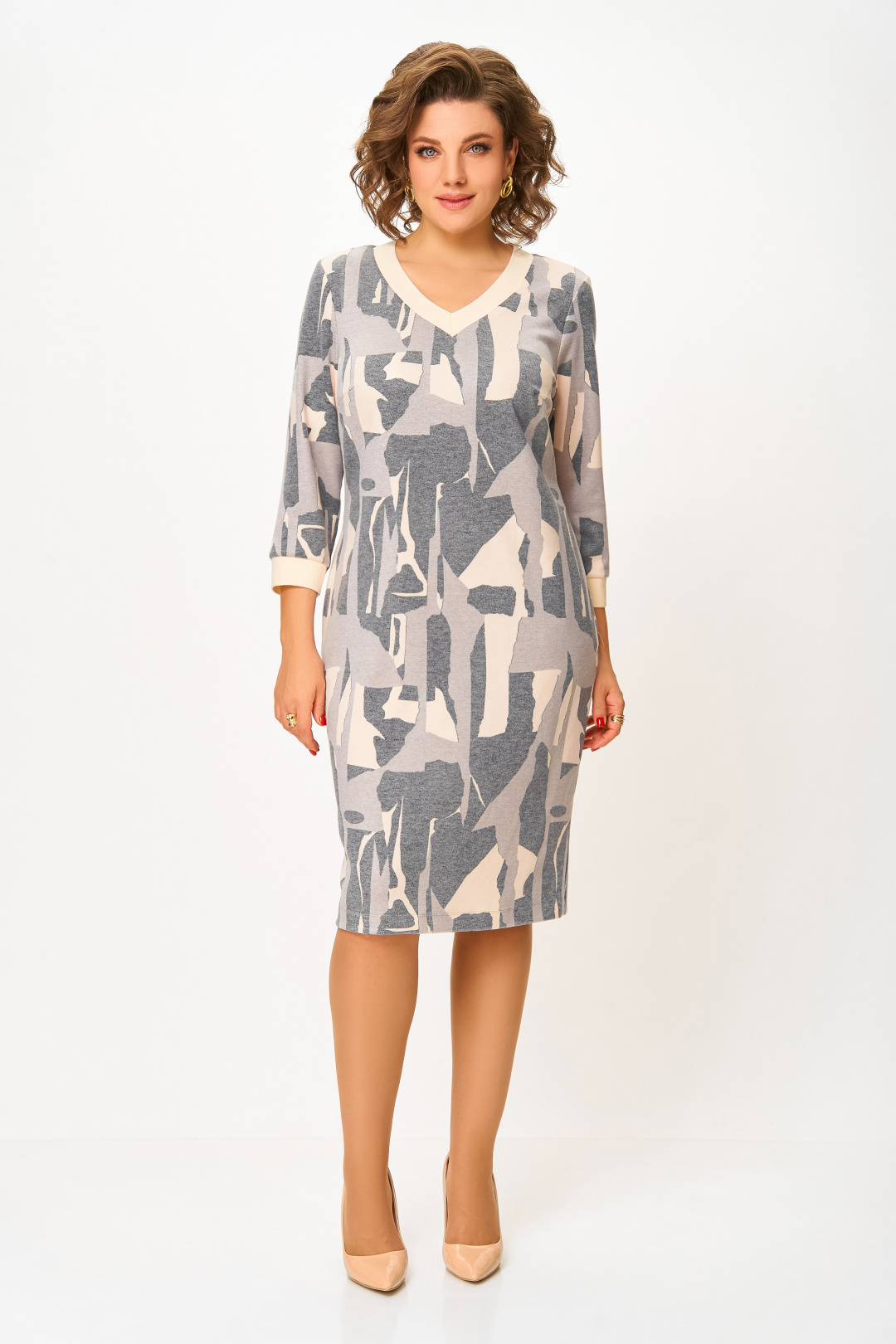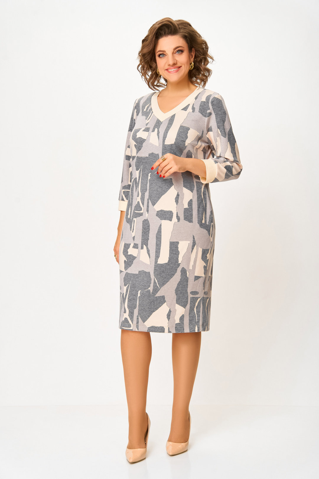 Платье из эластичного трикотажного полотна полуприлегающего силуэта. По переду обработаны нагрудные вытачки. Спинка цельнокроеная. Рукав втачной одношовный длиной 4/5 с манжетой из декоративного трикотажного довяза. В боковых швах обработаны карманы. Горловина V-оборазной формы, обработана декоративным трикотажным довязом.