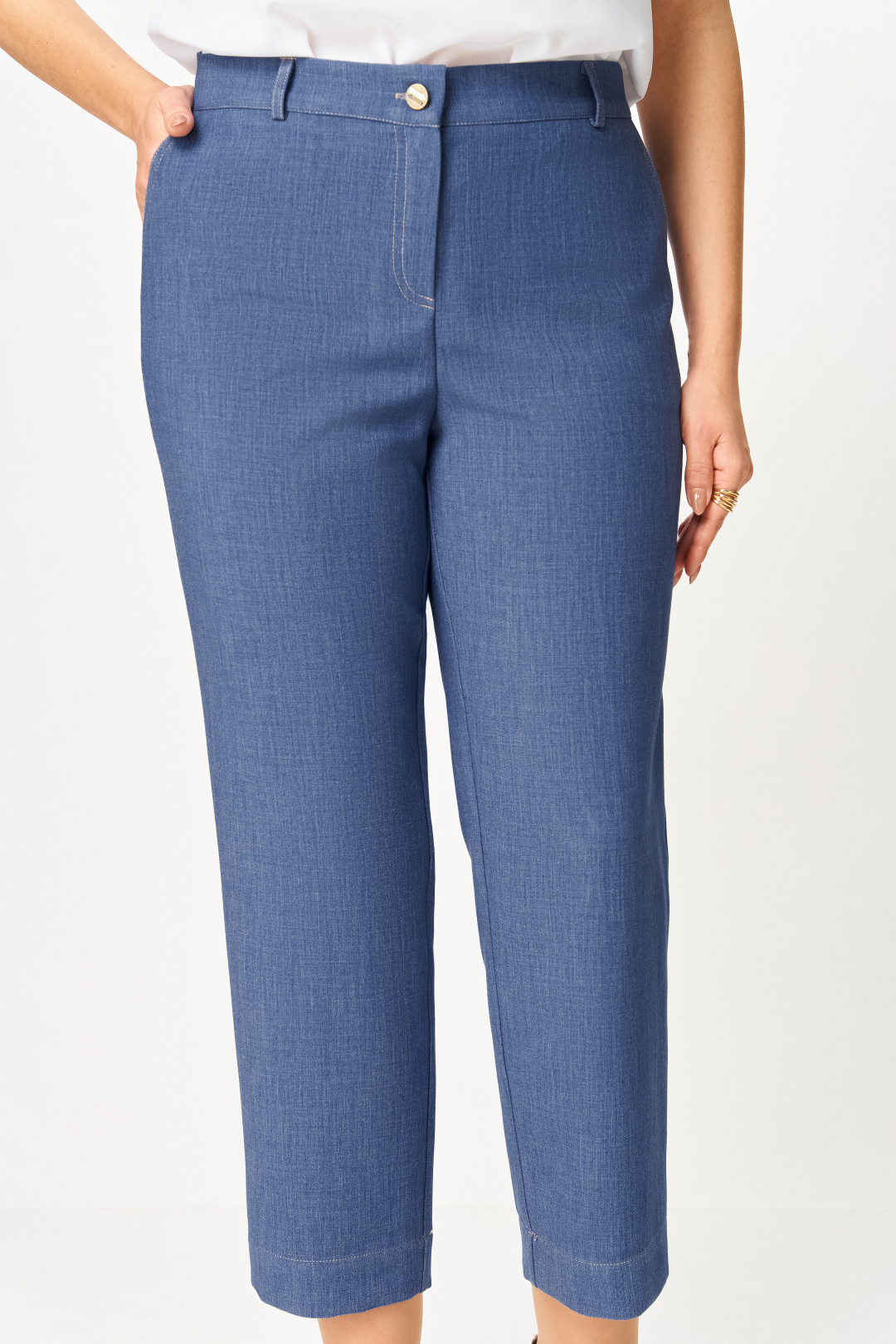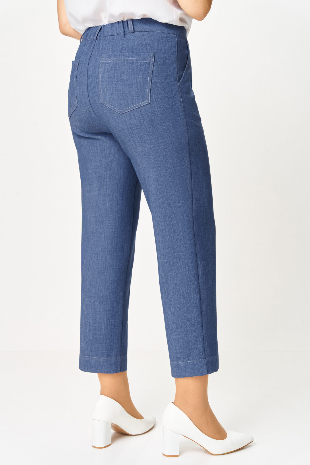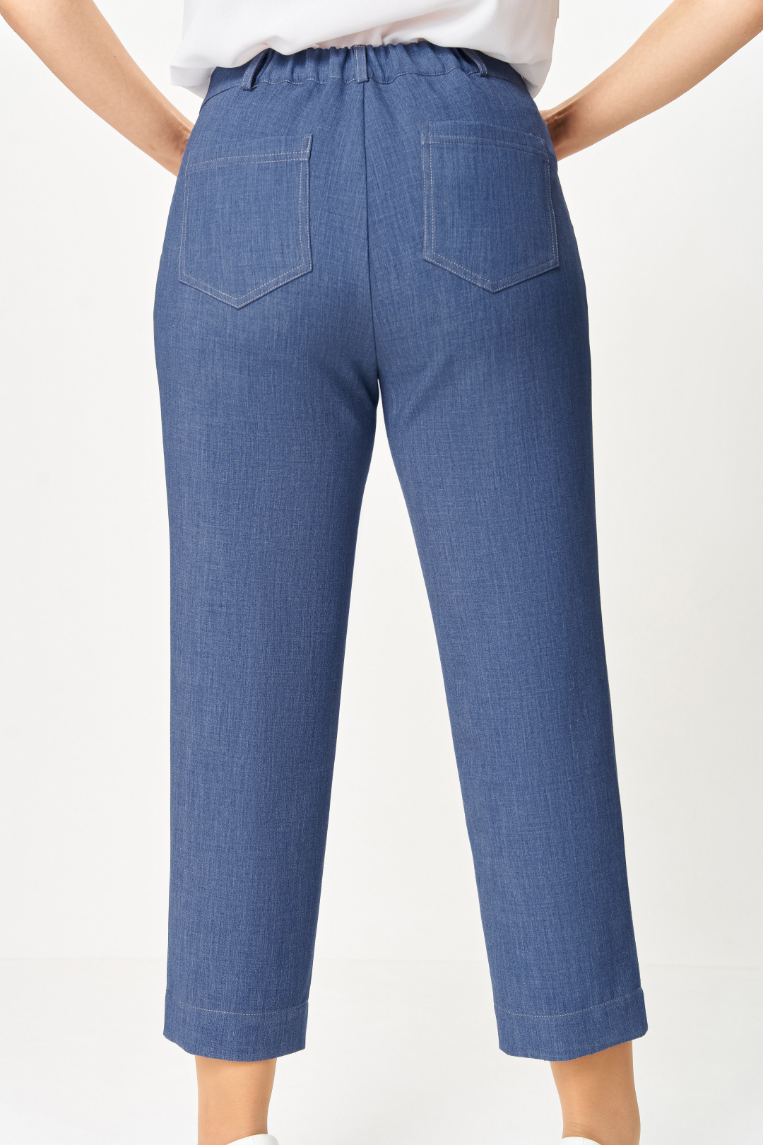 Брюки из мягкой эластичной ткани под джинс, прямого силуэта, заужены к низу. Спереди боковые функциональные карманы, сзади накладные фигурные карманы с двойной контрастной отстрочкой. Пояс притачной с эластичной тесьмой-резинкой по спинке и шлёвками для пояса. Застёжка на тесьму-молнию, петлю и джинсовую пуговицу на поясе.